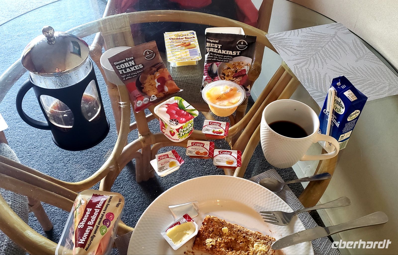 Ich treffe die neun Gäste, welche noch nach Australien fliegen, um 2.45 Uhr in der Hotellobby. Es gibt für alle Frühstück zum Mitnehmen und der Transferbus kommt überpünktlich an. Ich verabschiede die Gäste und lege mich noch ein paar Stunden hin. Dann treffe ich die anderen Gäste beim Frühstück und um 9 Uhr werden die fünf, welche mit mir nach Deutschland fliegen und ich vom Transfer abgeholt. Der Flughafen Christchurch ist nicht sehr groß und bald sind wir eingecheckt und starten unsere Rückreise über Singapur.