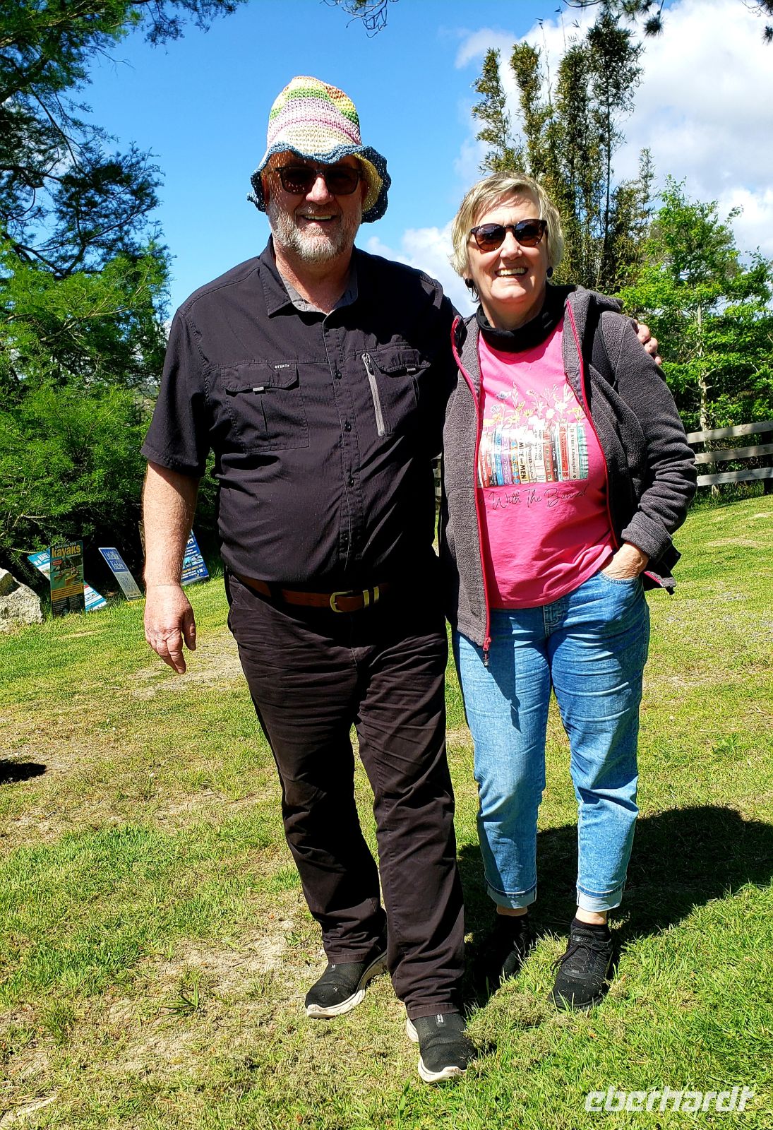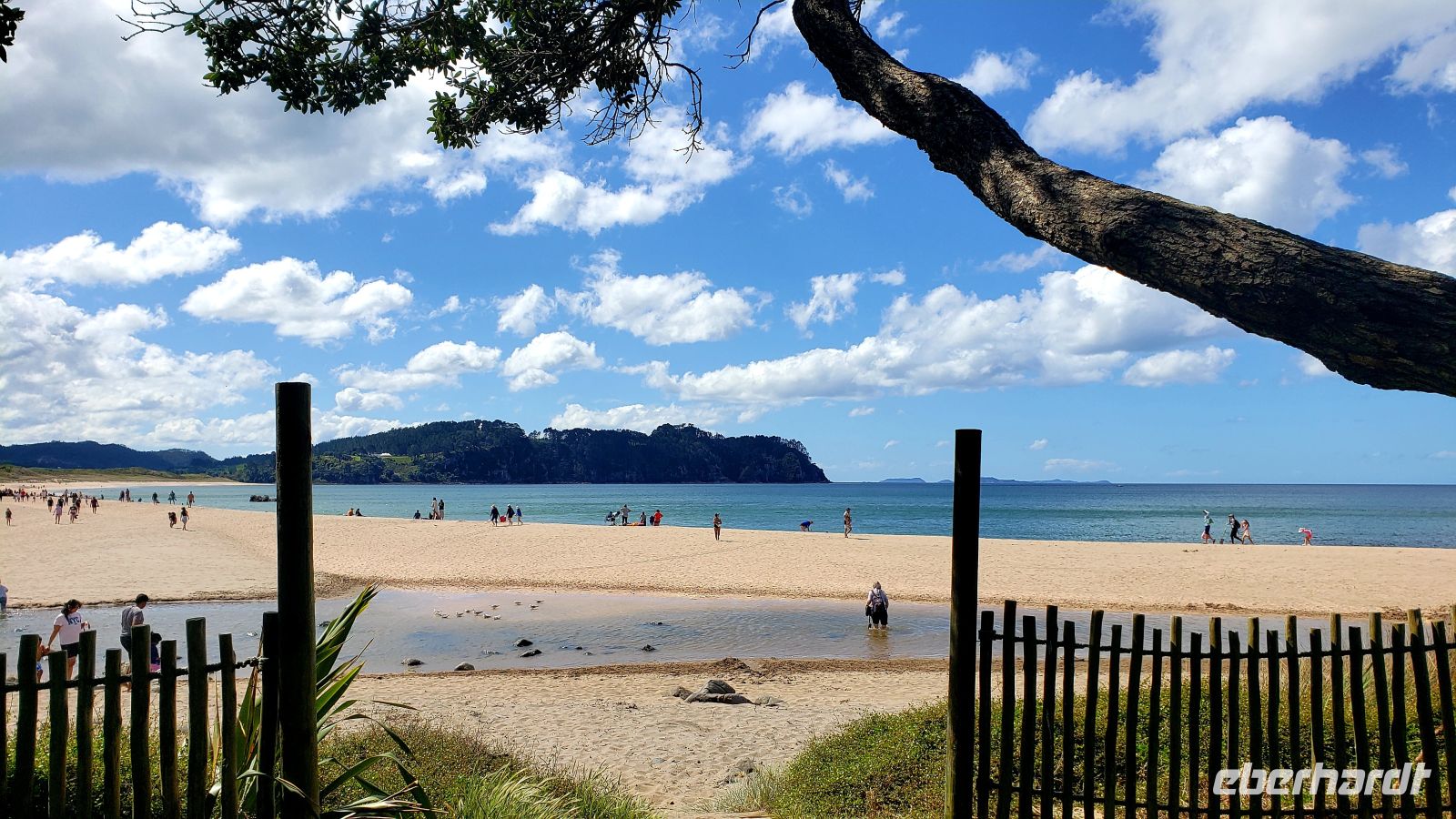 Um 13 Uhr treffen wir uns wieder an dem Eiswagen und die meisten Gäste genießen ein leckeres Softeis, bevor wir wieder zum Bus zurückwandern. Dann geht es weiter zum Hahei Strand, wo es verschiedene kleine Restaurants und Cafés gibt und wir Mittagspause machen. Unser letzter Stopp an diesem Tag ist der Hot Water Beach. Unsere Gäste gehen in Badebekleidung, mit einer Schaufel bewaffnet zum Strand, um sich ein Loch zu buddeln, wo dann eine heiße Wasserquelle entstehen soll zum Hineinlegen. Leider kommt kaum Wasser, man müsste sehr tief buddeln und die einzige Stelle, wo anscheinend Wasser aus der Erde kommt, ist voller Menschen. Wir hatten trotzdem einen wunderschönen Tag und in der Ferienhausanlage lassen die Gäste den Tag individuell ausklingen, einige gehen noch zum Strand in der Nähe, andere in ein Restaurant.