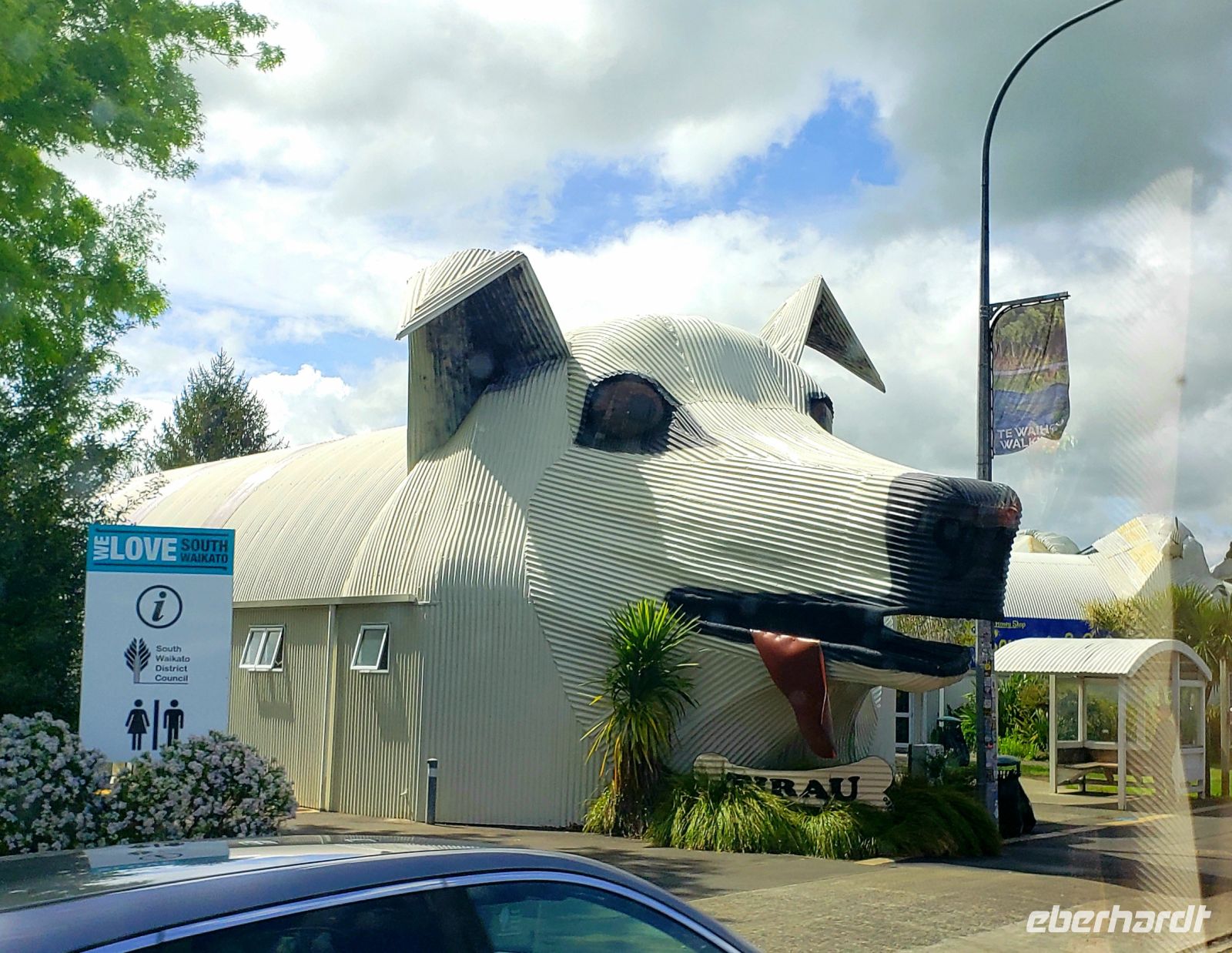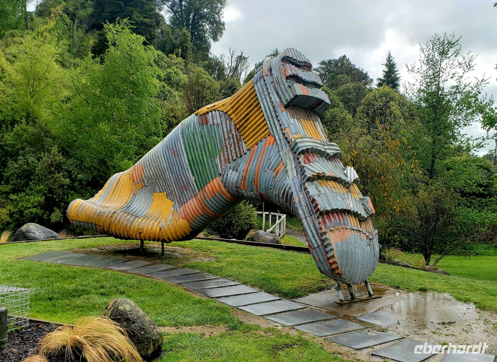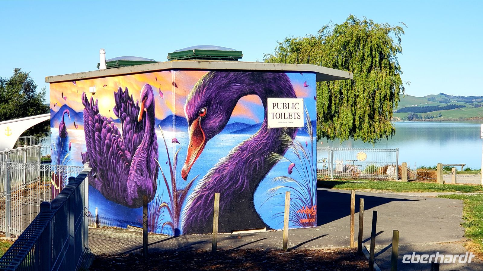 Der nächste Stopp ist etwas fröhlicher, Taihape nennt sich die Gummistiefelweitwurf-Hauptstadt, ein Riesengummistiefel am Ortseingang zeigt, wie ernst es den Bewohnern und Bewohnerinnen des Ortes ist, immerhin ist Gummistiefelweitwurf eine anerkannte Sportart in Neuseeland. Wir testen auch unser Talent, auf einem Rasengelände liegen Gummistiefel an einer Linie bereit und unter Gejuchzte versuchen wir unser Glück. Inzwischen ist die Sonne herausgekommen und wir machen eine Stunde Mittagspause in dem charmanten kleinen Ort Foxton. Hier gibt es eine Holländermühle zu bewundern, verschiedene Cafés und idyllische Wanderwege am Fluss entlang.