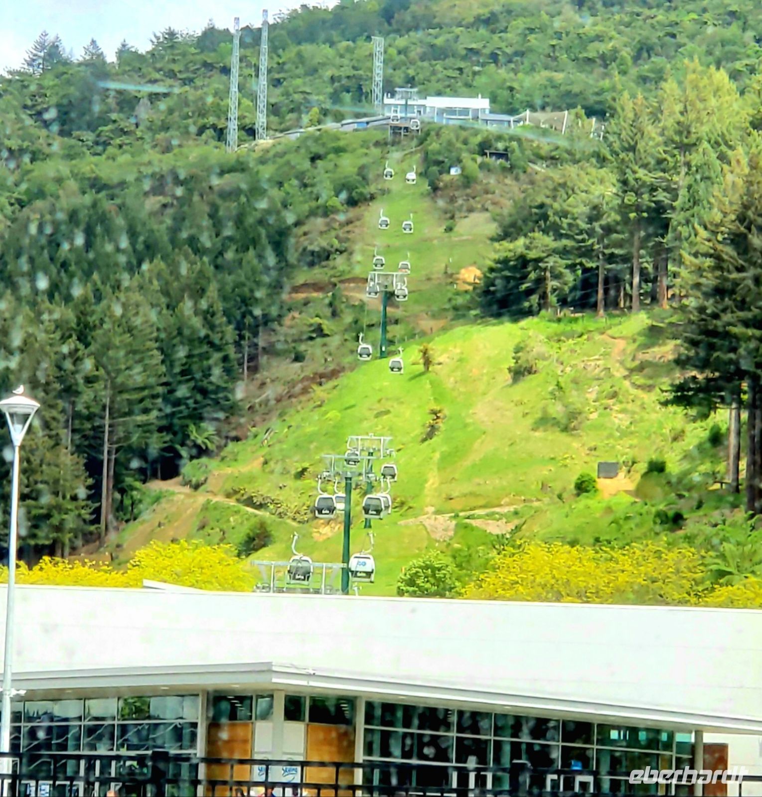 Wir anderen fahren weiter nach Roturoa, wo wir mittags ankommen. Peter macht mit uns eine Stadtrundfahrt zur ersten Orientierung, dann essen wir eine Kleinigkeit in einem Café. Im Hotel müssen wir noch mit dem Check-in warten, da vor uns eine Gruppe erst spät ausgecheckt hat, dafür bekommen wir ein Getränk aufs Haus und sitzen gemütlich in der Bar mit Blick auf die Schwefelquellen des Roturoa Sees. Es hat zu regnen angefangen, also ruhen sich die meisten auf den Zimmern aus. Um 17 Uhr treffen sich sechs Gäste mit Peter und fahren mit der Gondola Seilbahn auf den Aorangi Berg, wo es in einem Panorama Restaurant ein leckeres "All you can eat" Buffet gibt.
