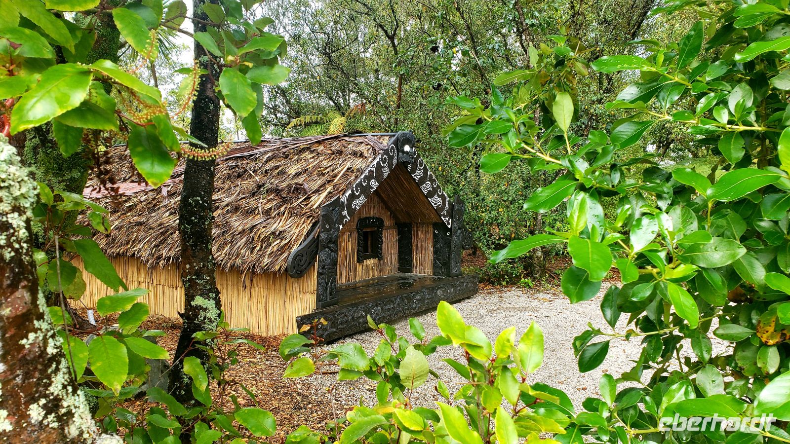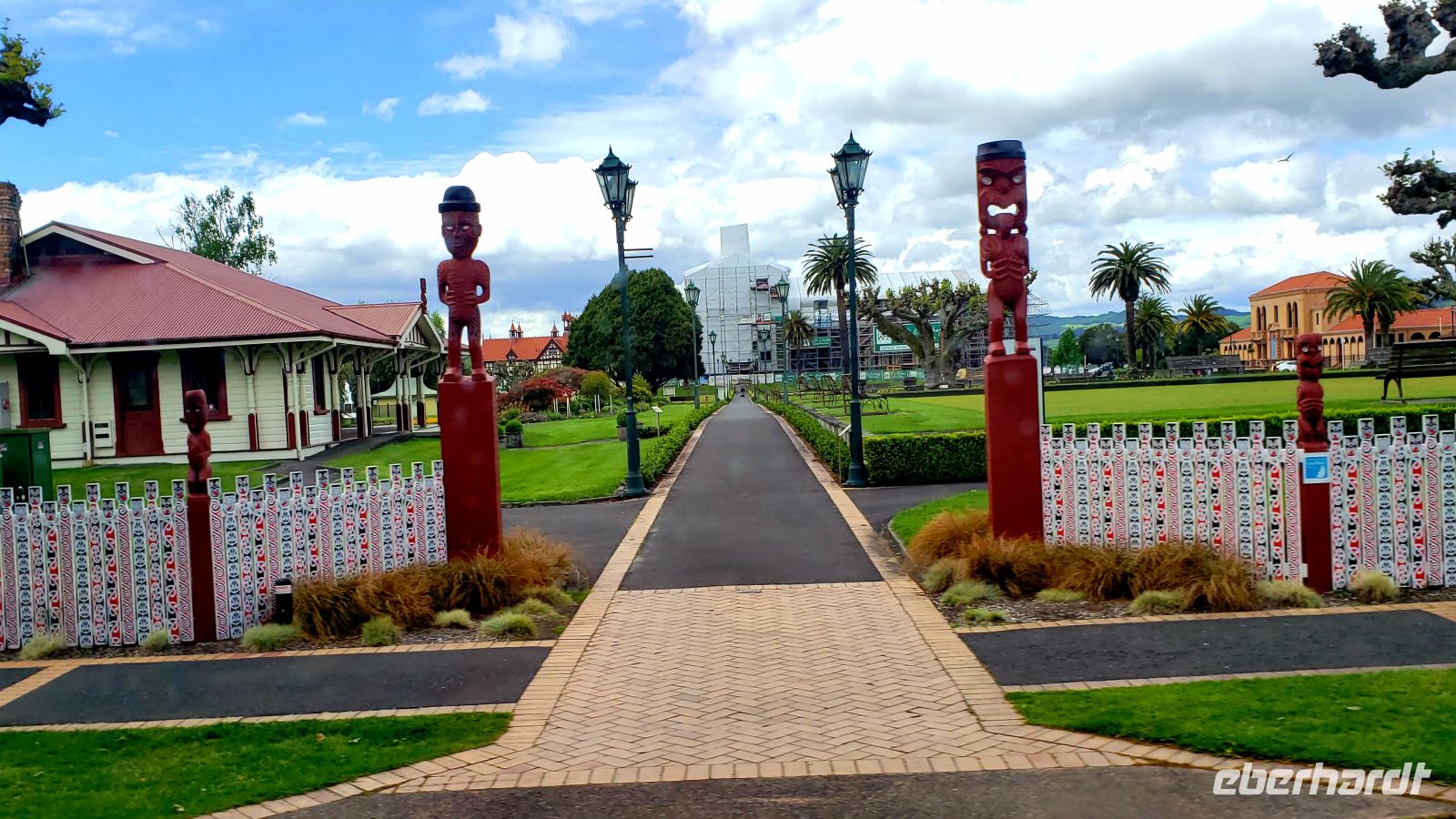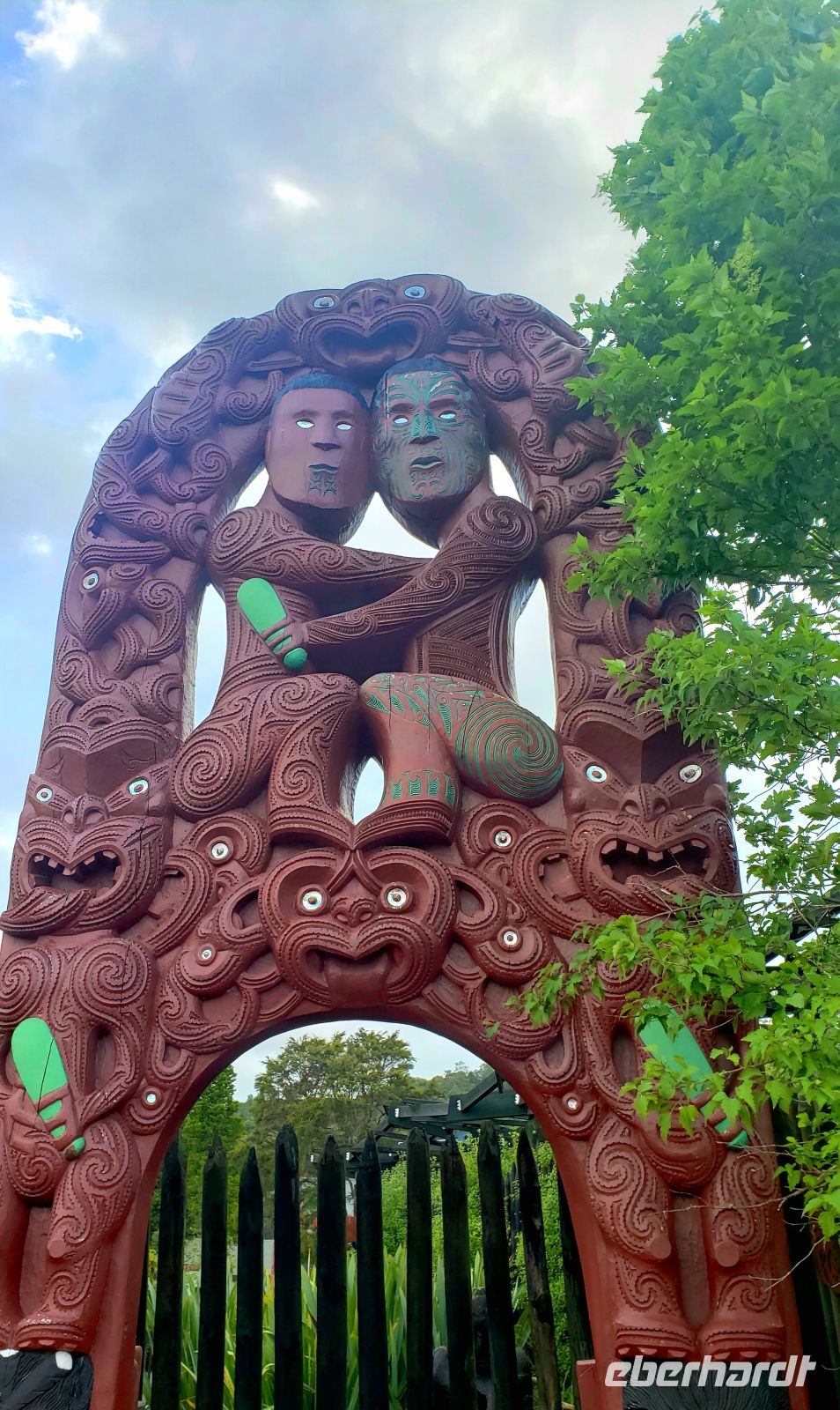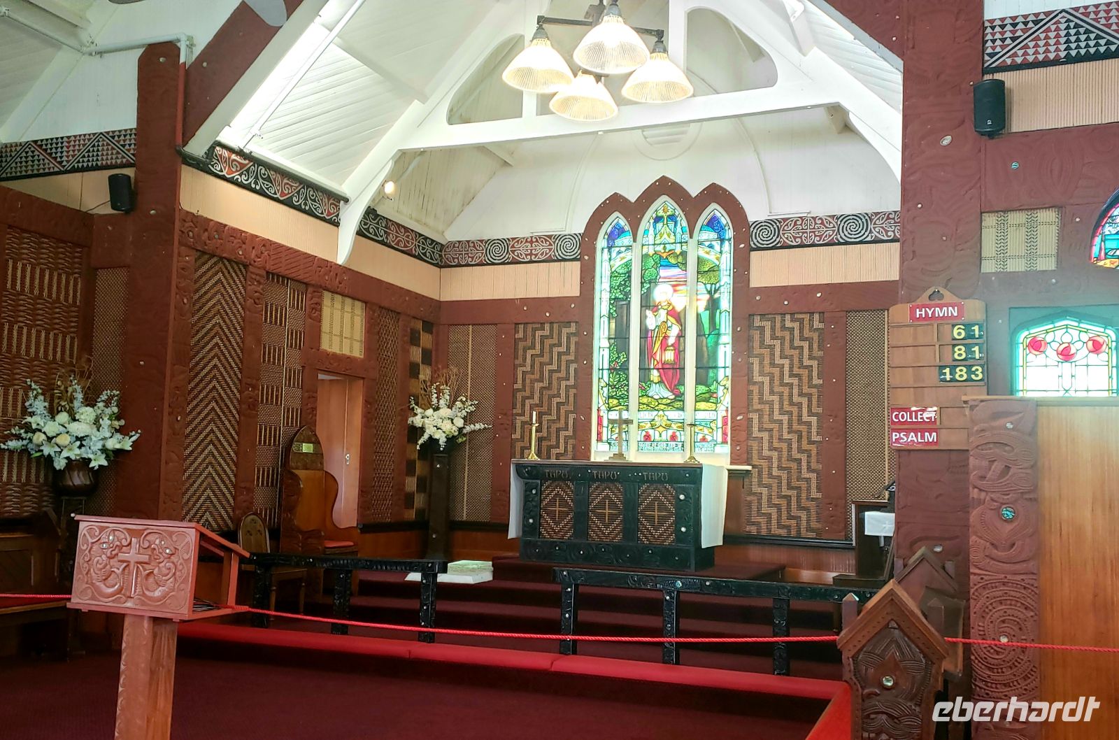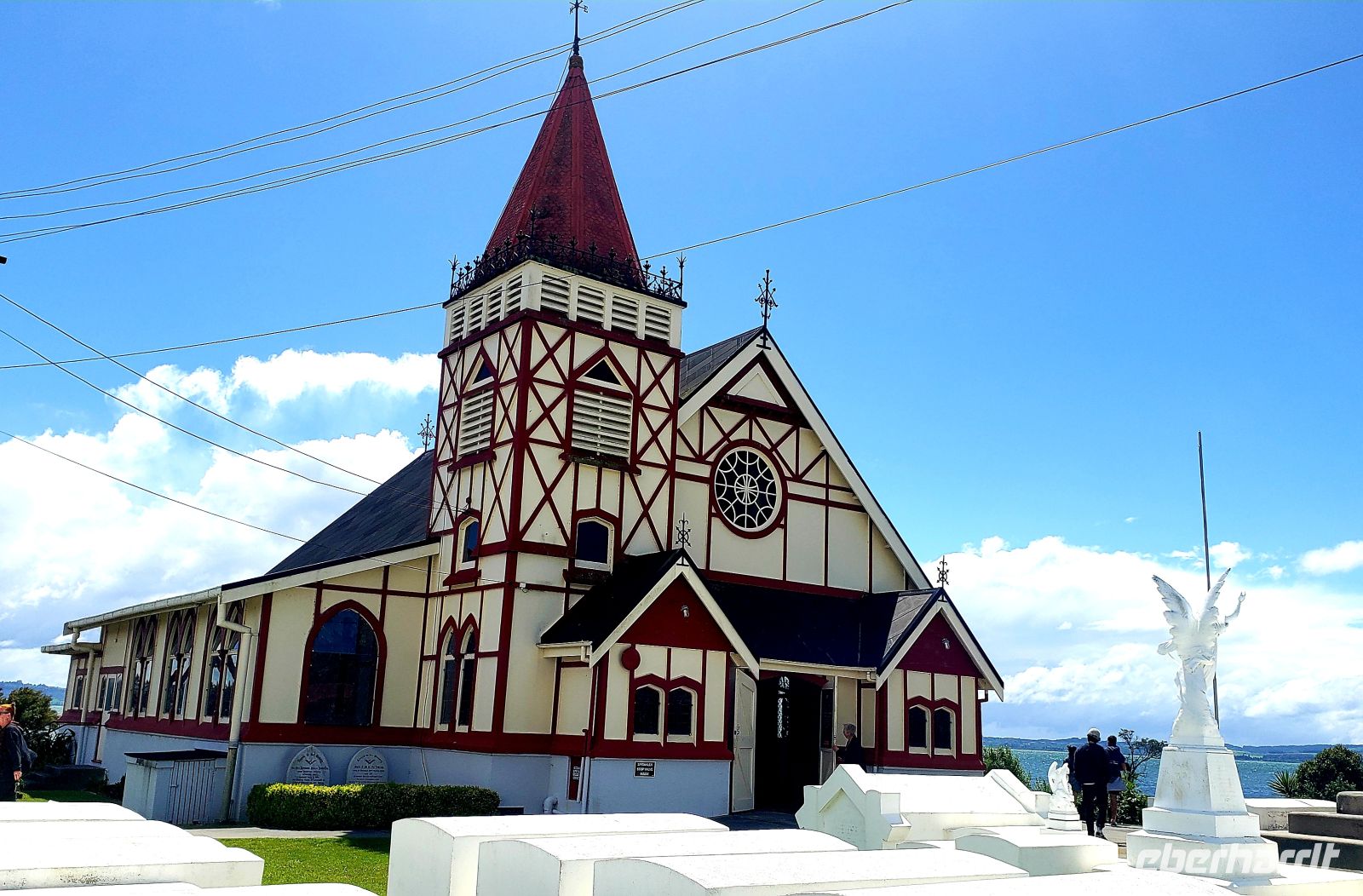 Der nächste Stopp ist eine außerplanmäßige Überraschung, eine sehr alte evangelische Maorikirche, die ein ganz besonderes Fenster hat: ein eingravierter Maori Jesus geht, wenn man rauschaut, über das Wasser des Sees Roturoa. Wir haben Glück, eine deutsche Frau ist dort ehrenamtlich tätig und so bekommen wir einen kurzen Vortrag über die Geschichte der Kirche und der Bedeutung der Fensterbilder. Die Kirche heißt St. Faith's Church und ist eher ein Geheimtipp.
