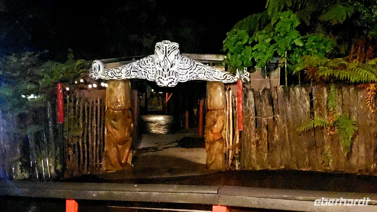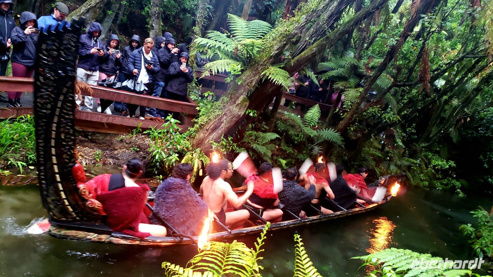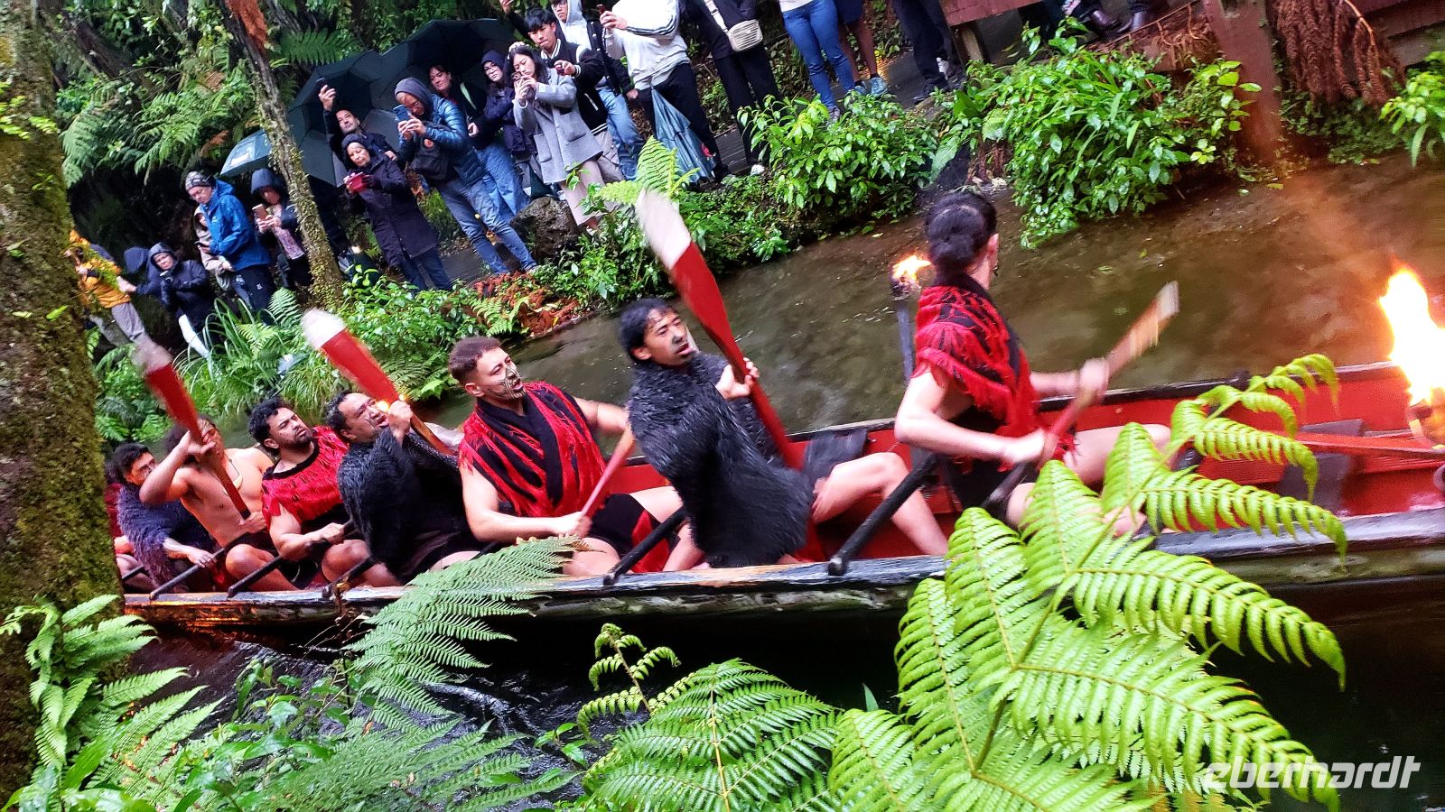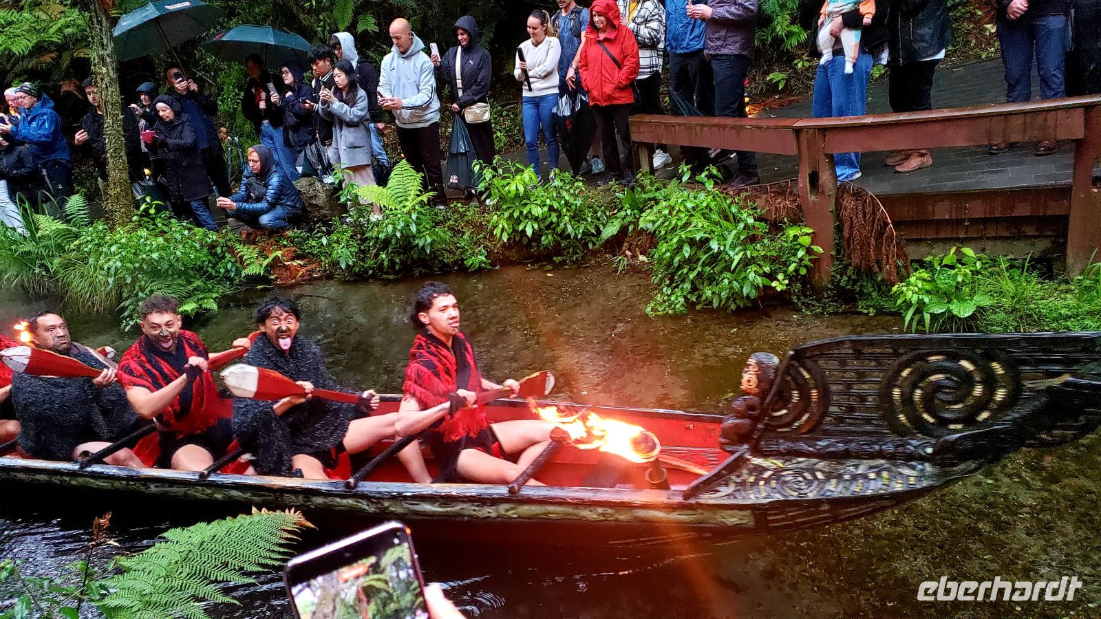 Die anderen acht Gäste und ich werden um 17.45 Uhr abgeholt und es geht ins Maori Dorf zum Hangi Essen und kulturellen Vorführungen. Obwohl uns gesagt wurde, dass es sehr touristisch ist, gefällt es uns super. Es gibt viele Erläuterungen zum Leben der Maori und wir sehen ein Kanu mit Kriegern auf dem Fluss. In einem großen Erdloch mit heißen Steinen können wir schon sehen, wie unser Essen zubereitet wird. Dann geht es in eine Halle, wo ein kleines Maori Dorf mit Holzhütten nachgebaut steht. Mit echten Lagerfeuern um uns herum können wir verschiedene Tänze und Gesänge bewundern, moderiert von einem jungen Maori, der uns auch häufig zum Lachen bringt. Leider ist alles auf Englisch und ich kann nicht parallel übersetzen und nur später eine Zusammenfassung an meine Gäste geben.