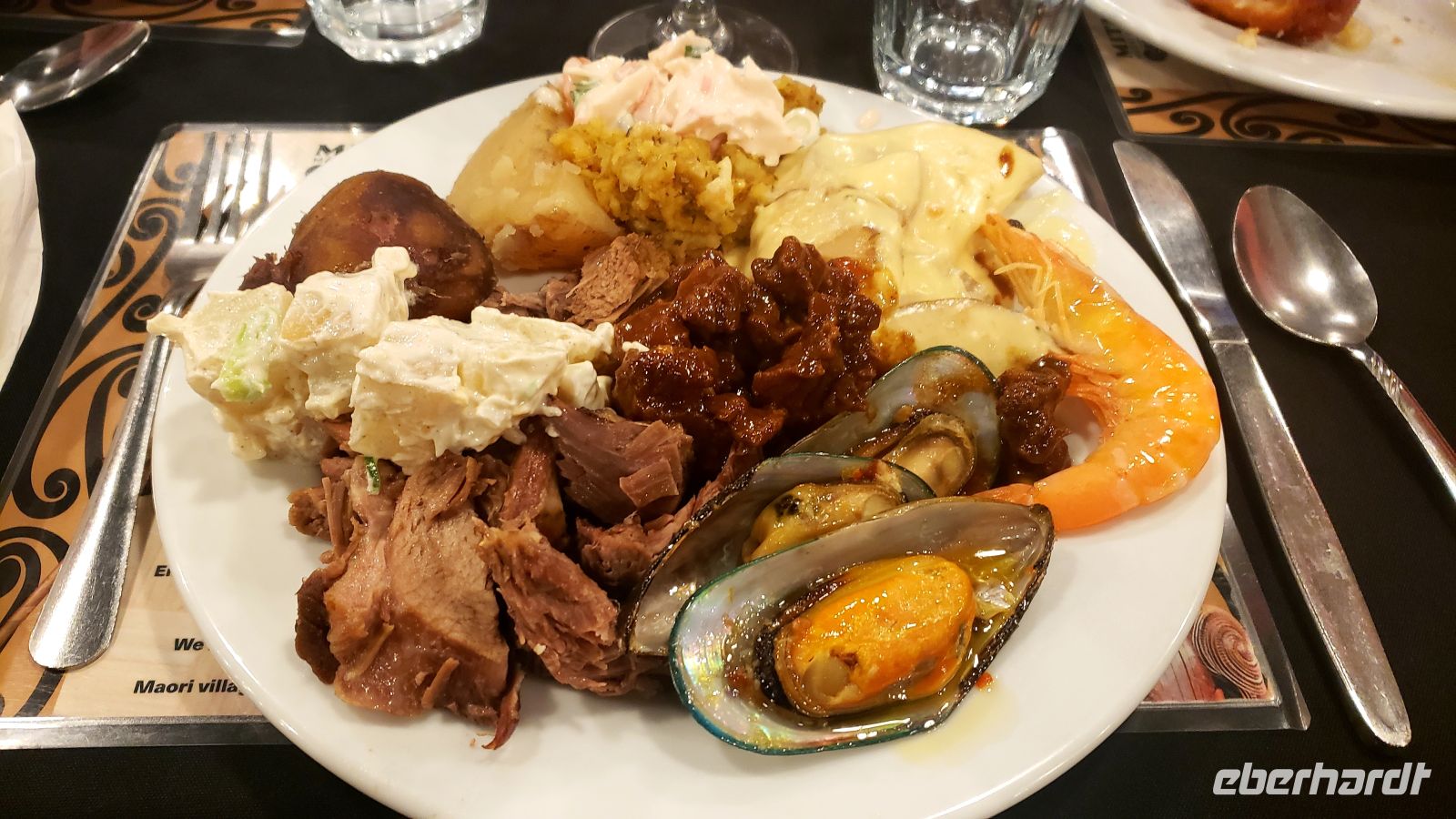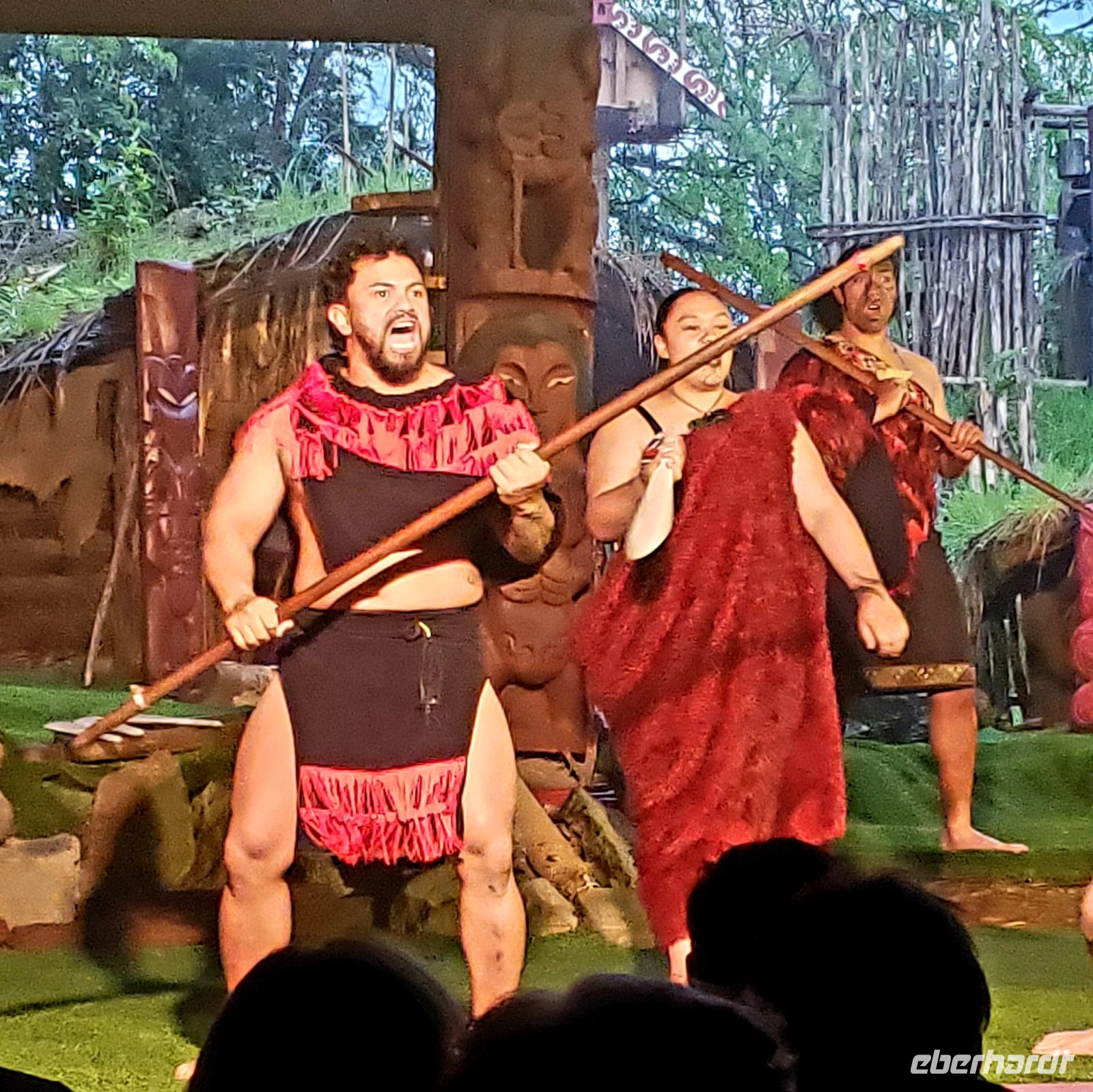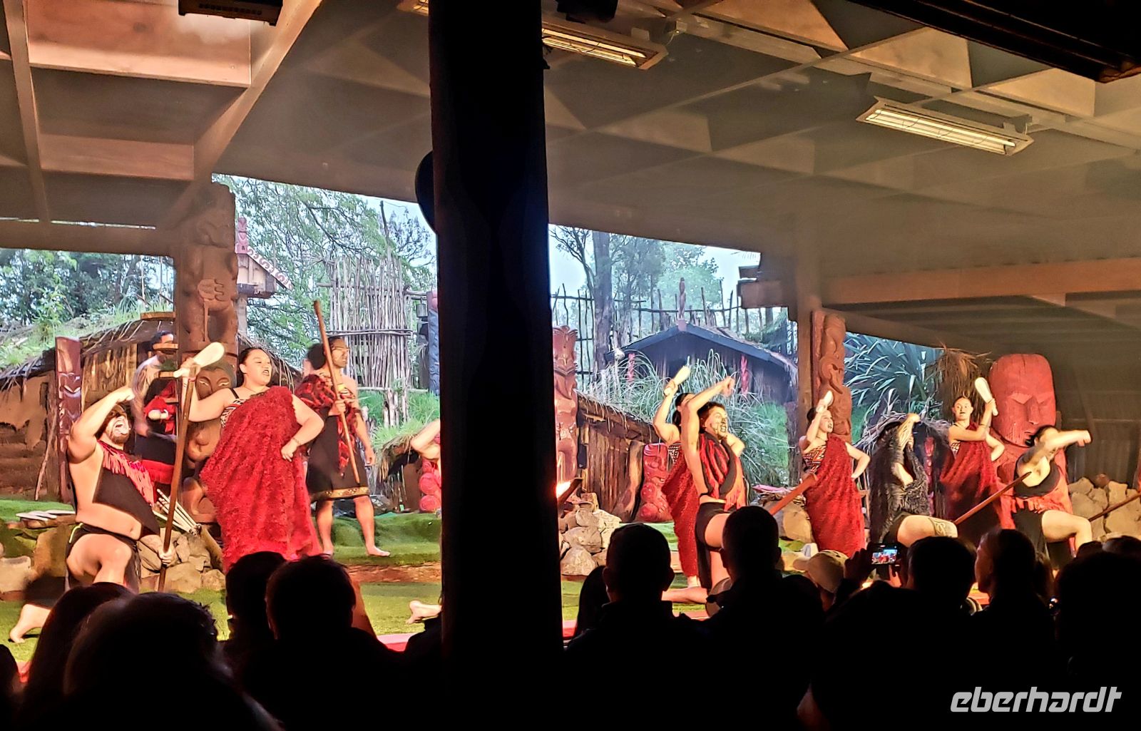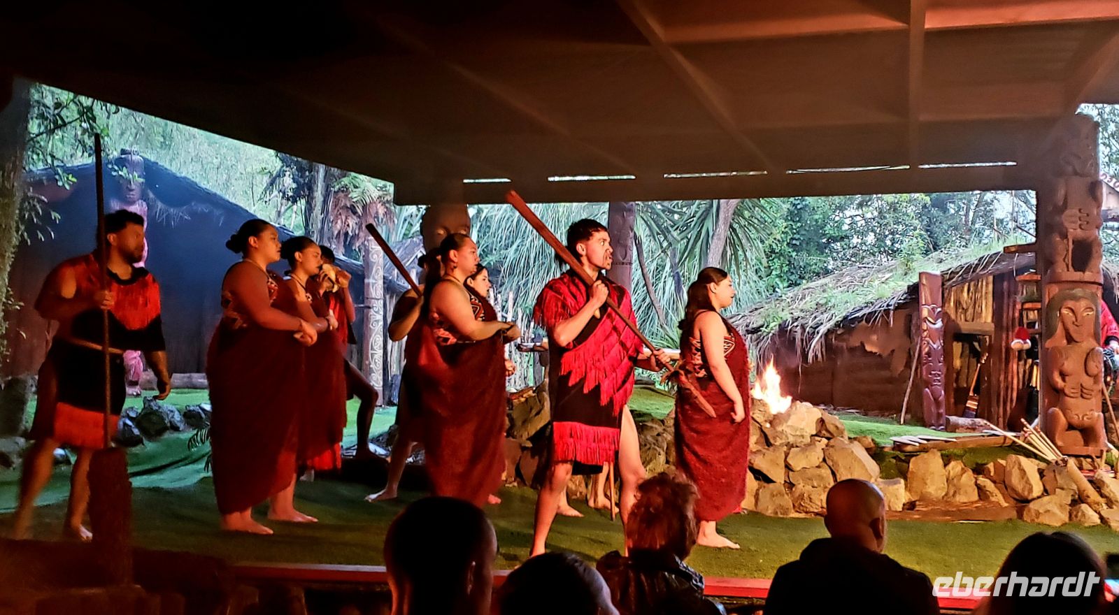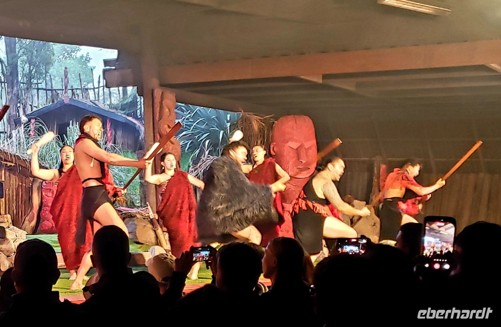 Die anderen acht Gäste und ich werden um 17.45 Uhr abgeholt und es geht ins Maori Dorf zum Hangi Essen und kulturellen Vorführungen. Obwohl uns gesagt wurde, dass es sehr touristisch ist, gefällt es uns super. Es gibt viele Erläuterungen zum Leben der Maori und wir sehen ein Kanu mit Kriegern auf dem Fluss. In einem großen Erdloch mit heißen Steinen können wir schon sehen, wie unser Essen zubereitet wird. Dann geht es in eine Halle, wo ein kleines Maori Dorf mit Holzhütten nachgebaut steht. Mit echten Lagerfeuern um uns herum können wir verschiedene Tänze und Gesänge bewundern, moderiert von einem jungen Maori, der uns auch häufig zum Lachen bringt. Leider ist alles auf Englisch und ich kann nicht parallel übersetzen und nur später eine Zusammenfassung an meine Gäste geben.