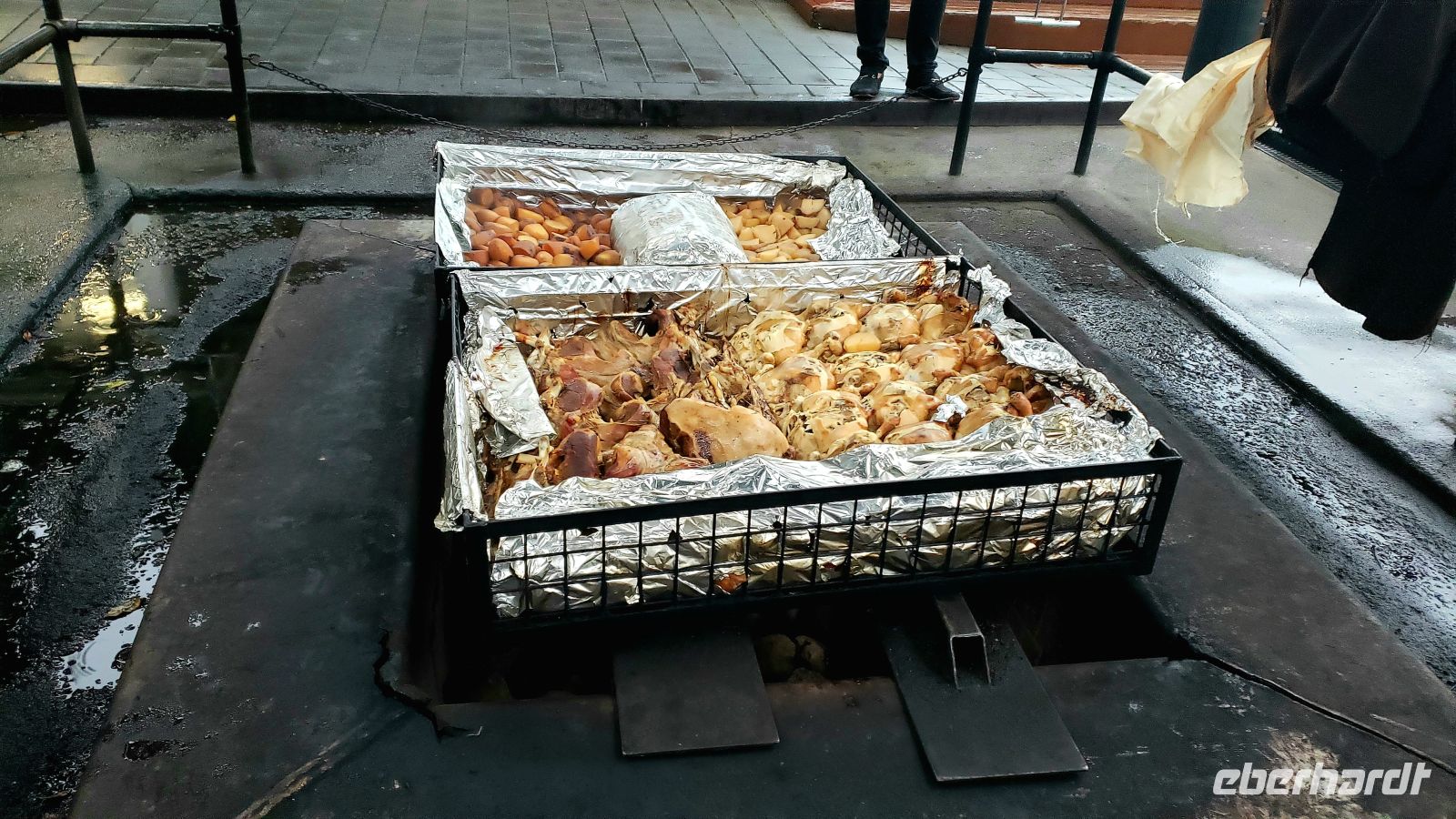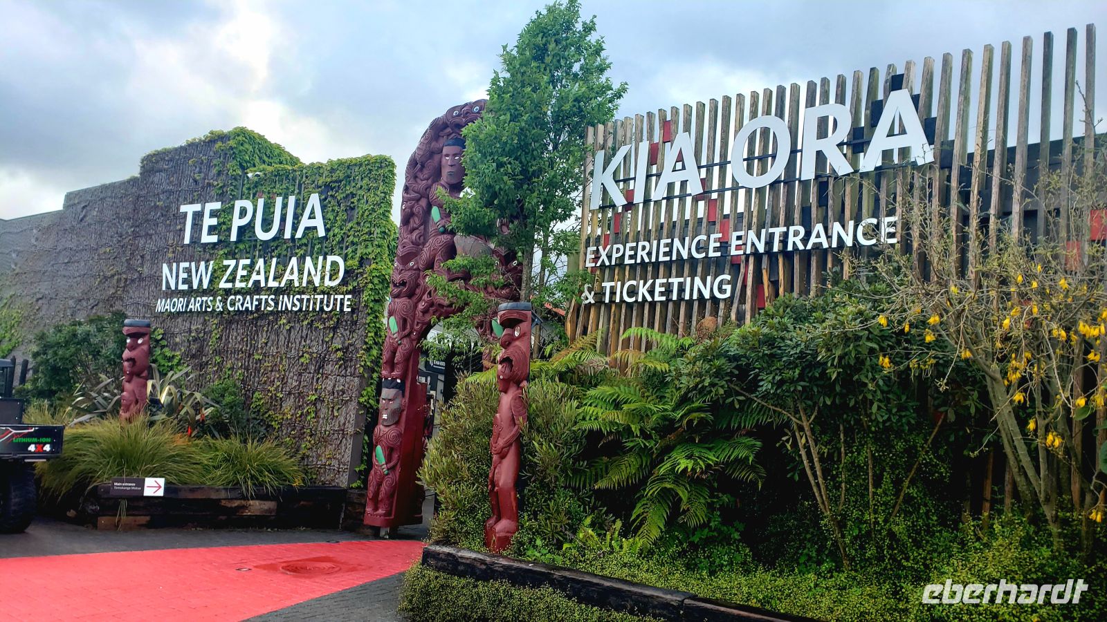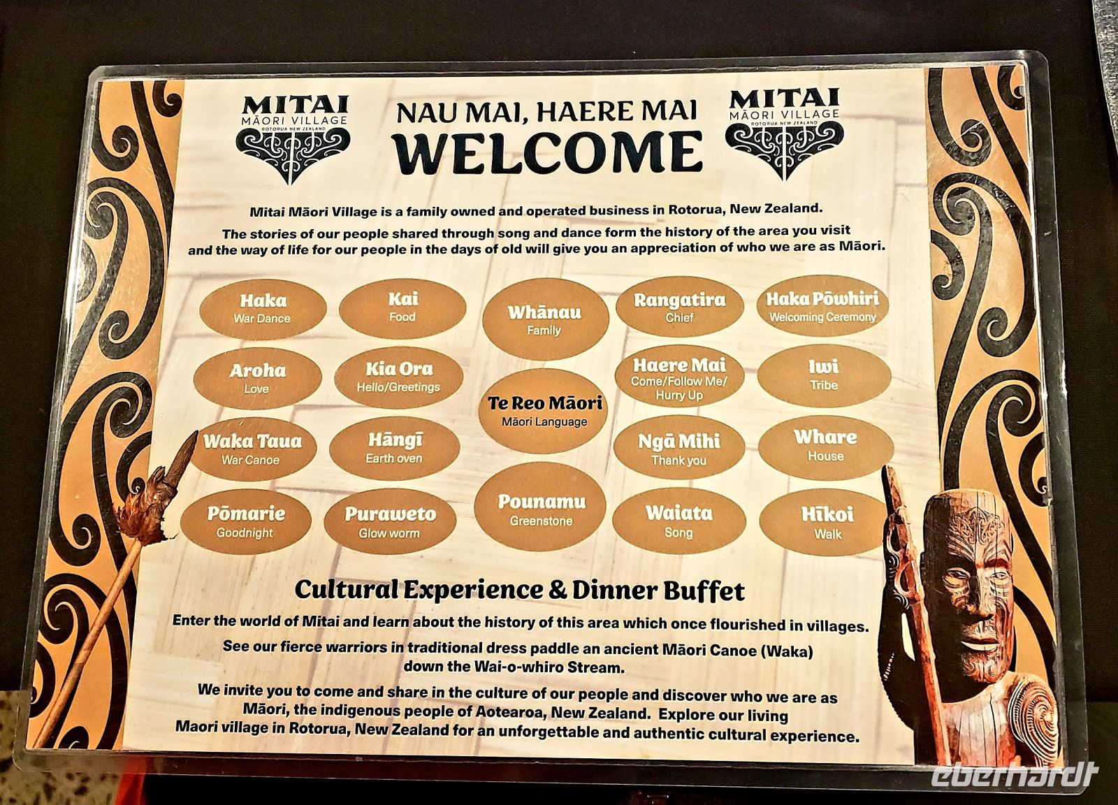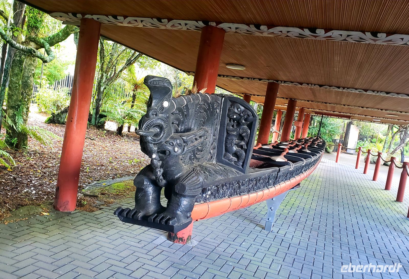 Die anderen acht Gäste und ich werden um 17.45 Uhr abgeholt und es geht ins Maori Dorf zum Hangi Essen und kulturellen Vorführungen. Obwohl uns gesagt wurde, dass es sehr touristisch ist, gefällt es uns super. Es gibt viele Erläuterungen zum Leben der Maori und wir sehen ein Kanu mit Kriegern auf dem Fluss. In einem großen Erdloch mit heißen Steinen können wir schon sehen, wie unser Essen zubereitet wird. Dann geht es in eine Halle, wo ein kleines Maori Dorf mit Holzhütten nachgebaut steht. Mit echten Lagerfeuern um uns herum können wir verschiedene Tänze und Gesänge bewundern, moderiert von einem jungen Maori, der uns auch häufig zum Lachen bringt. Leider ist alles auf Englisch und ich kann nicht parallel übersetzen und nur später eine Zusammenfassung an meine Gäste geben.