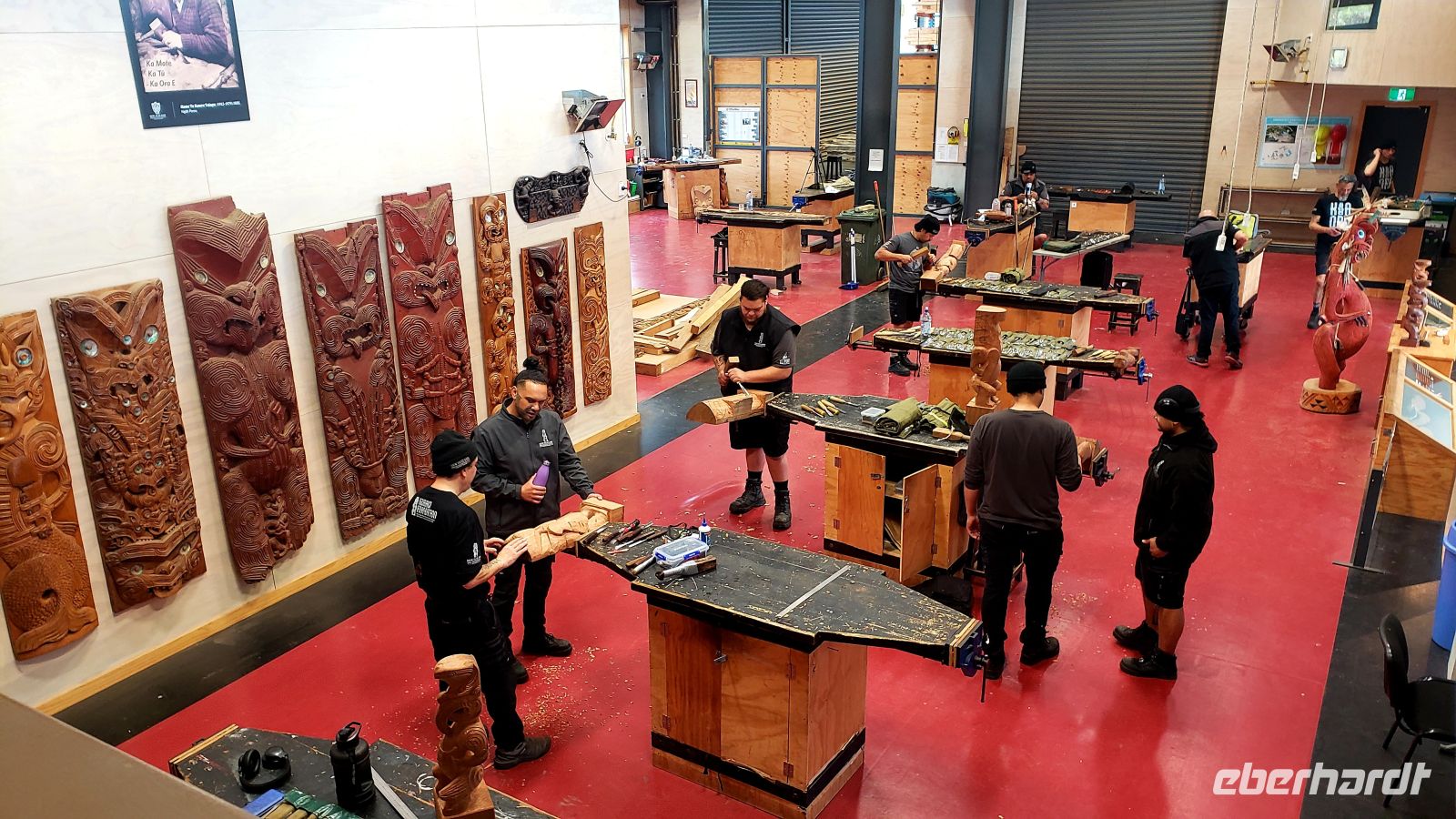 Dann geht es weiter zu den Wairakei Thermal Terrassen, leider regnet es gerade stark, als wir die Führung über das Gelände machen und so kürzen wir etwas ab und gehen direkt in einen Versammlungsraum, wo uns eine Maori mit Namen Mariana zu Kaffee und Kuchen einlädt. Wir dürfen Fragen zum Leben der Maori stellen, sie beantwortet alles und erzählt viel Interessantes. Sie singt auch typische Lieder und wir lauschen ergriffen. Der Besuch hat allen Gästen außerordentlich gut gefallen. Vorher haben wir noch kurz in eine Halle geschaut, wo die langen Kanus der Maori gebaut werden. Es regnet immer noch stark, aber wir stoppen trotzdem kurz an dem eindrucksvollen Huka Wasserfall. Weiter geht es Richtung Süden entlang des großen Taupo Sees.