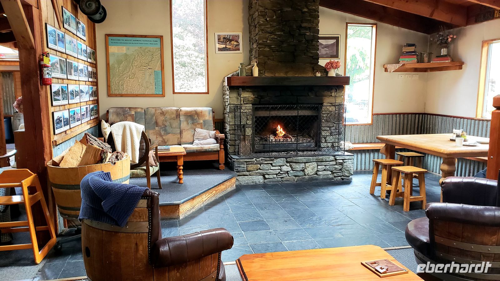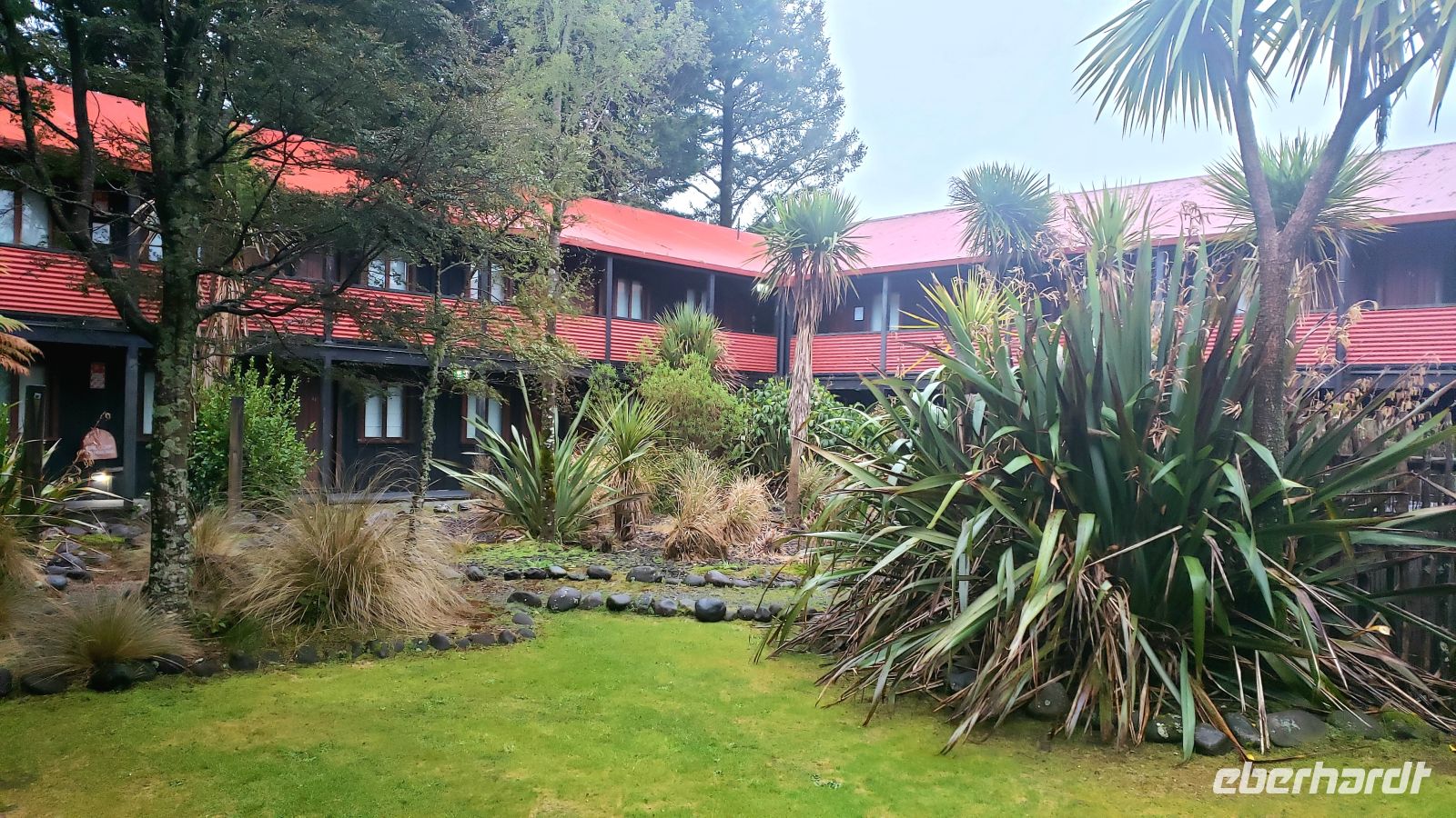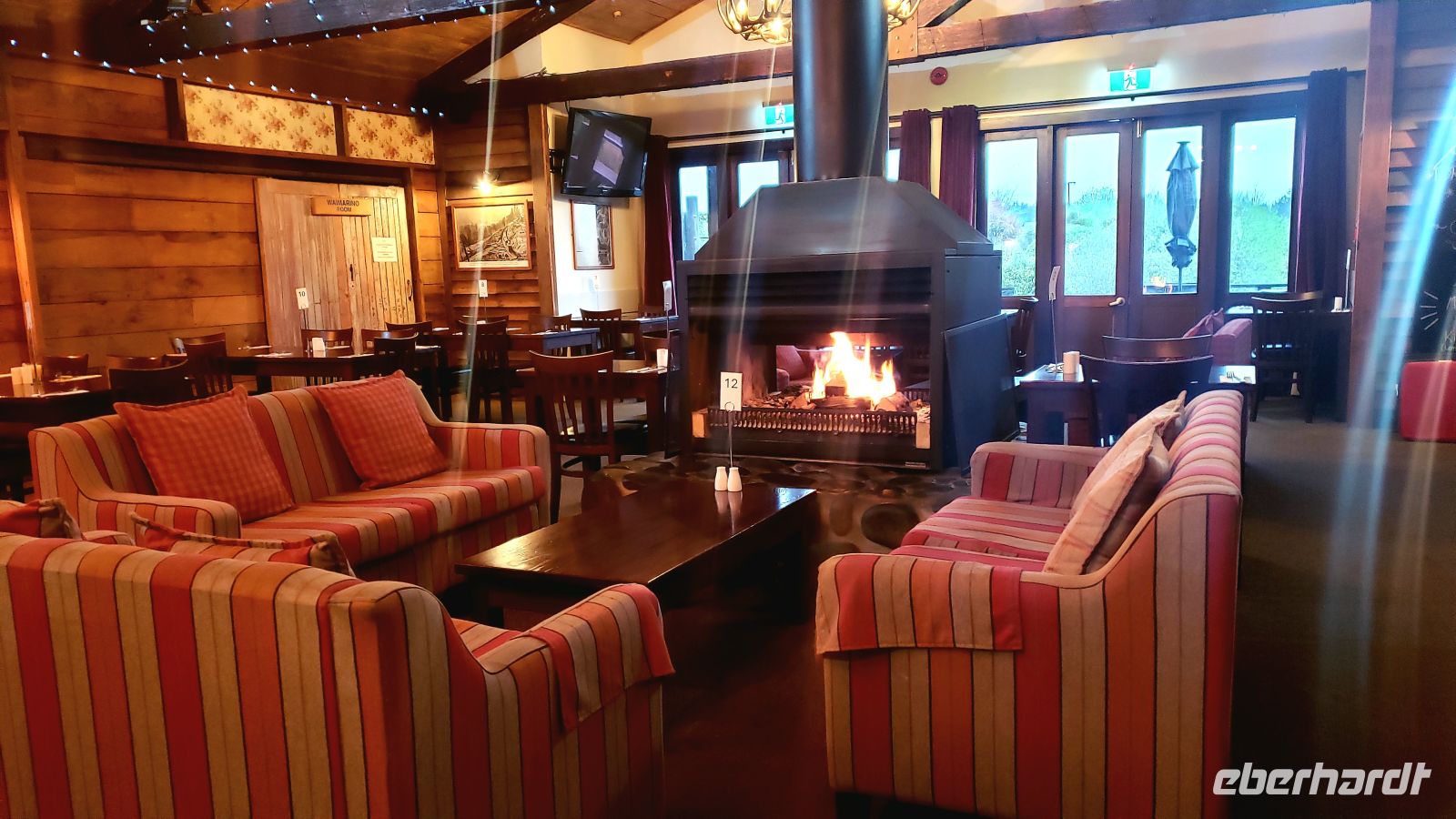 Um 18 Uhr checken wir mit feuchten Klamotten und etwas fröstelnd im Hotel in Ruapehu ein. Das Hotel liegt in den Bergen, es ist sehr gemütlich, und uns erwartet ein leckeres 3-Gänge Menu im Restaurant, wo ein Kaminfeuer lodert. Die Zimmer sind etwas klein, aber sehr schön und es wurde schon vorab eingeheizt. Der Regen geht in Schneeregen über, Neuseeland hat wirklich alle Klimazonen zu bieten! Unsere Betten haben sogar beheizte Matratzen-Auflagen und so gehen wir alle zufrieden schlafen.