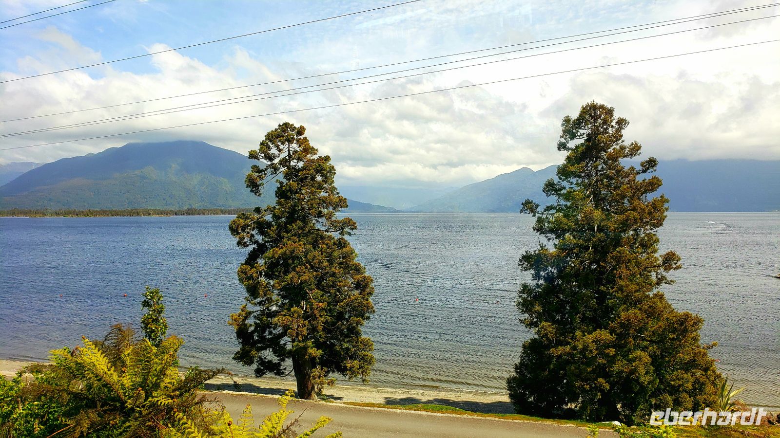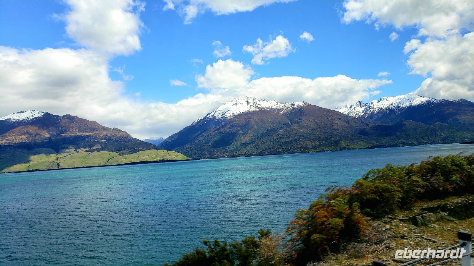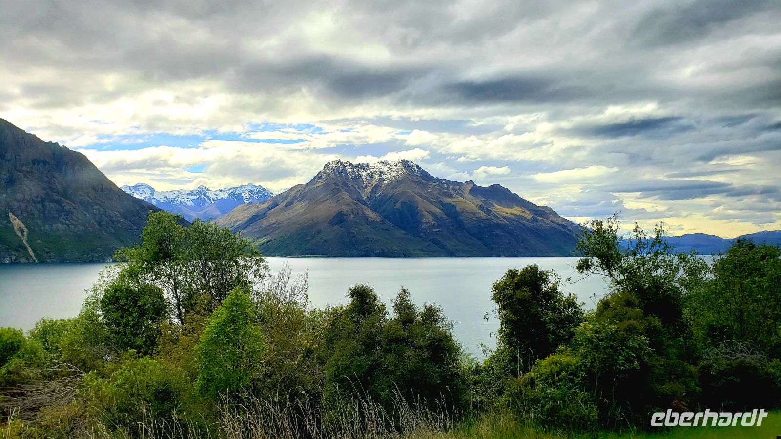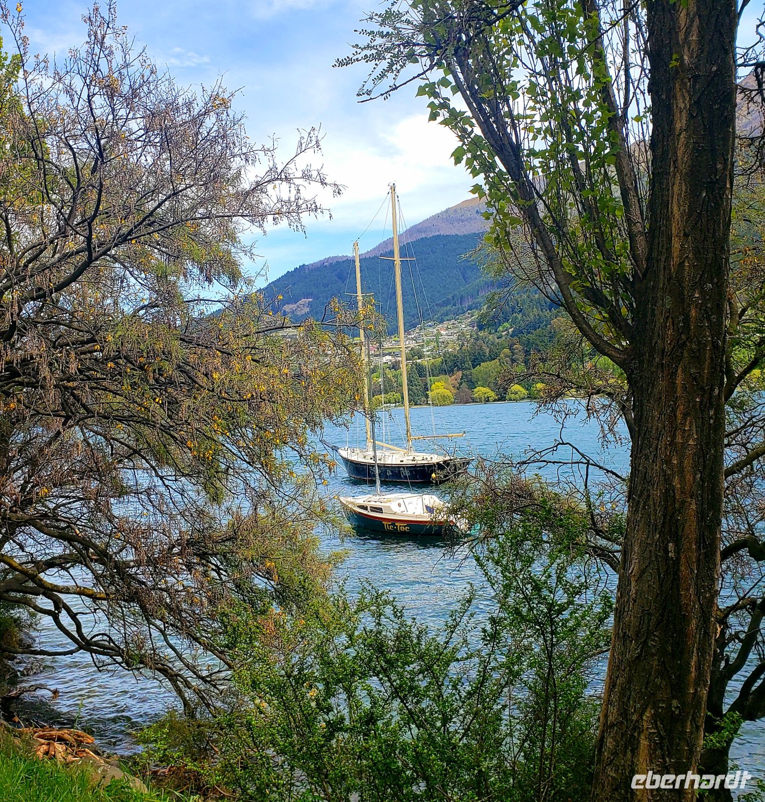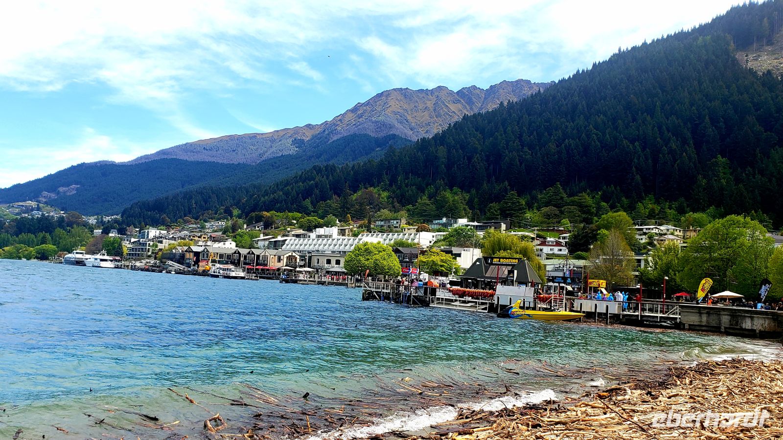 Ab 6.45 Uhr gibt es schon ein leckeres Frühstück an Bord, drinnen ist es auch schön kuschelig, draußen hingegen regnet und windet es. Da hatten wir gestern doch richtig Glück mit unseren Aktivitäten! Trotzdem ist es schön, durch die Fjorde zu schippern, wir fahren bis zur Tasmanischen See und dann geht es langsam wieder zurück in den Hafen. Wir verlassen den wunderschönen Motorsegler und fahren entspannt mit dem Bus Richtung Queenstown. Unterwegs machen wir diverse Fotostopps. Das Wetter klart auf und es wird immer sonniger. Mittagspause machen wir wieder in Te Anau. Wer auf dem Hinweg zu den Fjorden noch keine der berühmten Fleischpasteten probiert hat, macht es jetzt. Dann geht es nach Queenstown, wo wir am späten Nachmittag bei schönstem Sonnenschein eintreffen. Unser Hotel scheint wie ein Labyrinth, aber man findet sich schnell zurecht. Alle unsere Gäste haben eine große Ferienwohnung mit eigener Waschmaschine! Das schätzen besonders diejenigen, die noch nach Australien weiterreisen werden. Wir bleiben hier zwei Nächte, das Abendessen ist exzellent, ich habe Rib Eye Steak gewählt und Lemon Pie als Dessert. Yummy! Nach dem Essen sitzen wir noch im Barbereich und besprechen die Aktivitäten für den nächsten Tag.