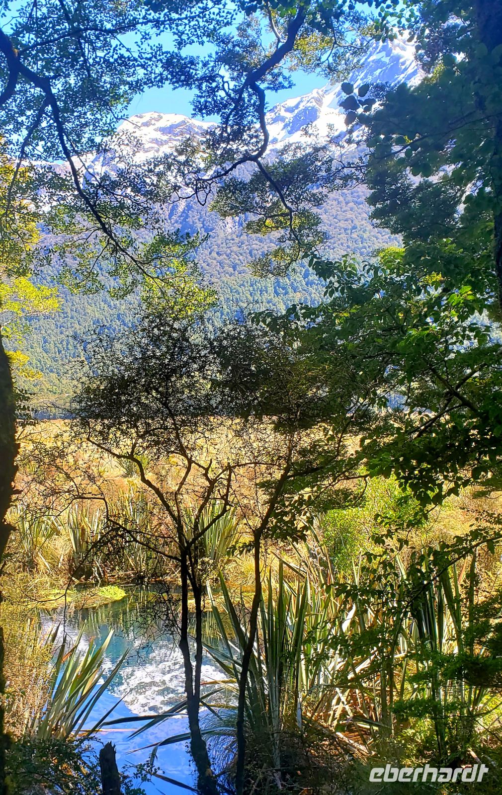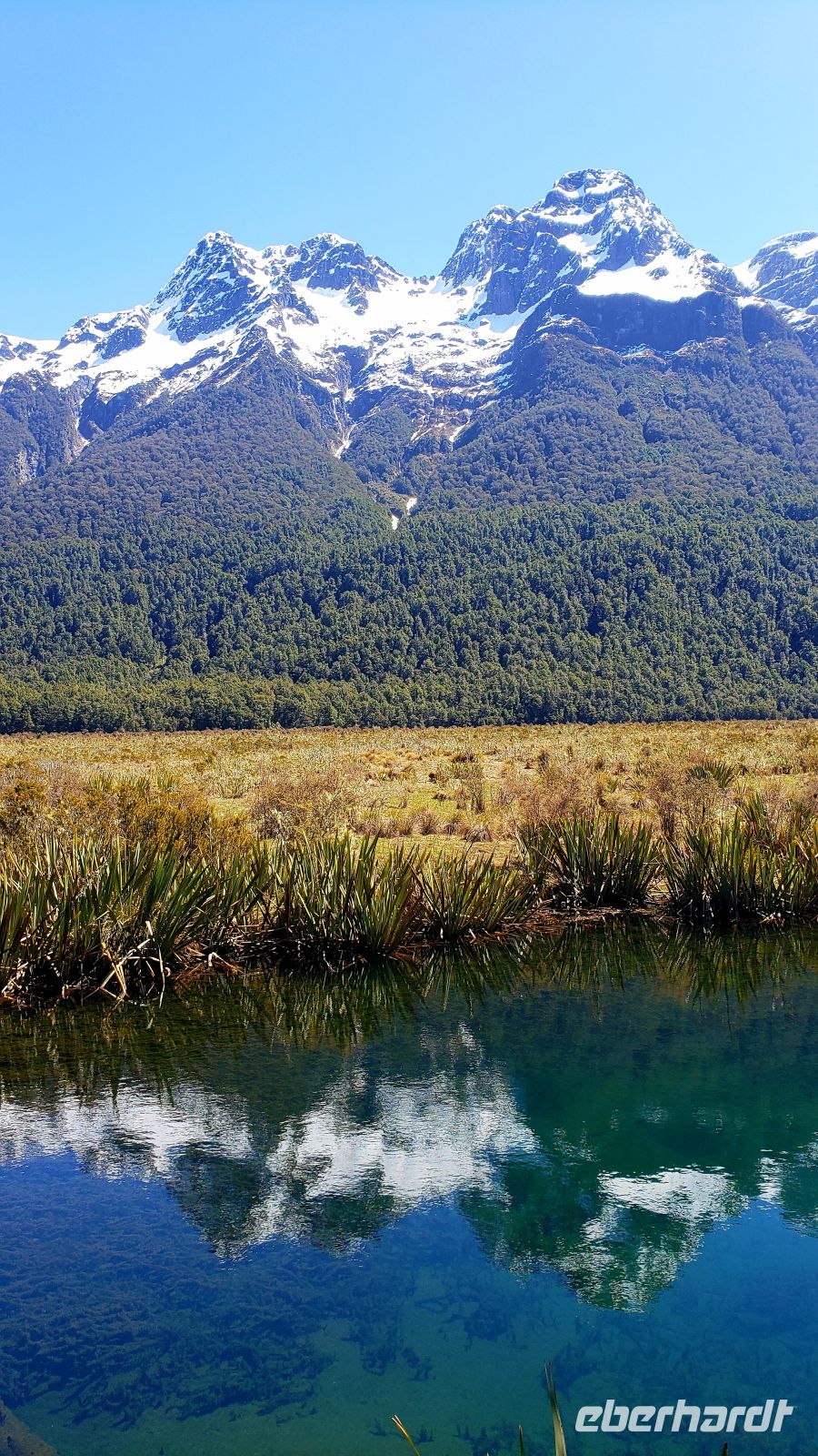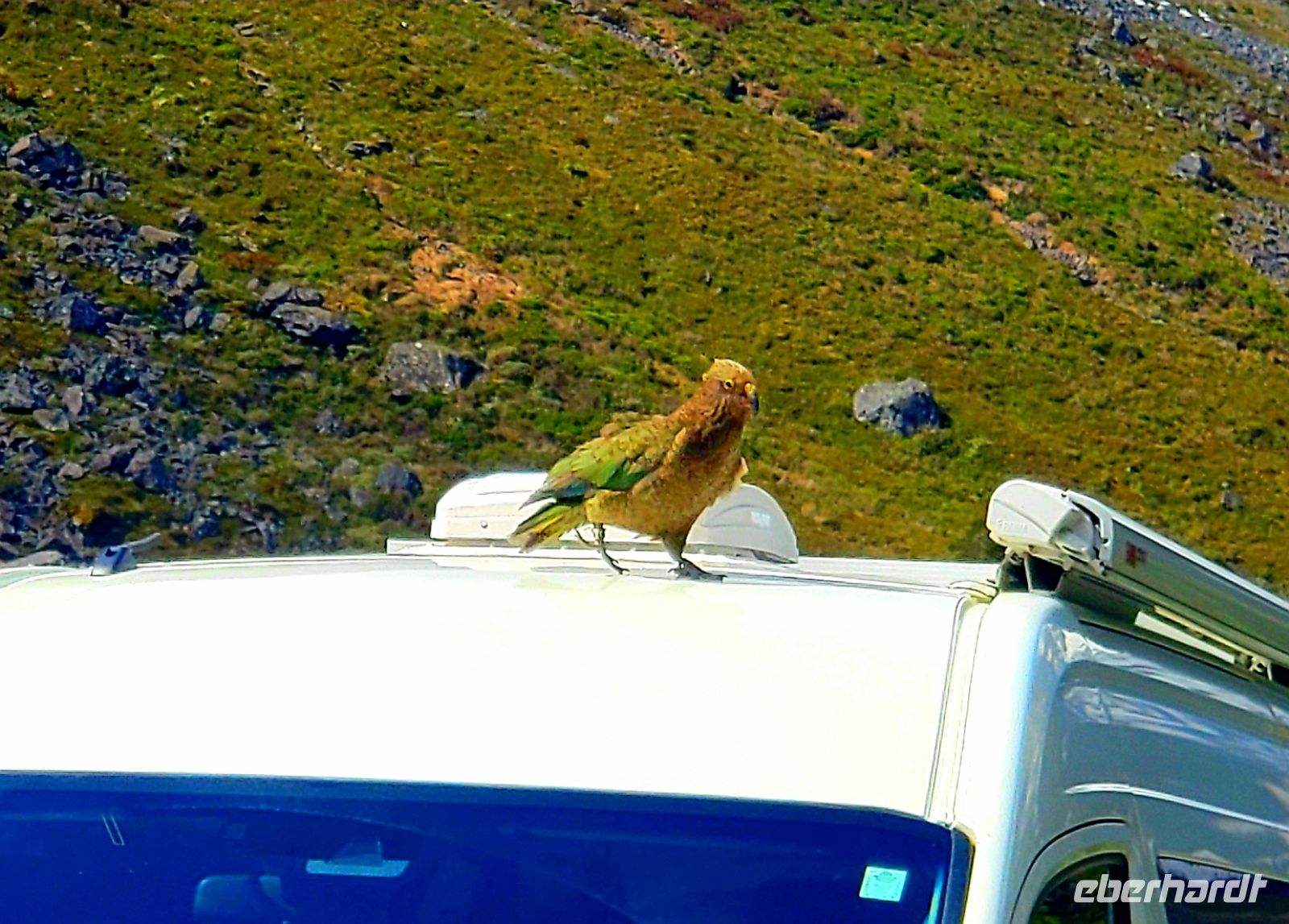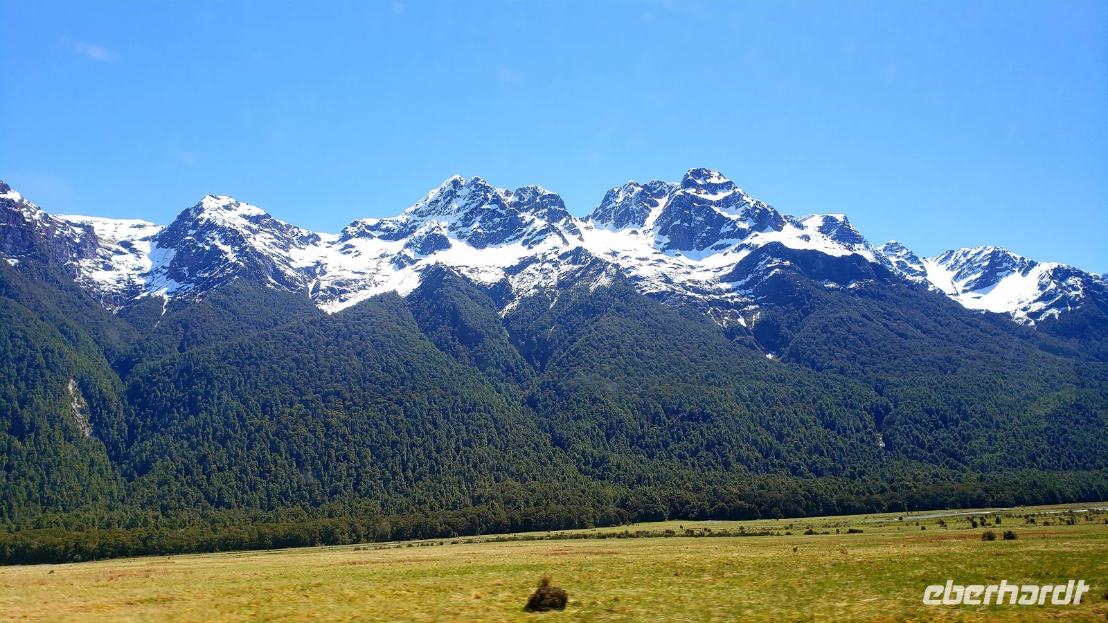 Heute erwartet uns ein besonderer Programmpunkt: Wir gehen auf eine Minikreuzfahrt im Milford Sound, ein Muss für Neuseeland Besucher! Wir starten 7.30 Uhr nach einem reichhaltigen Frühstück und fahren wieder quer über die Südinsel Richtung Südalpen. Es geht vorbei an vielen Schaffarmen, bis wir in Gore eine Kaffee- und Toilettenpause einlegen. Der nächste Stopp ist der schöne Ort Te Anau, am gleichnamigen See gelegen, wo es Restaurants und Souvenirgeschäfte gibt. Bei "Miles better Pies" holen sich einige Gäste superleckere, preisgünstige Fleischpasteten. Dann geht es weiter, wir legen noch einen kurzen Stopp am wunderschönen Lake Mirrors ein, wo sich die Berge mit ihren Schneekuppen im Wasser spiegeln. Inzwischen sind wir von hohen Bergen umringt und bald stehen wir vor dem Homer Tunnel, um auf die andere Seite der Südalpen zu gelangen. Während wir kurz auf die Durchfahrt warten müssen, setzt sich ein neugieriger Kea Papagei auf unser Auto und würde gerne mitfahren. Dann hüpft er zum nächsten Auto und schaut, was dort so los ist. Wir versuchen, ihn zu fotografieren, aber dann geht es schon durch den Tunnel. Am Milford Sound angekommen, parkt Peter den Bus in der Nähe des Schiffes und mit leichtem Handgepäck checken wir auf dem Motorsegler "Milford Mariner" ein. Nach einer Einführung über Ablauf der Tour und Sicherheitsvorschriften beziehen wir unsere gemütlichen Kabinen und treffen uns im Salon zu Kaffee und Snacks. Dann legt das Schiff ab und fährt durch einen Fjord, wo wir ankern und mit einem Beiboot eine Erkundungstour entlang der Küste unternehmen. Adam, unser Naturführer, erklärt viel über dieses Gebiet und wir sehen sogar einen Fjordland-Schopfpinguin an Land auf den Felsen herumwatscheln. Das ist natürlich das Highlight des Tages, auch wenn wir mit den Handys nicht so gute Fotos machen können, sind wir total aufgeregt. Dann geht es wieder zum Schiff zurück, zwei Gäste gehen noch "kurz" schwimmen, wirklich warm ist das Wasser nicht. Dann heißt es nur noch „entspannen“ im Salon bei einem leckeren Abend-Buffet und tollem Ausblick auf Berge, Wasserfälle und Regenwald. Nach dem Essen gibt es noch einen interessanten Bildervortrag von Adam über die Fjordlandschaft und die Tierwelt hier. Dann verschwinden alle Gäste in ihren Kabinen und das Schiff liegt still im Mondlicht im Fjord, von majestätischen, bewaldeten Bergen umgeben. Es gibt keinen Internetempfang hier, das tut auch mal gut, so können wir uns ausschließlich auf die Natur konzentrieren!