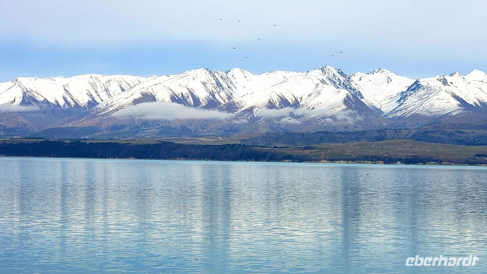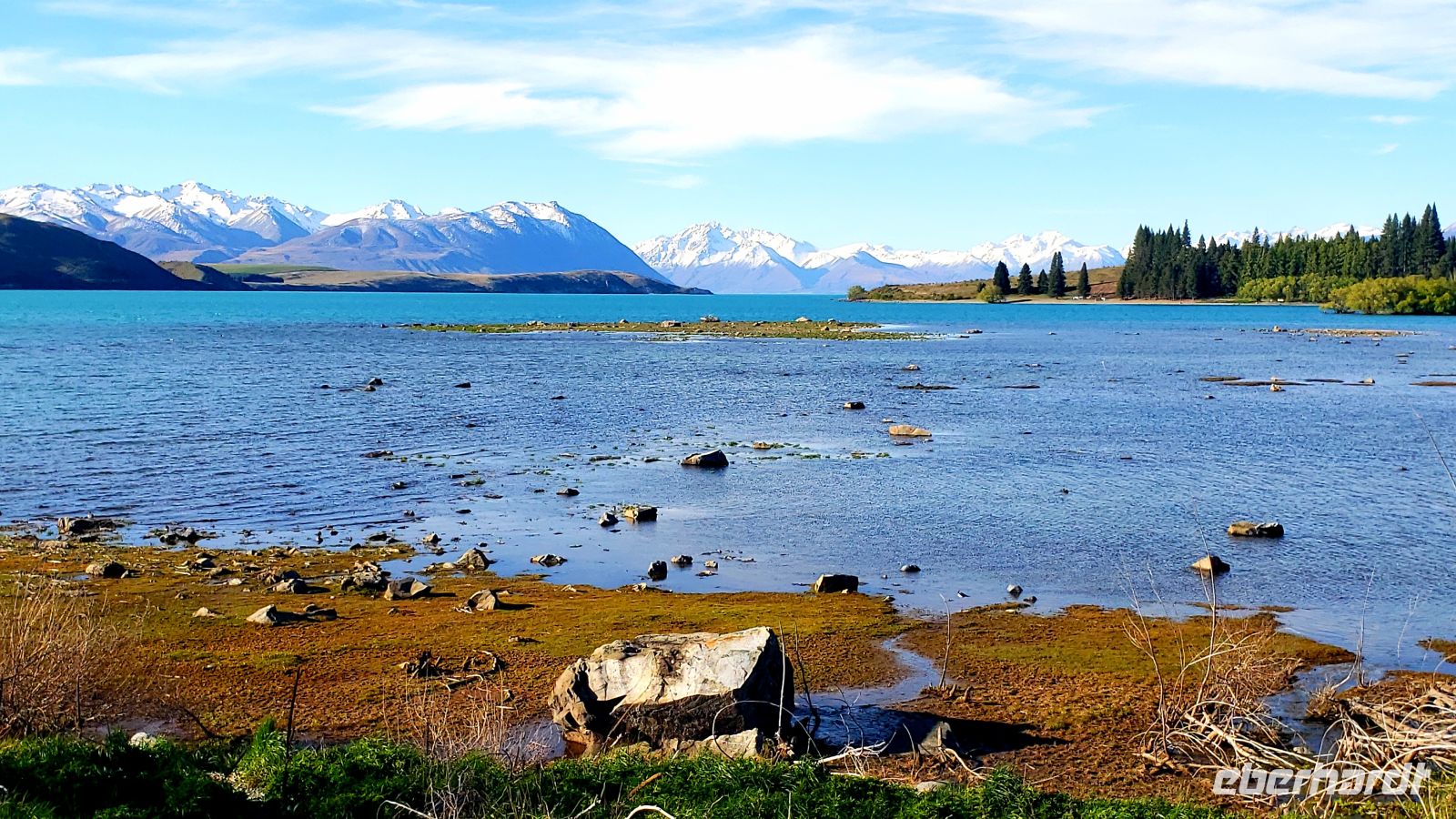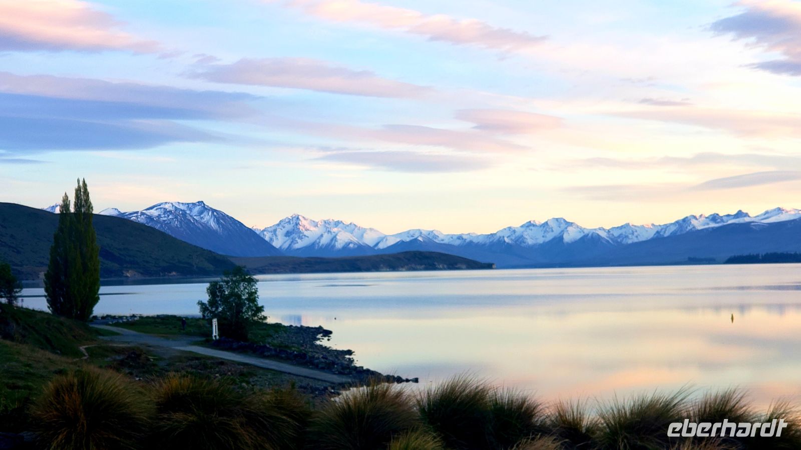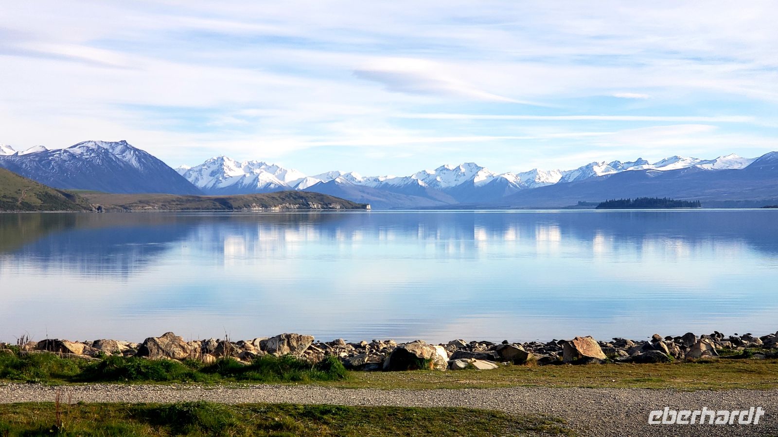 Nachdem alle Gäste gemütlich auf ihren Zimmern gefrühstückt haben, verlassen wir Kaikoura. Leider regnet es noch etwas und der Himmel ist grau. Richtung Süden kommt jedoch die Sonne heraus und wir unternehmen einen ersten Spaziergang in der charmanten, pulsierenden Stadt Christchurch. Wir schauen uns das Art Center an und gehen zur Ruine der Kathedrale, die bei einem Erdbeben zerstört wurde und nun wieder aufgebaut wird. Es gibt Souvenirläden und neben einem Denkmal des Südpolforschers Robert Scott fotografieren alle die verschiedenen farbenfrohen, nostalgischen Straßenbahnen. Unser Fahrer und Guide Peter hat sich inzwischen mit seinem Kollegen von der örtlichen Reiseagentur getroffen und unser Bus wird ausgetauscht, da er zur Inspektion muss. Dann geht es weiter zur "Riverside" Markthalle, wo, wer möchte, etwas essen kann. Die Fußgängerzone ist auch gleich nebenan und gegenüber fließt der Fluss Avon. Bei bestem Wetter flanieren wir eine Stunde herum, dann zeigt Peter uns noch den botanischen Garten und die Kathedrale aus Pappe. Dieser Ort ist eine richtige Attraktion geworden, obwohl es nur als Interimsgebäude gedacht ist. Dann verlassen wir Christchurch, die Stadt hat allen sehr gut gefallen, deshalb haben wir dort auch länger verweilt als geplant. Durch kleine bezaubernde Städte geht es Richtung Südalpen, die Gebirgskulisse begleitet uns während der Fahrt und bietet großartige Fotomotive. Nach zwei Toiletten- und einigen Fotostopps kommen wir erst 18.30 Uhr im Godley Hotel in Tekapo an und sind begeistert, dass unser Hotel direkt am See liegt mit Blick auf die Berge. Einige gehen noch vor dem Abendessen an den See für Fotos, dann gibt es um 19 Uhr ein Buffet für unsere Gruppe. Peter hat unten in der Bar ein Klavier entdeckt und spielt uns nach dem Essen noch etwas vor. So geht ein weiterer ereignisreicher Tag zu Ende!