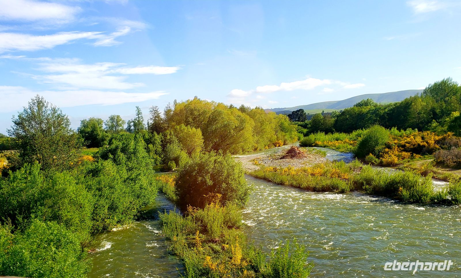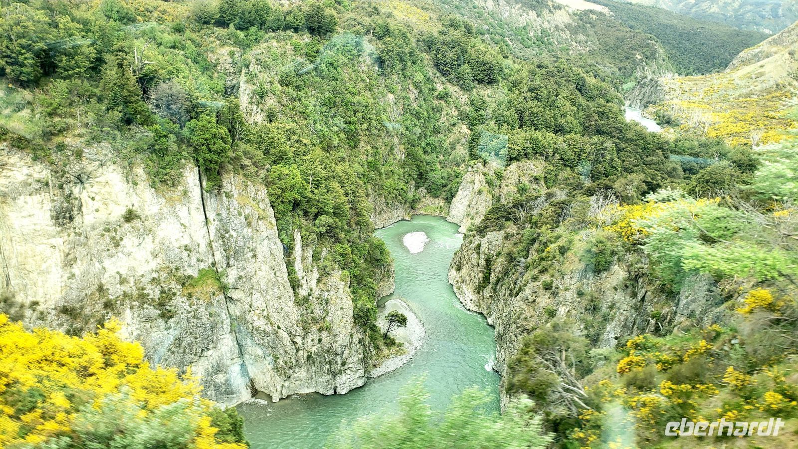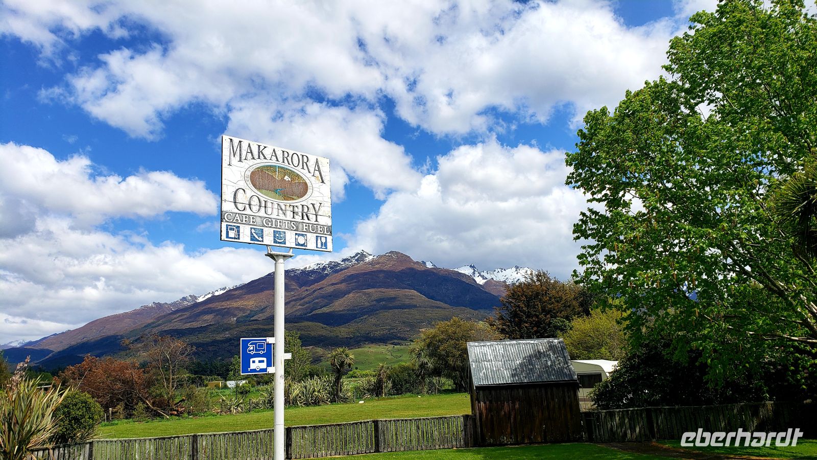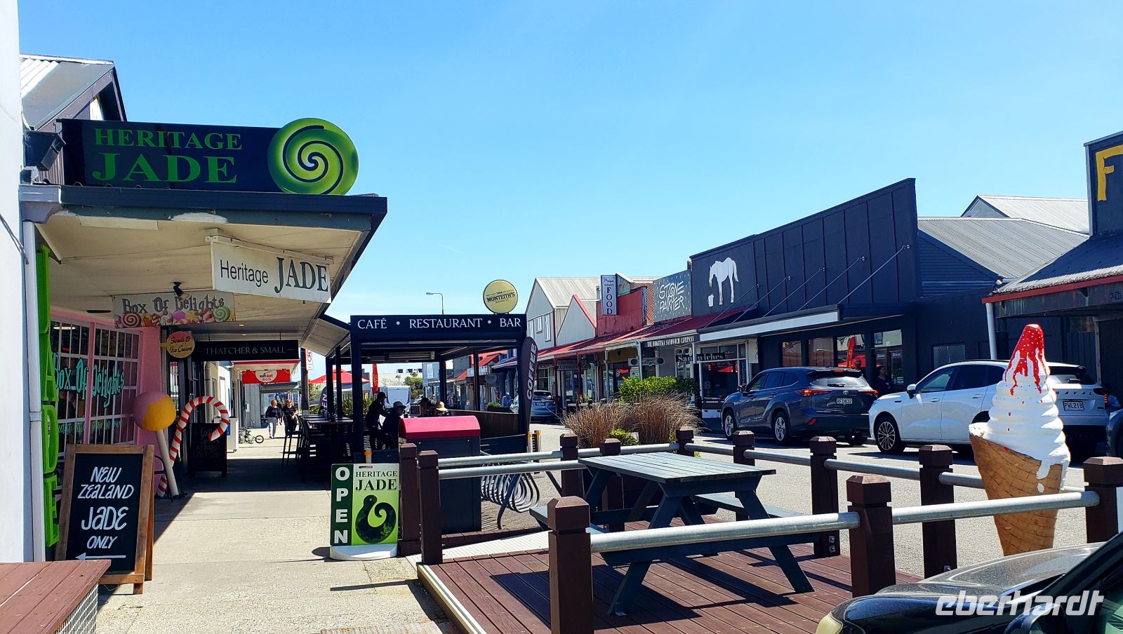 Nach dem Frühstücksbuffet starten wir gutgelaunt wie immer mit Peter in den heutigen Tag. Trotz anderslautender Vorhersage scheint die Sonne und unser erster Stopp ist die kleine Goldgräberstadt Arrowtown. Wir schauen uns die Originalhütten aus dem 19. Jahrhundert an, die am Arrow Fluss verteilt stehen. Dann schlendern wir noch ein wenig im neueren Ortskern, wo es schöne Holzhäuser gibt, in denen Geschäfte und Cafés untergebracht sind. Der nächste Halt ist an der berühmten Kawarau Brücke, wo das Bungee-Jumping erfunden wurde, und seitdem stürzen sich täglich viele Menschen, mit Seilen gesichert, Richtung Fluss. Wir schauen zu, wie eine junge Frau mit Kreischen springt und mit strahlendem Gesicht wieder hochgezogen wird. Allein das Zuschauen ist schon ein Erlebnis! Wir müssen aber weiter, nach ein paar Fotostopps machen wir in dem Ort Makarora Mittagspause, wo es ein uriges Country Café gibt. Ich gebe im Namen von Eberhardt ein "Hokey Pokey" Eis aus, das ist eine Neuseeländische Spezialität und ein Muss für Urlauber! Das riesige Vanilleeis mit Karamellstückchen schmeckt allen hervorragend und reicht fast als Mittagessen.