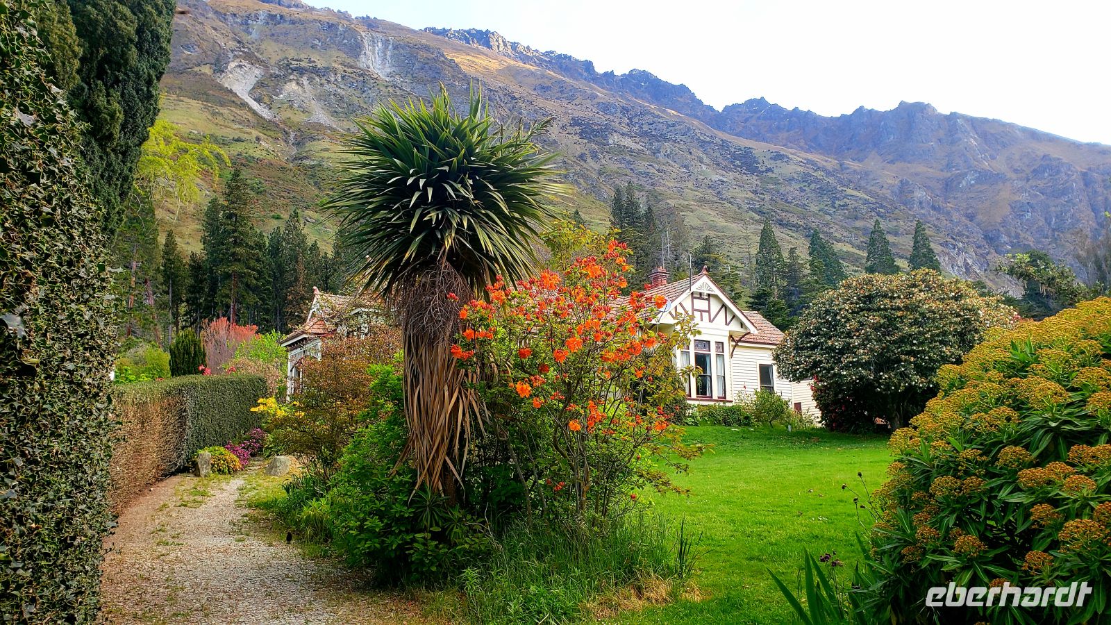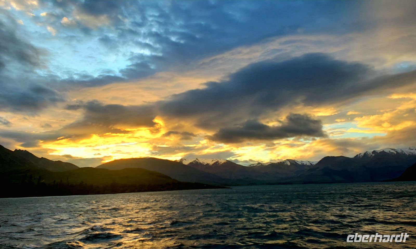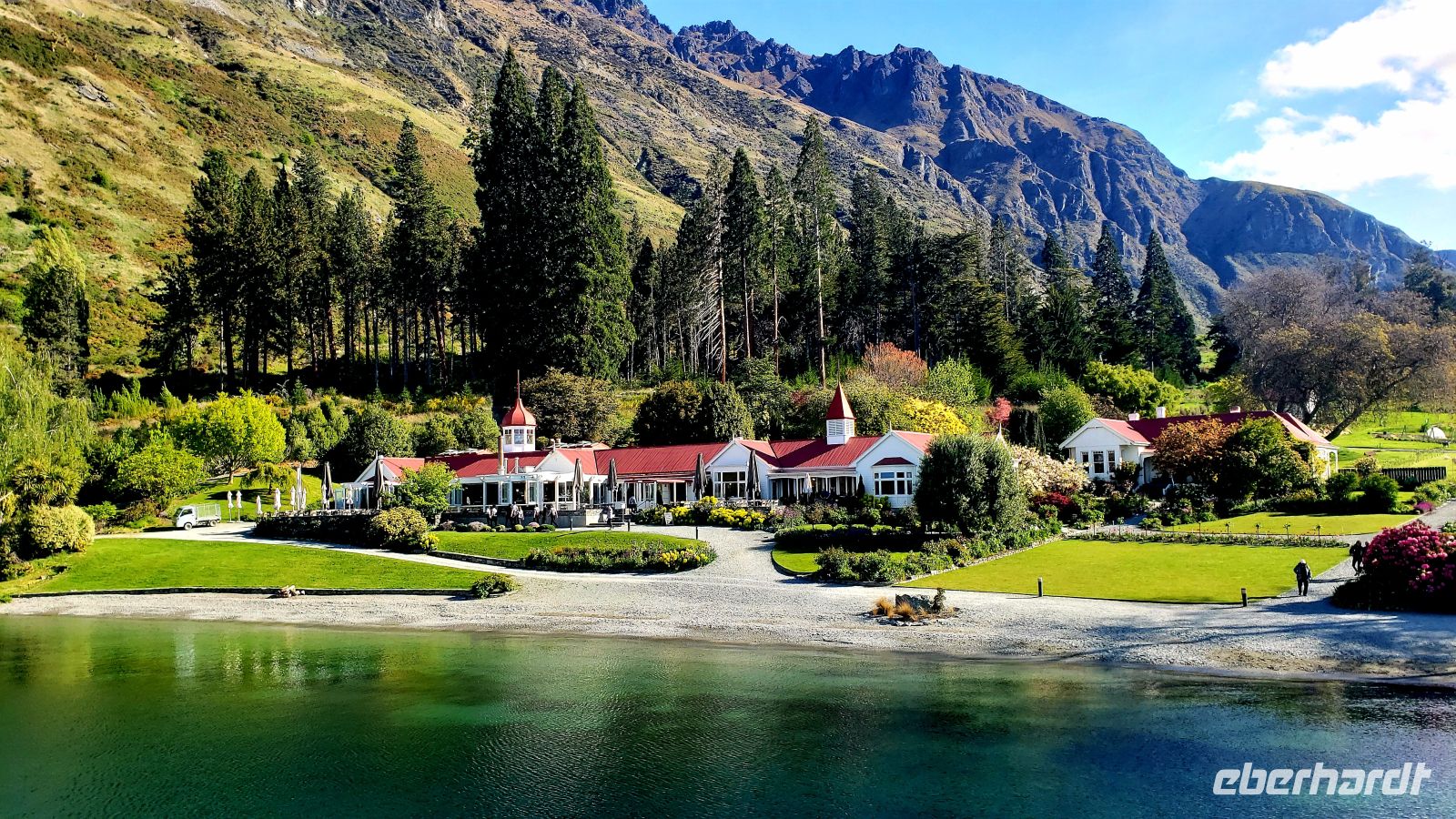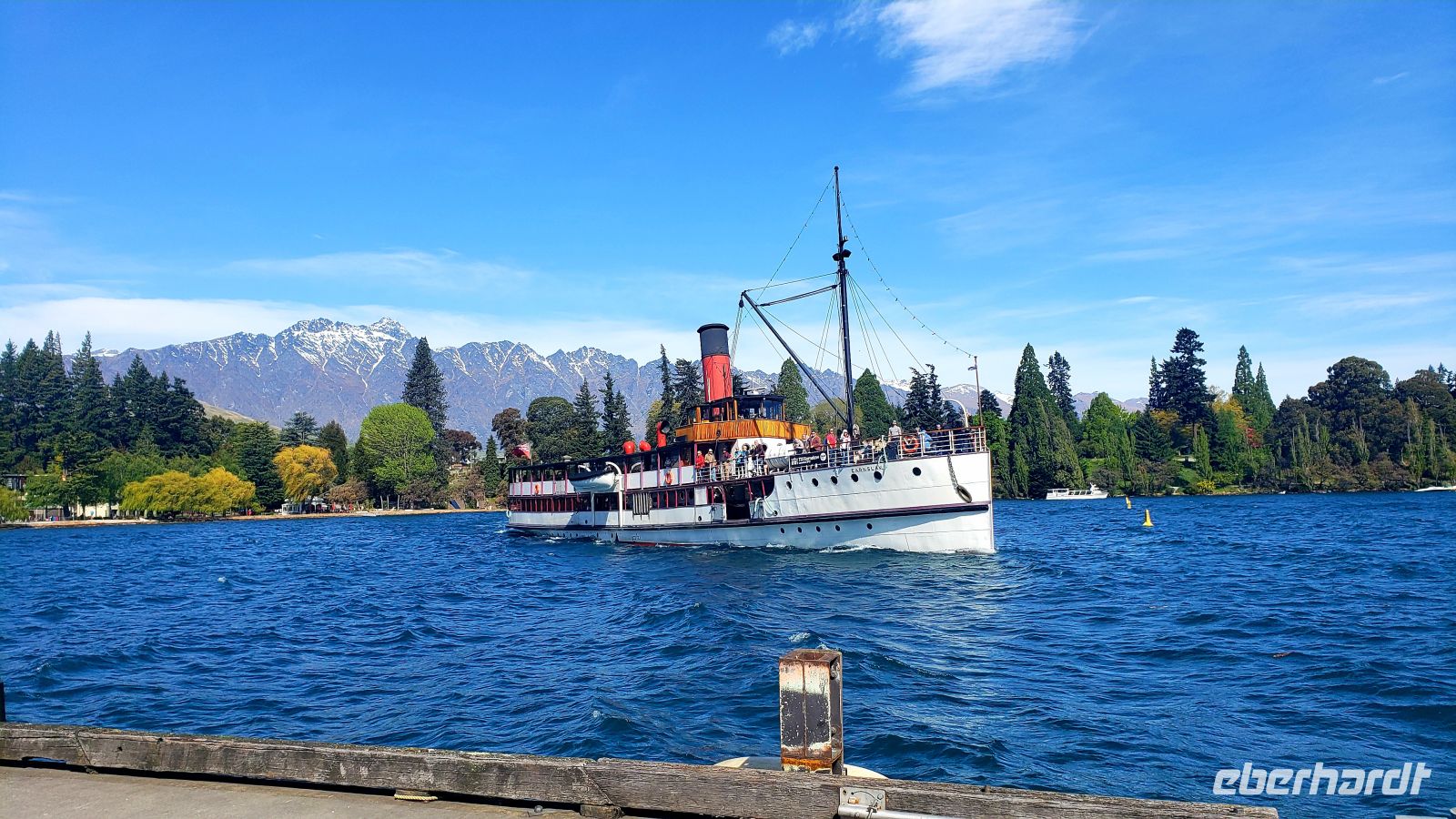 Da die Stadt sehr übersichtlich und alles vom Hotel fußläufig erreichbar ist, entscheiden die Gäste, dass sie individuell den Tag verbringen möchten. Es gibt einen schönen Park, eine Hafenpromenade, Fußgängerzone und natürlich die berühmte Gondel-Bahn zum Bob's Peak hoch, von wo man einen wunderschönen Blick auf die Stadt Queenstown und den See Wakatipu hat. Auch gibt es dort schöne Wanderwege. Ich entscheide mich für einen Spaziergang im Park und anschließendem Bummel durch die Fußgängerzone, überall treffe ich unsere Gäste, die ähnliche Ziele hatten. Um 16.30 Uhr stehe ich mit fünf Gästen am Pier, wir haben die Bootsfahrt mit einem Dampfschiff gebucht, inklusive Besuch einer Schaffarm und Barbecue Dinner. Die Fahrt über die Bucht von Queenstown bei schönstem Wetter dauert eine Stunde, dann verlassen wir das Schiff und sehen eine wunderschöne Farm in traumhafter Umgebung. Wir gehen ins große Gebäude, außer uns sind natürlich noch diverse andere Gruppen gekommen, alle haben einen festen Tisch und das Barbecue Buffet lässt keine Wünsche offen. Neben leckerem Fleisch von Rind, Lamm und Hühnchen gibt es Antipasti, Scampi, Käsesorten und diverse Desserts zur Auswahl. Der Ablauf ist super organisiert und wir verbringen einen netten Abend zusammen. Nach dem Essen geht es gruppenweise zur Farm Show, hier zeigt ein junger Mann, wie ein Schaf geschoren wird. Anschließend bringt der Hütehund einige Schafe von der Weide zu dem Paddock vor unserer Tribüne. Das macht er so geschickt, dass er viel Applaus bekommt. Auf dem Gelände gibt es noch einen Souvenirladen, dann geht es mit dem Sonnenuntergang wieder nach Queenstown, wo wir gegen 21 Uhr ankommen. Uns hat der Abend sehr gut gefallen, einige Gäste bleiben noch in der Fußgängerzone, andere gehen gleich zum Hotel rauf. So geht wieder ein erlebnisreicher Tag zu Ende.