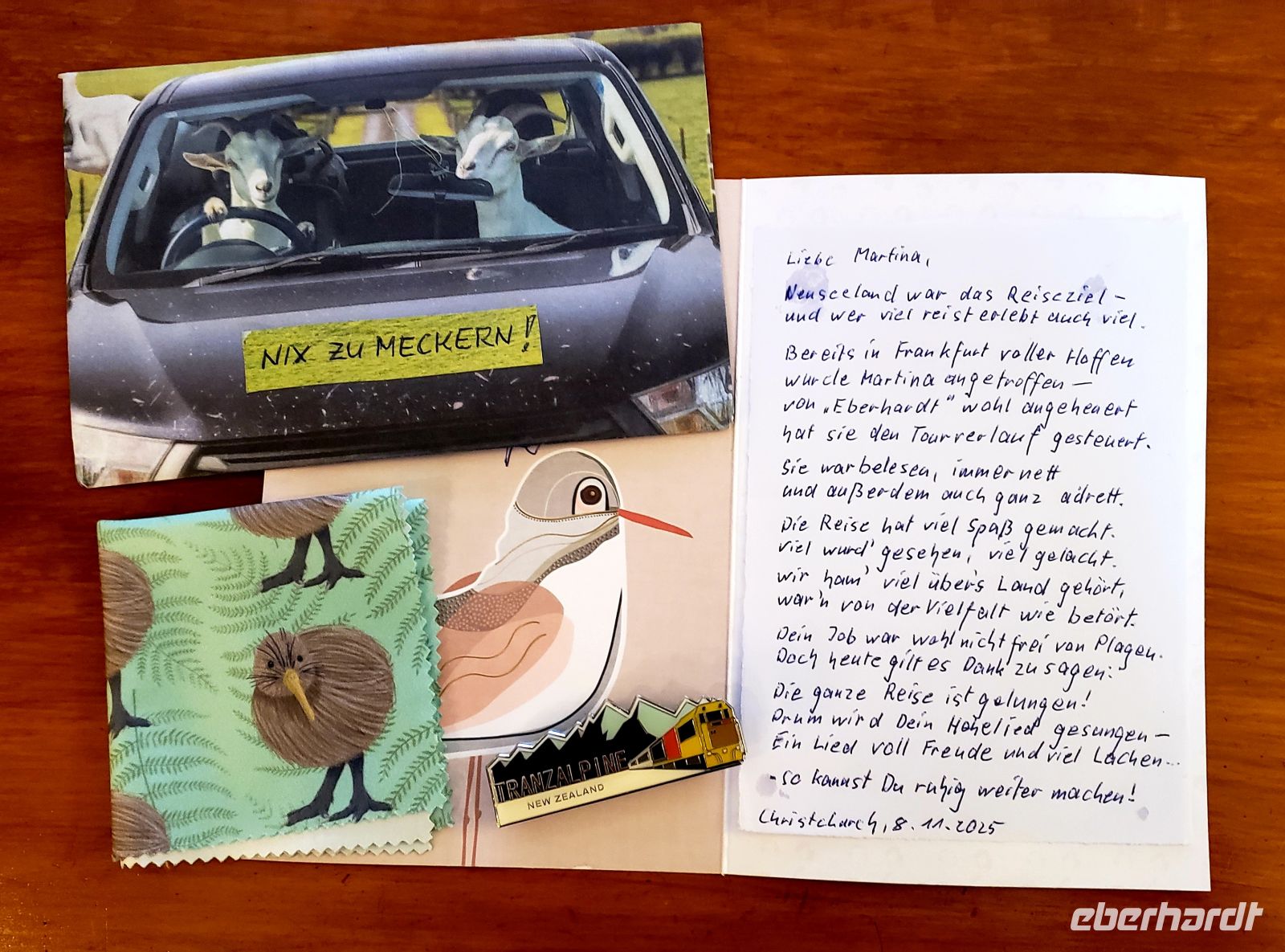 Die Gäste, die nach Australien weitergereist sind, haben uns schon erste Fotos geschickt, als wir in Frankfurt ankommen. Ich verabschiede mich von den letzten Gästen und bald sind wir alle wieder zuhause in unseren jeweiligen Heimatstädten. Mein Dank geht an diese wunderbare, harmonische Gruppe, mit der ich viel Spaß hatte! Was für eine Erlebnisreise! Hoffentlich bleiben die Erinnerungen an die spektakulären Landschaften Neuseelands noch lange im Gedächtnis haften...