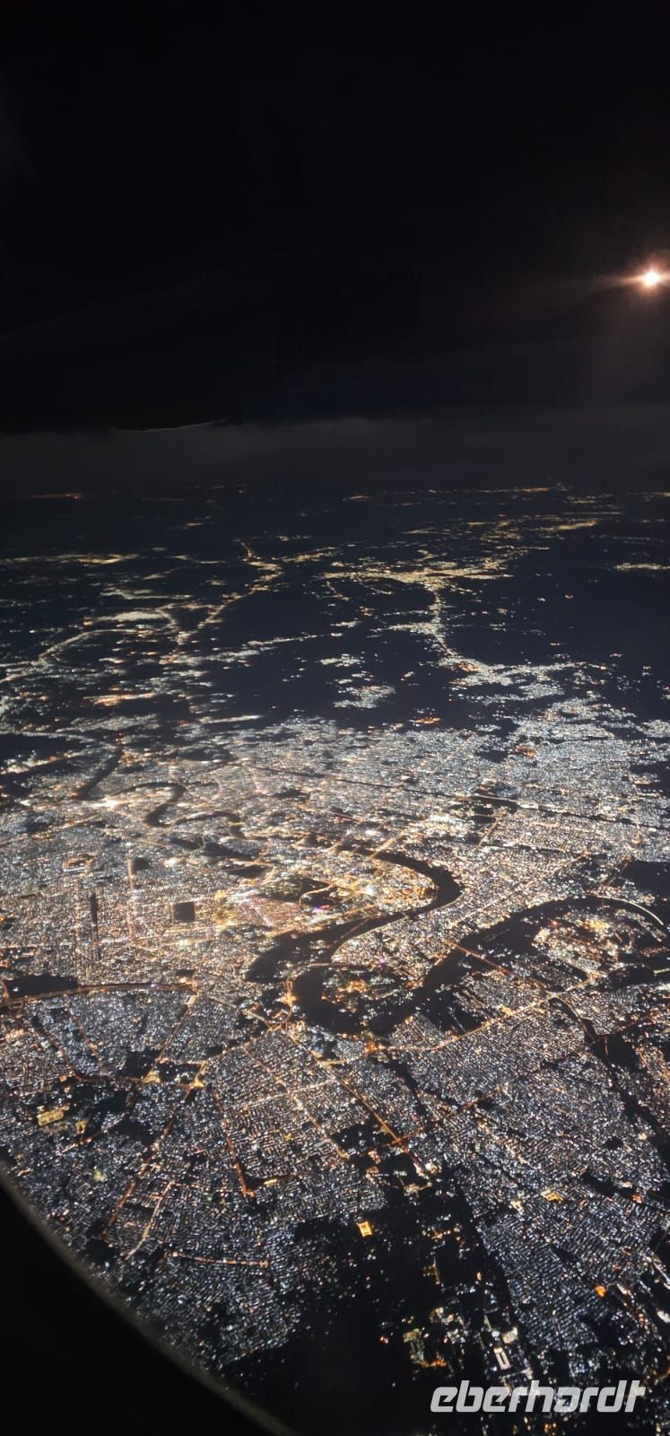 Nach einer kurzen Wartezeit gehen wir an Bord unseres Flugzeugs – eines A380 – und starten mit leichter Verspätung gegen 22:00 Uhr. Die Stewardessen kümmern sich aufmerksam um uns, und nach einem leckeren Abendessen verbringt jeder die Zeit mit dem Bordprogramm oder gönnt sich etwas Schlaf.