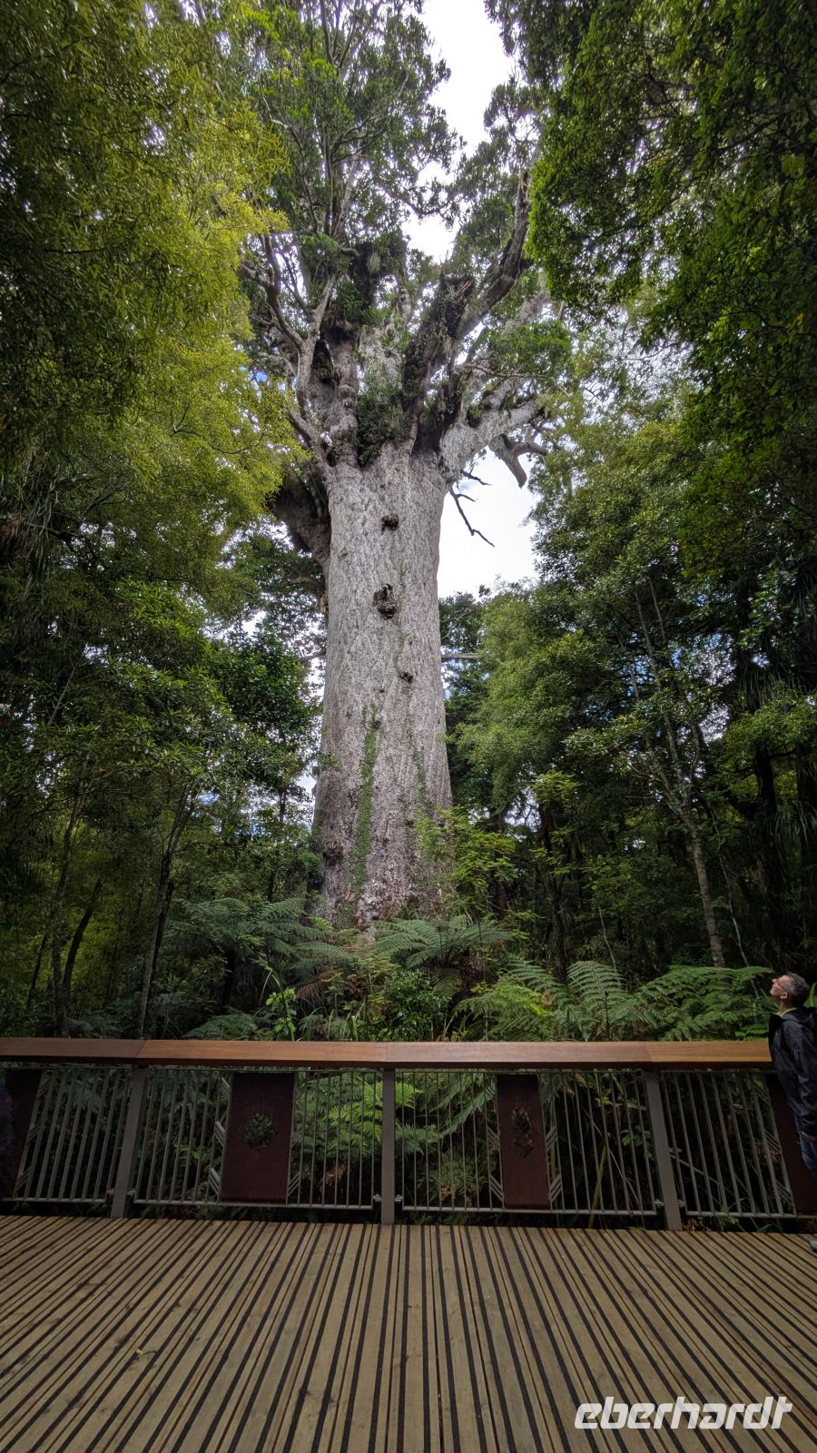 Unser erster Stop heute ist das Kauri Museum. Hier lernen wir etwas über die Geschichte der riesigen Kauri-Bäume, die einst weite Teile Nordneuseelands prägten. In liebevoll gestalteten Ausstellungen erfährt man viel über die Kauri-Holz- und Harzgewinnung, sowie das Leben der frühen Siedler. Besonders eindrucksvoll sind die gewaltigen Baumquerschnitte und historischen Werkzeuge. Jetzt wollen wir aber auch die Kauri Bäume in der Natur erleben und fahren weiter in den Waipoua-Wald, wo wir erst beim Tahne Mahuta (Herr des Waldes) Halt machen. Mit seiner Höhe von rund 51 Metern, einem Umfang von über 13 Metern und einem geschätzten Alter von etwa 1.500 bis 2.000 Jahren gilt er als der größte noch lebende Kauri-Baum Neuseelands. Für die Māori besitzt Tāne Mahuta eine besondere spirituelle Bedeutung und steht symbolisch für Kraft, Leben und die enge Verbindung zwischen Erde und Himmel.