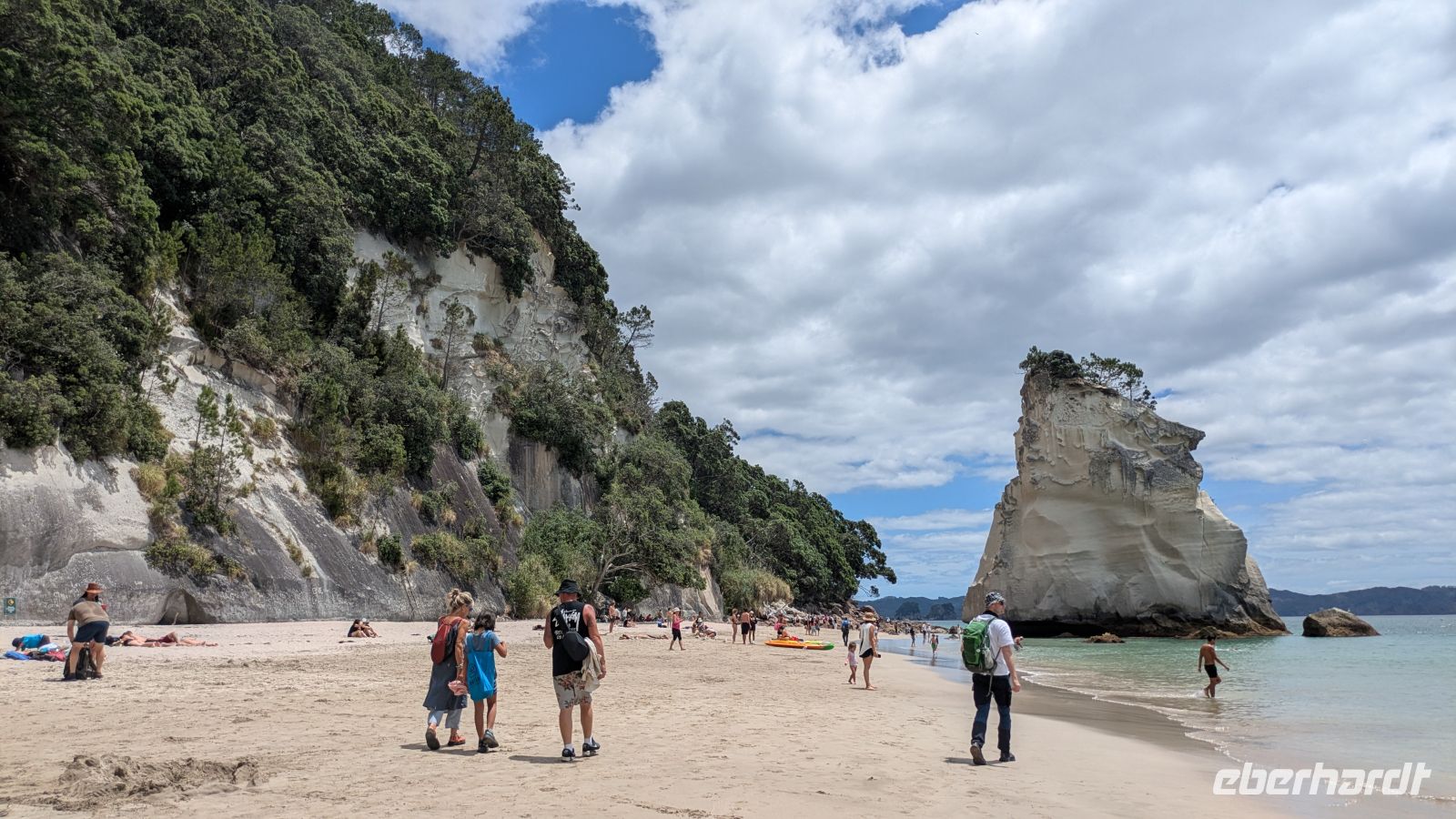 Wenn man an Neuseeland denkt und sich ein paar Bilder anschaut, kommt man an der Cathedral Cove kaum vorbei. Der riesige Felsbogen, der feine Sandstrand und das leuchtend blaue Wasser sehen fast schon unrealistisch aus. Genau dort zog es uns heute für einen Tagesausflug hin.