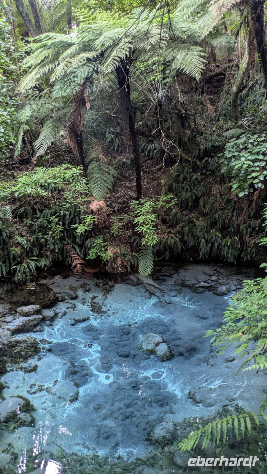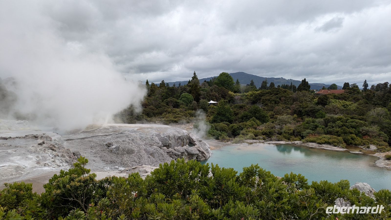 Weiter geht es zu den Wairakei Terrassen. Die hellen Terrassen mit ihrem sanft fließenden, blau schimmernden Wasser wirkten, eingehüllt im leichten Dampf, besonders still und unwirklich. Wir hielten inne und ließen die magische Atmosphäre dieses Ortes ganz auf uns wirken.