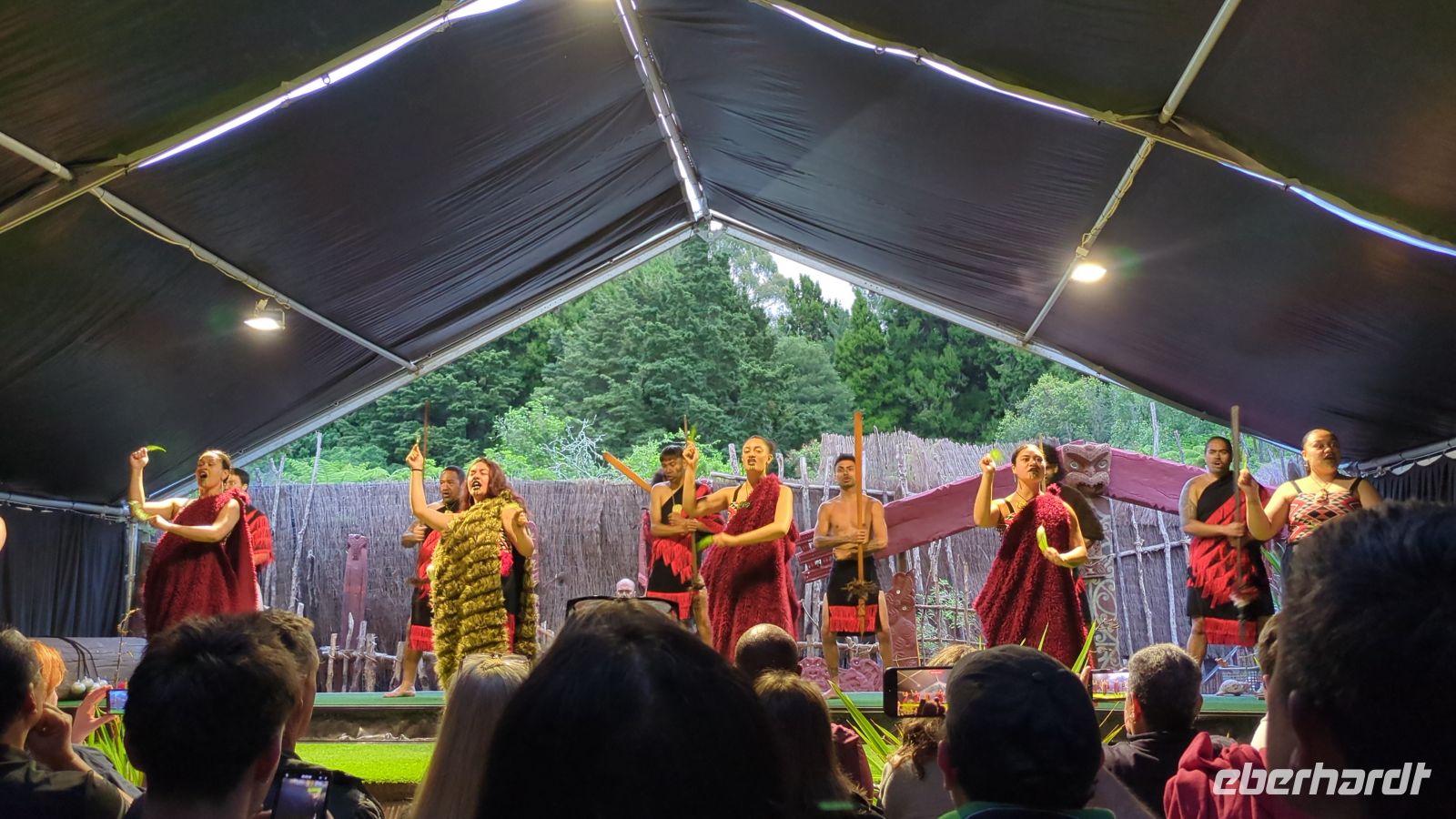 Nach dem Essen wurde uns der Haka vorgeführt – der berühmte Tanz der Maori. Der Haka wird traditionell von Kriegern vor Schlachten oder zu besonderen Anlässen getanzt und ist geprägt von stampfenden Füßen, rhythmischen Bewegungen, lauten Rufen und ausdrucksstarken Gesichtern. Er symbolisiert Stärke, Zusammenhalt und Respekt und vermittelt zugleich eine gewaltige Präsenz aus. Die Darbietung live zu erleben, ist wirklich faszinierend und lässt die Energie und Kultur der Maori hautnah spürbar werden.