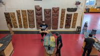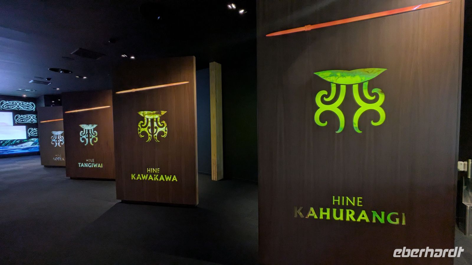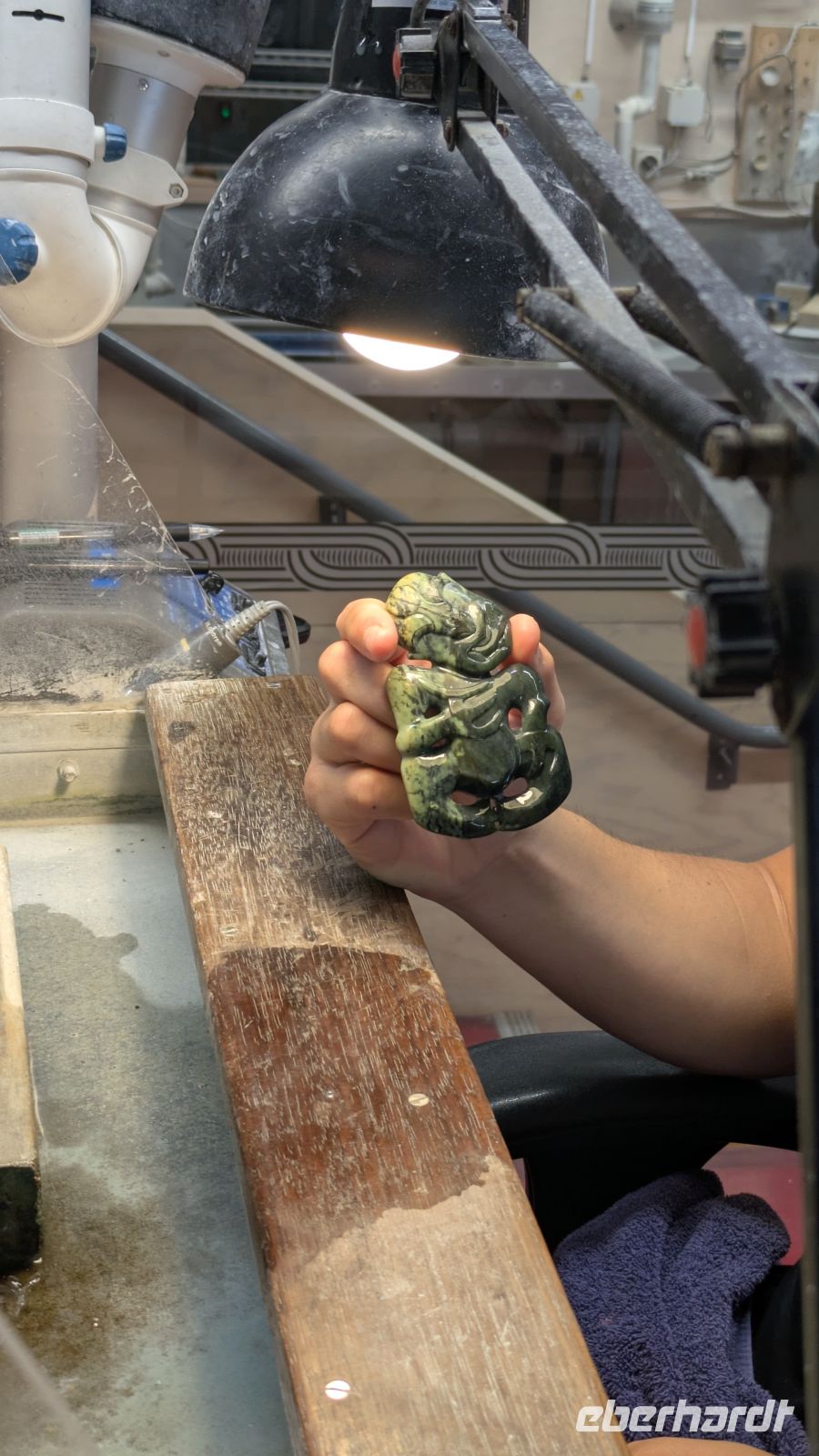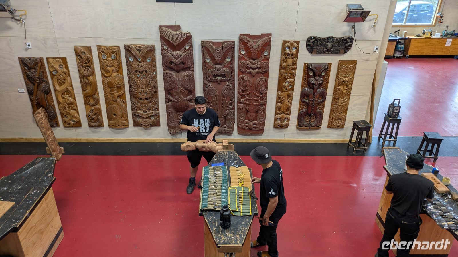 Danach besuchen wir die Holzwerkstatt, in der die traditionellen Whakairo R?kau geschnitzt werden. Kaia erklärte uns, dass hier jedes Jahr nur fünf Personen ausgebildet werden, um dieses alte Handwerkskunst weiterzugeben. Neben Holz wird auch Pounamu (Jade) bearbeitet. Außerdem erfuhren wir, man solle diesen Stein niemals für sich selbst erwerben, sondern ihn verschenken, damit er Schutz und Glück schenke.