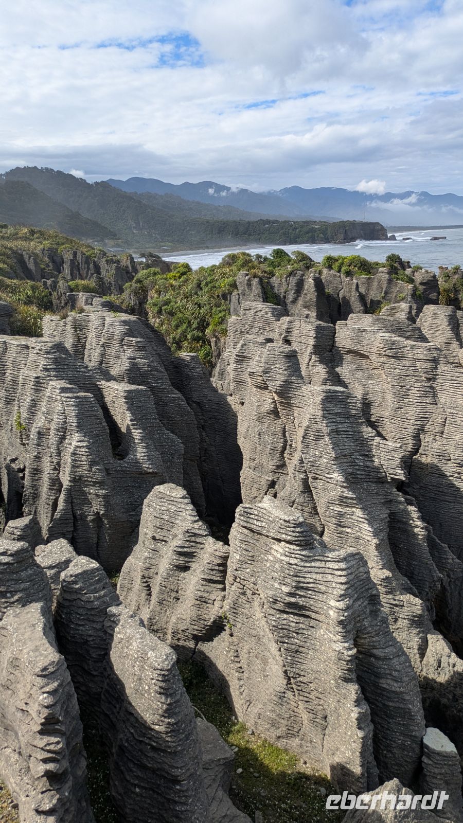 Die Pancake Rocks waren eine beeindruckende Felsformation, die aussah, als hätte jemand unzählige Pfannkuchen übereinandergestapelt. Entstanden waren sie über Millionen von Jahren durch Ablagerungen von Kalkstein sowie durch die ständige Arbeit von Wind und Wasser. Besonders bei starkem Wellengang schießen an den sogenannten Blowholes die Wassersäulen meterhoch in die Luft – ein echtes Naturschauspiel.