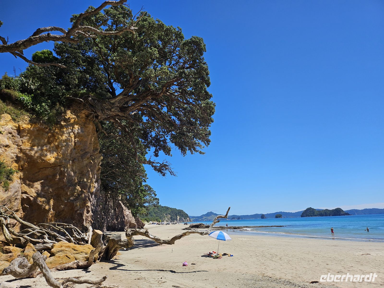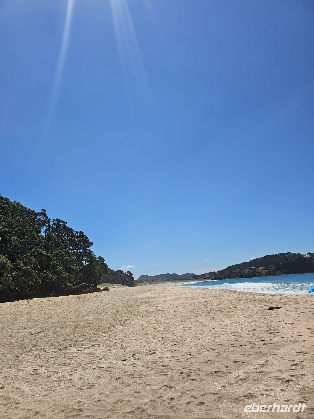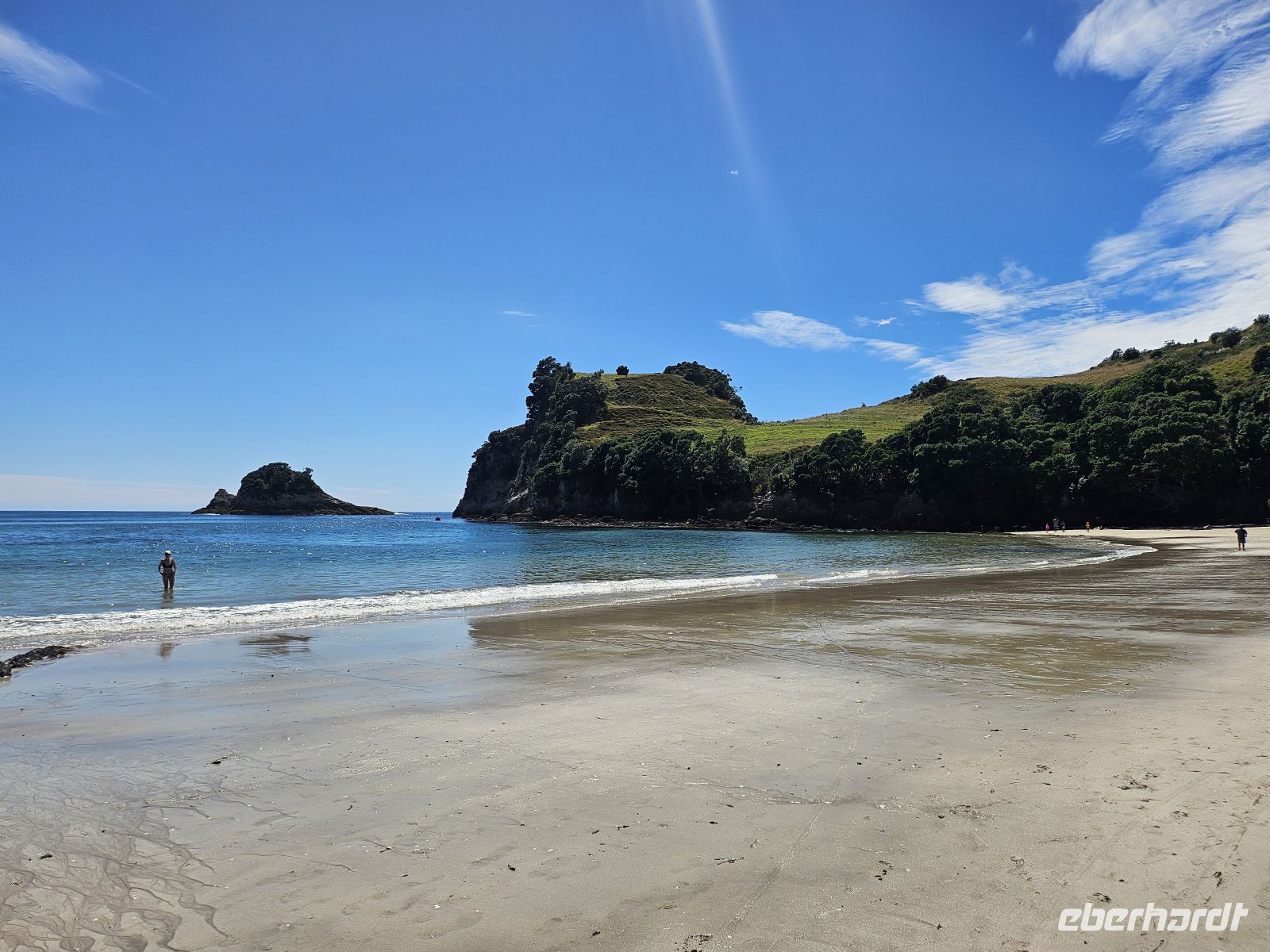 Der Tag beginnt mit einer kleinen Planänderung: Der Wanderweg zur Cathedral Cove ist nach einem Erdrutsch gesperrt, daher passen wir unser Programm flexibel an. Stattdessen fahren wir zunächst zum wunderschönen Hahei Beach. Bei strahlendem Sonnenschein und sommerlichen 26 Grad zeigt sich die Coromandel-Küste von ihrer besten Seite.