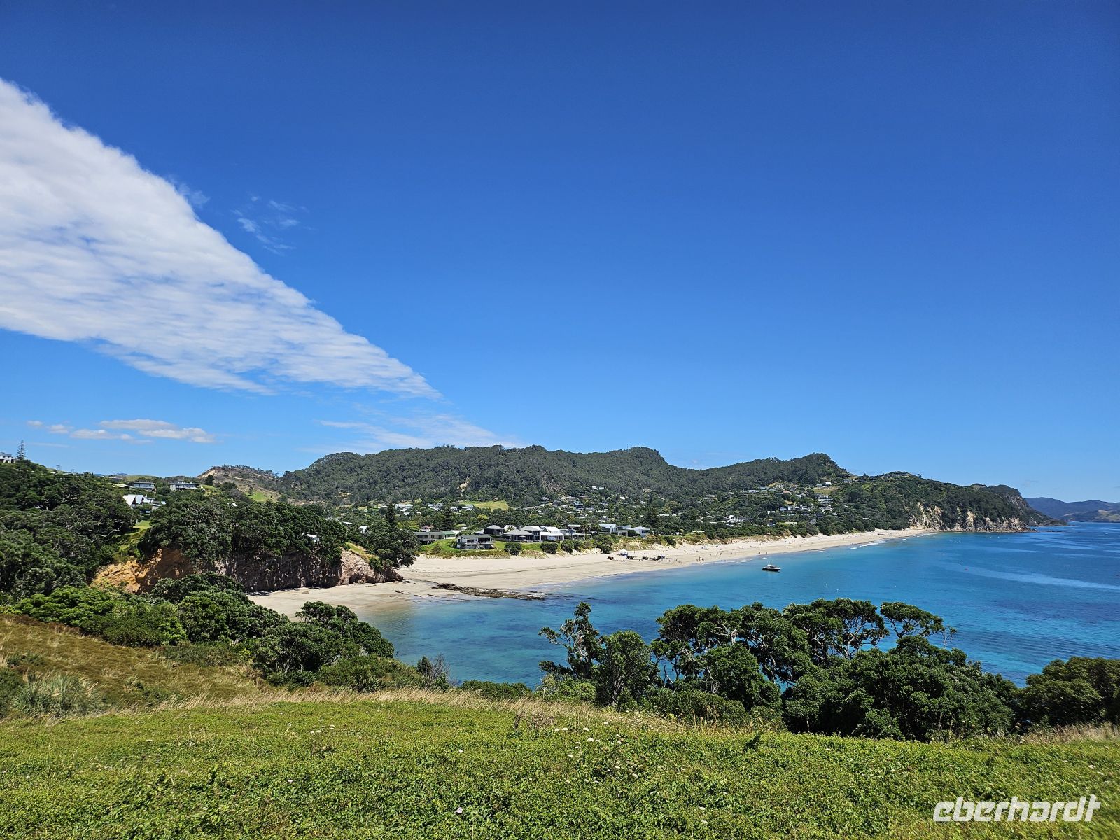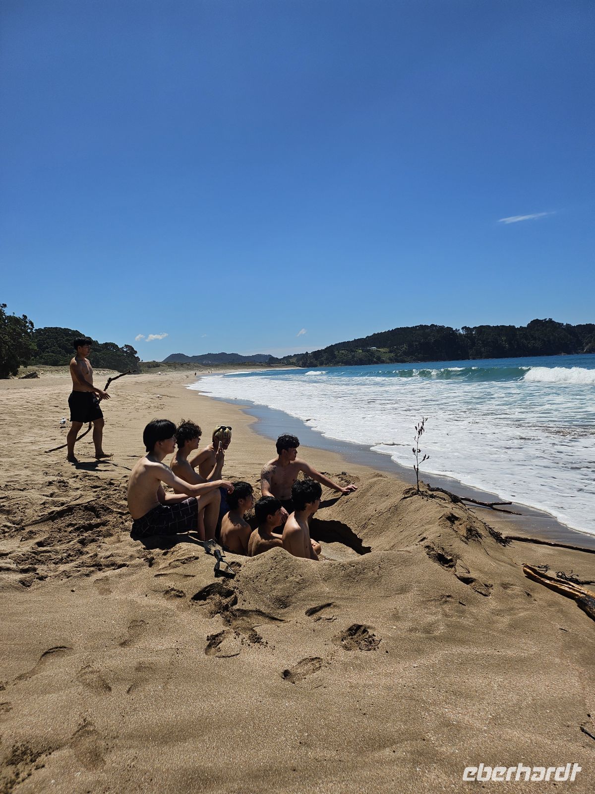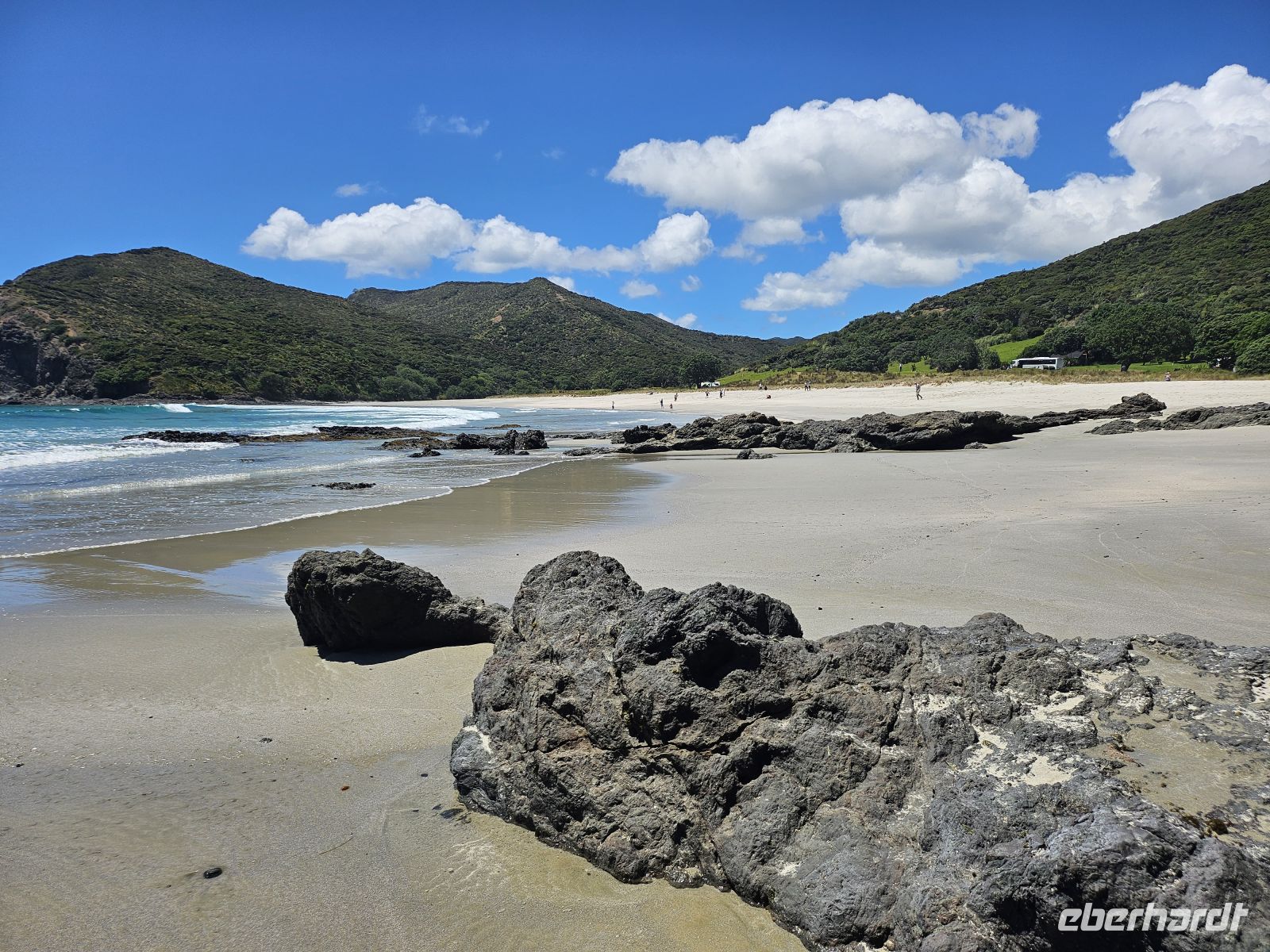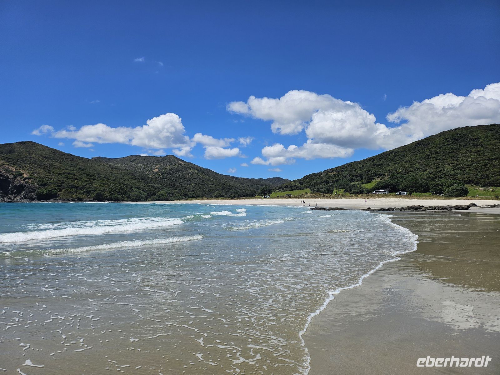 Der Tag beginnt mit einer kleinen Planänderung: Der Wanderweg zur Cathedral Cove ist nach einem Erdrutsch gesperrt, daher passen wir unser Programm flexibel an. Stattdessen fahren wir zunächst zum wunderschönen Hahei Beach. Bei strahlendem Sonnenschein und sommerlichen 26 Grad zeigt sich die Coromandel-Küste von ihrer besten Seite.