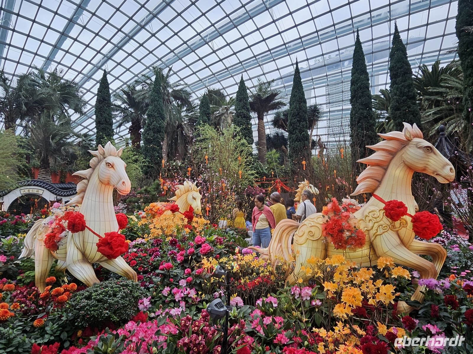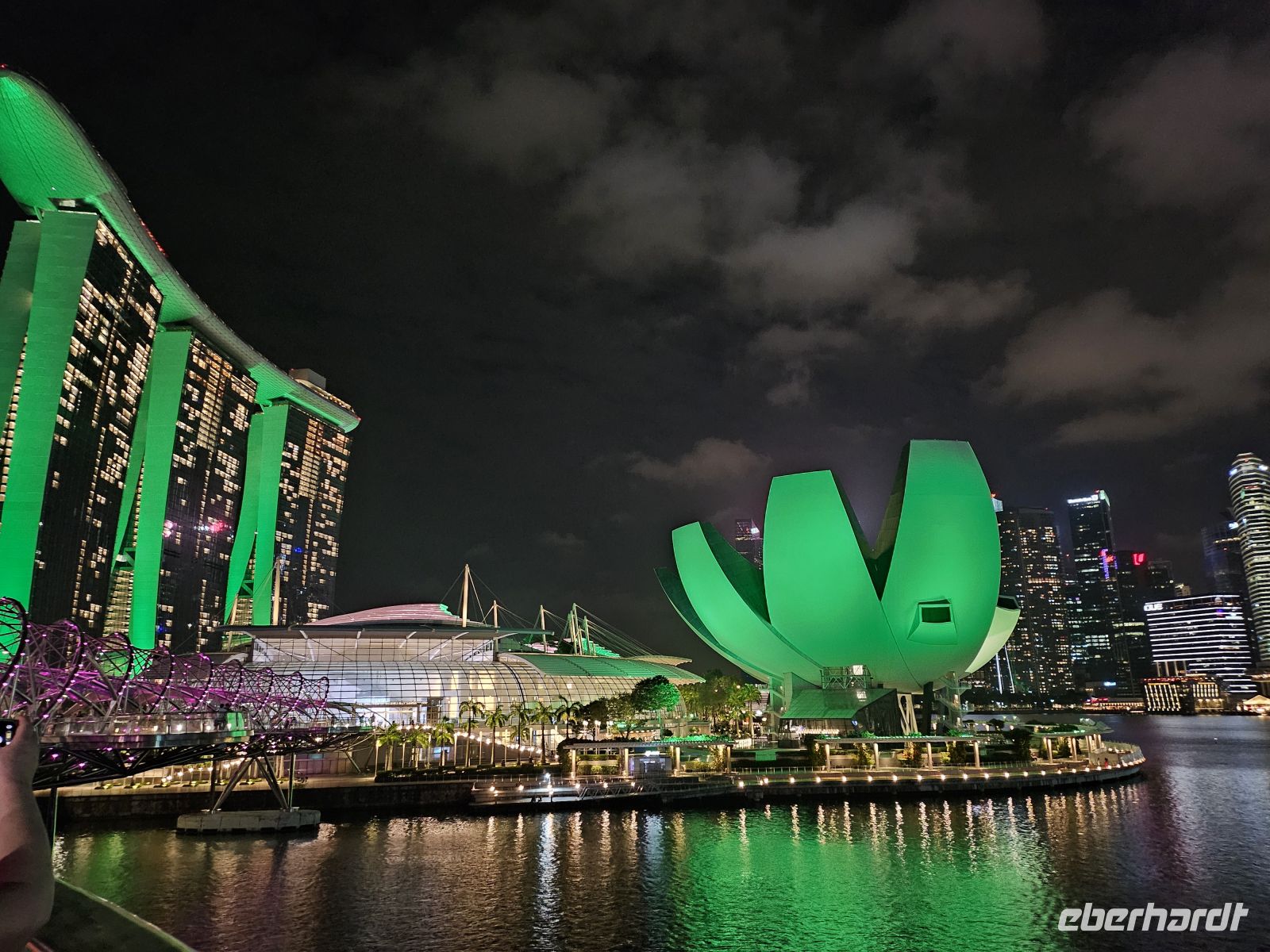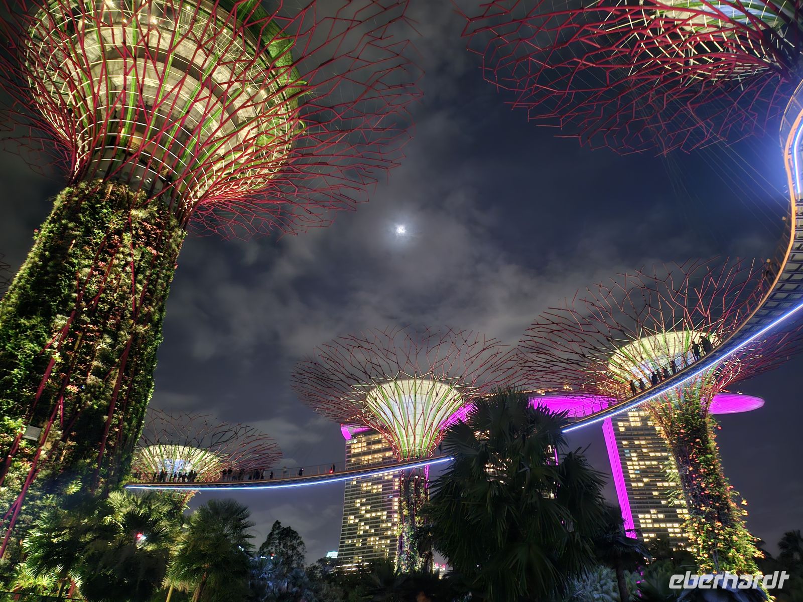 Doch der Abend ist noch nicht vorbei. In den Gardens by the Bay erleben wir die berühmten Supertrees – futuristische, bis zu 50 Meter hohe Stahlbäume, die sich nach Einbruch der Dunkelheit in leuchtende Kunstwerke verwandeln. Bei der Show „Garden Rhapsody“ erstrahlen sie im Rhythmus der Musik in ständig wechselnden Farben, während wir unter ihnen stehen und in den Himmel blicken. Die Atmosphäre ist fast unwirklich – tropische Wärme, funkelnde Lichter und diese einzigartige Kulisse.