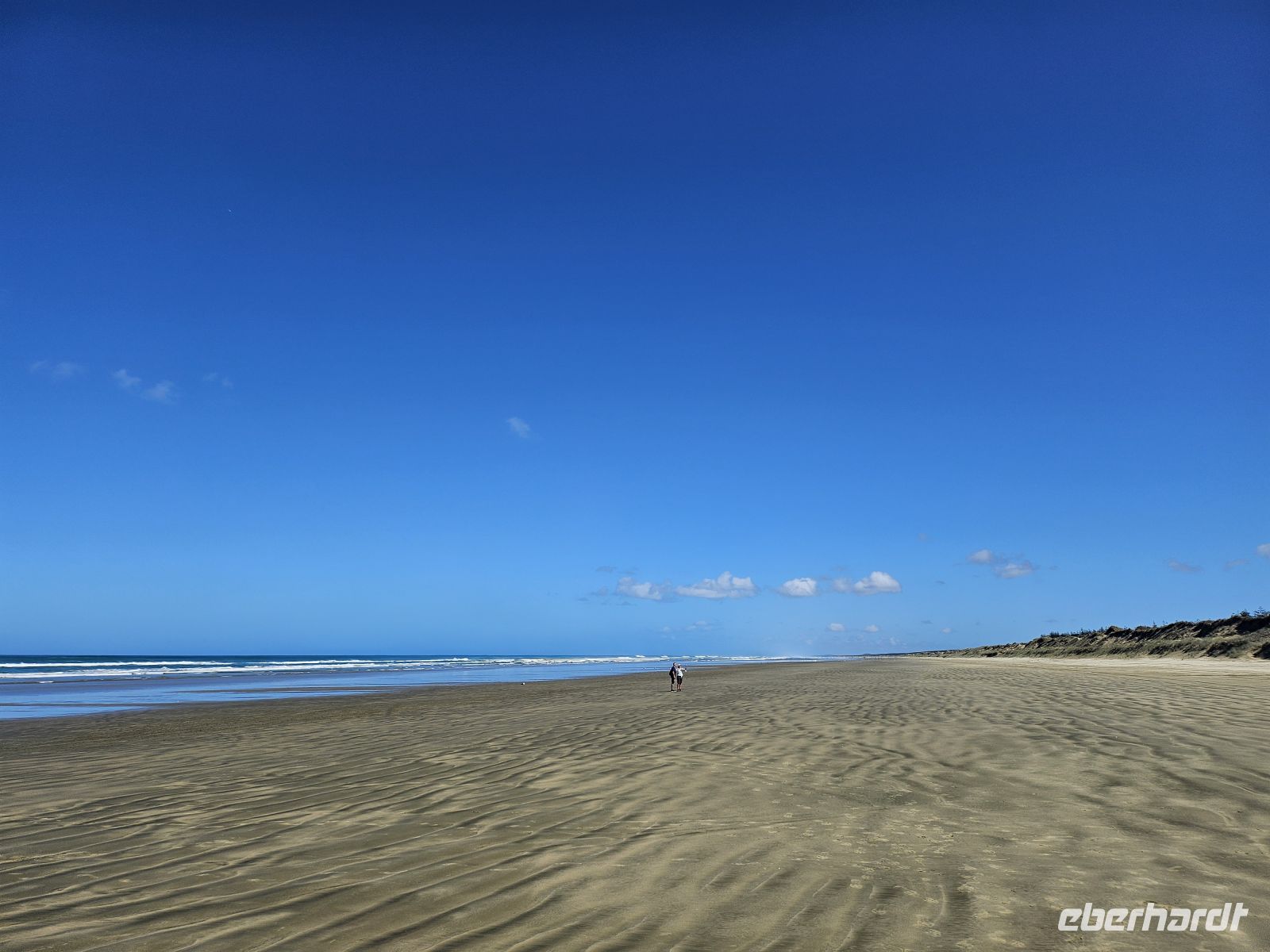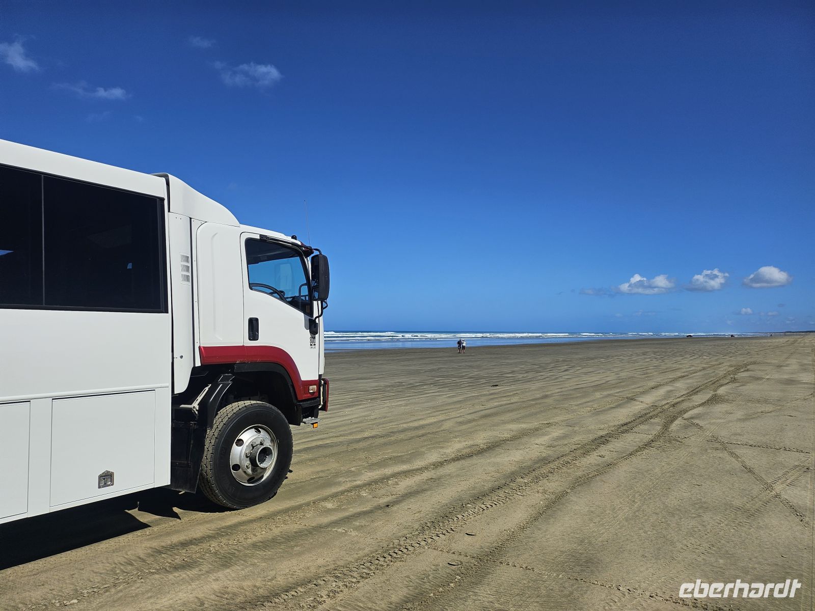 Dann kommt eines der Erlebnisse, das sich sofort einprägt: Wir fahren mit dem Bus direkt über den Ninety Mile Beach – endloser Sand, Wind, Meer zur Seite und dieses Gefühl von Weite, das man kaum beschreiben kann.