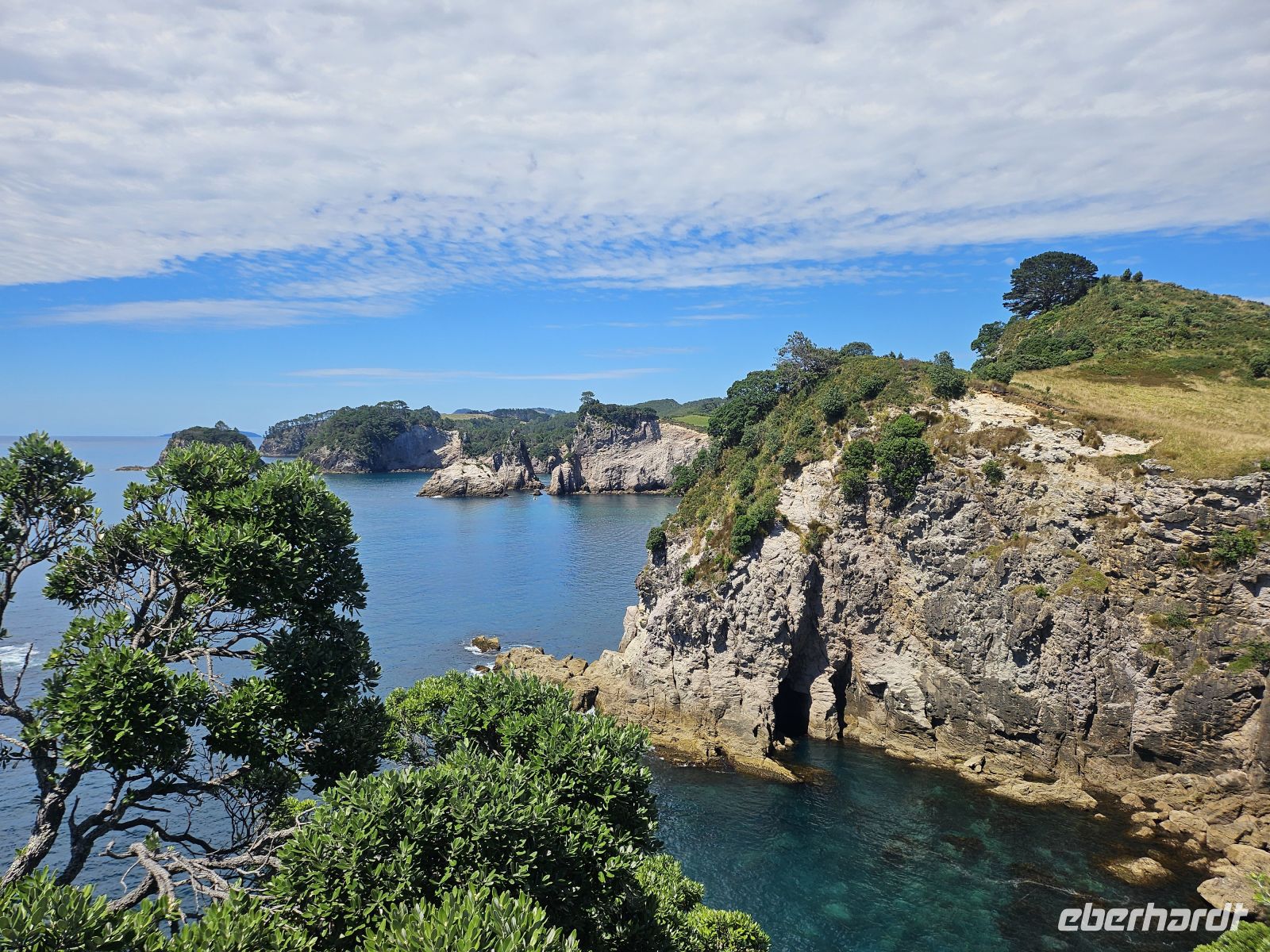 Ein Teil unserer Gruppe entscheidet sich spontan für eine Bootstour entlang der Küste bis zur Cathedral Cove. Vom Wasser aus eröffnen sich beeindruckende Perspektiven auf die Felsformationen, Buchten und das klare, türkisfarbene Meer. Der Rest von uns wandert gemütlich zum Aussichtspunkt oberhalb des Strandes und genießt von dort den weiten Blick über Küste und Pazifik.