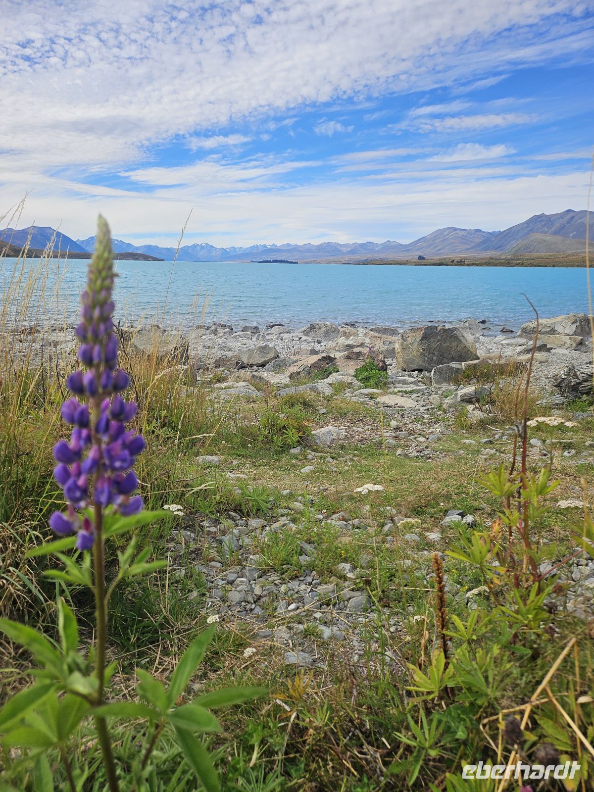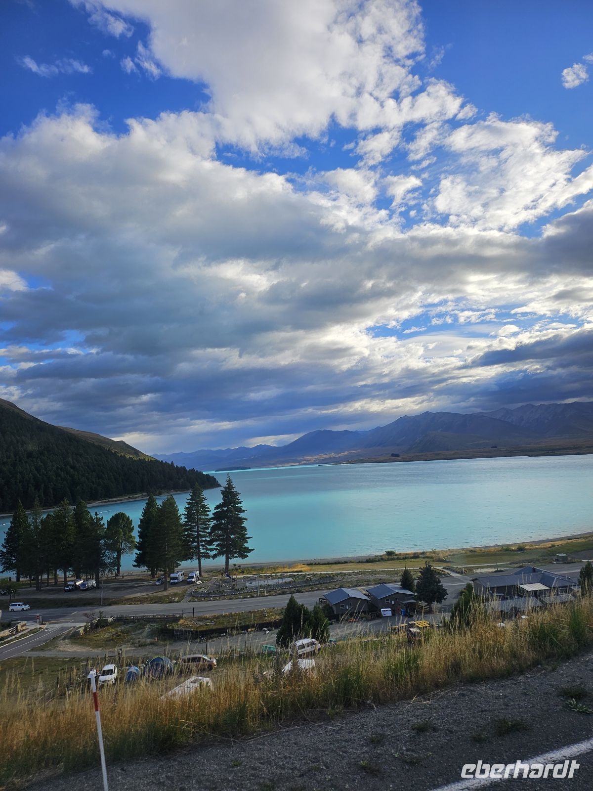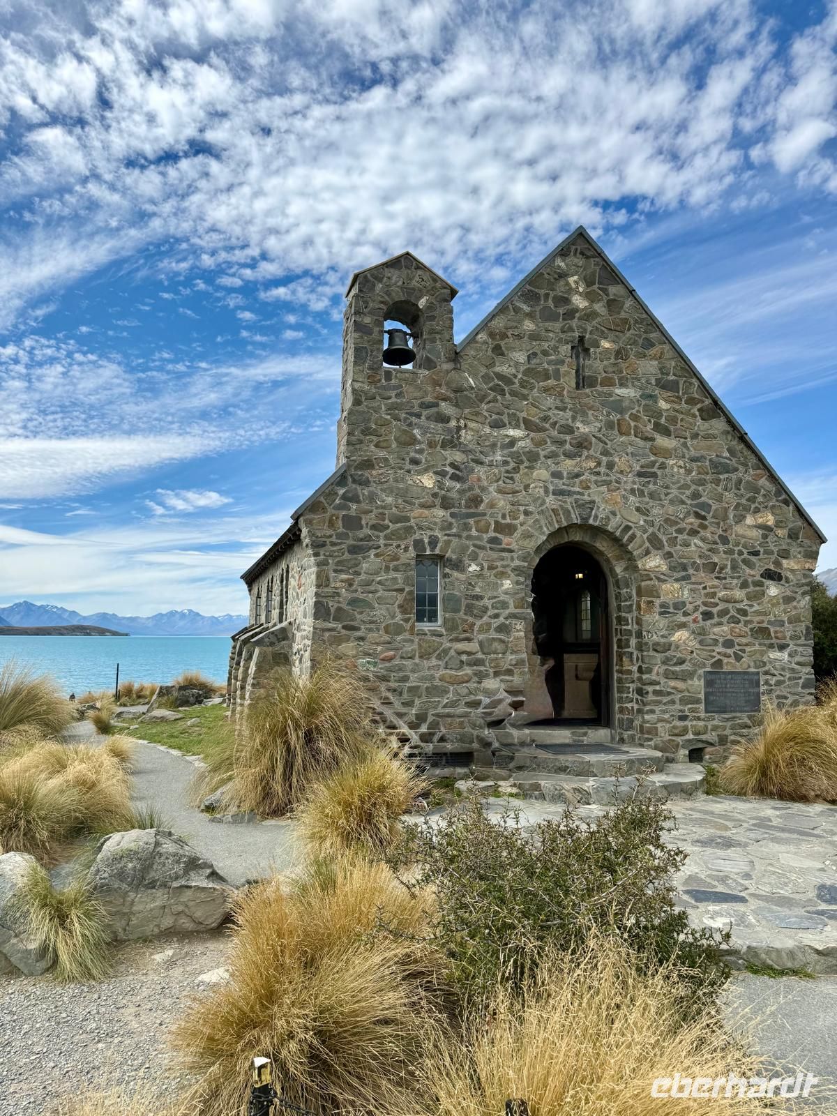 Am Nachmittag setzen wir unsere Fahrt fort und erreichen gegen 16:15 Uhr den Lake Tekapo. Schon aus der Ferne fällt die außergewöhnliche Farbe des Sees auf: ein intensives Türkis, das durch feinste Gesteinspartikel aus den Gletschern der Südalpen entsteht. Direkt am Ufer besuchen wir die kleine Church of the Good Shepherd, eine der meistfotografierten Kirchen Neuseelands, malerisch vor Bergkulisse und See gelegen.