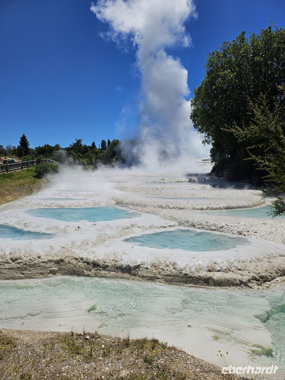 Am frühen Nachmittag besuchen wir die Wairakei-Terrassen, eine wunderschöne Anlage mit heißen, mineralhaltigen Kalksteinterrassen, die an die berühmten rosa und weißen Terrassen erinnern, die im 19. Jahrhundert durch einen Vulkanausbruch zerstört wurden. Nach einer Führung genießen wir eine kleine Pause mit Kaffee und Kuchen und können all unsere Fragen an eine Maori-Älteste loswerden, bevor wir unsere Reise fortsetzen.
