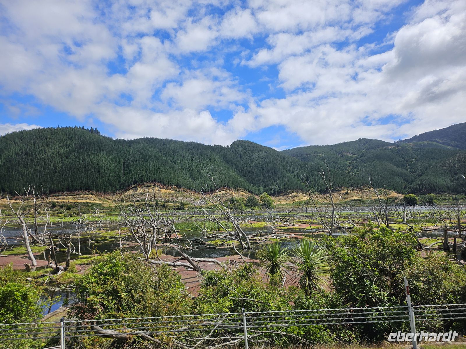Heute starten wir früh in Paihia und werden vom externen Anbieter abgeholt. Nach rund zwei Stunden Fahrt erreichen wir unseren ersten Stopp: Kaffeepause, Toiletten, ein kleiner Kauri-Shop – und vor allem der Wechsel auf einen geländegängigen Bus, denn ab jetzt wird’s „Neuseeland-typisch“.