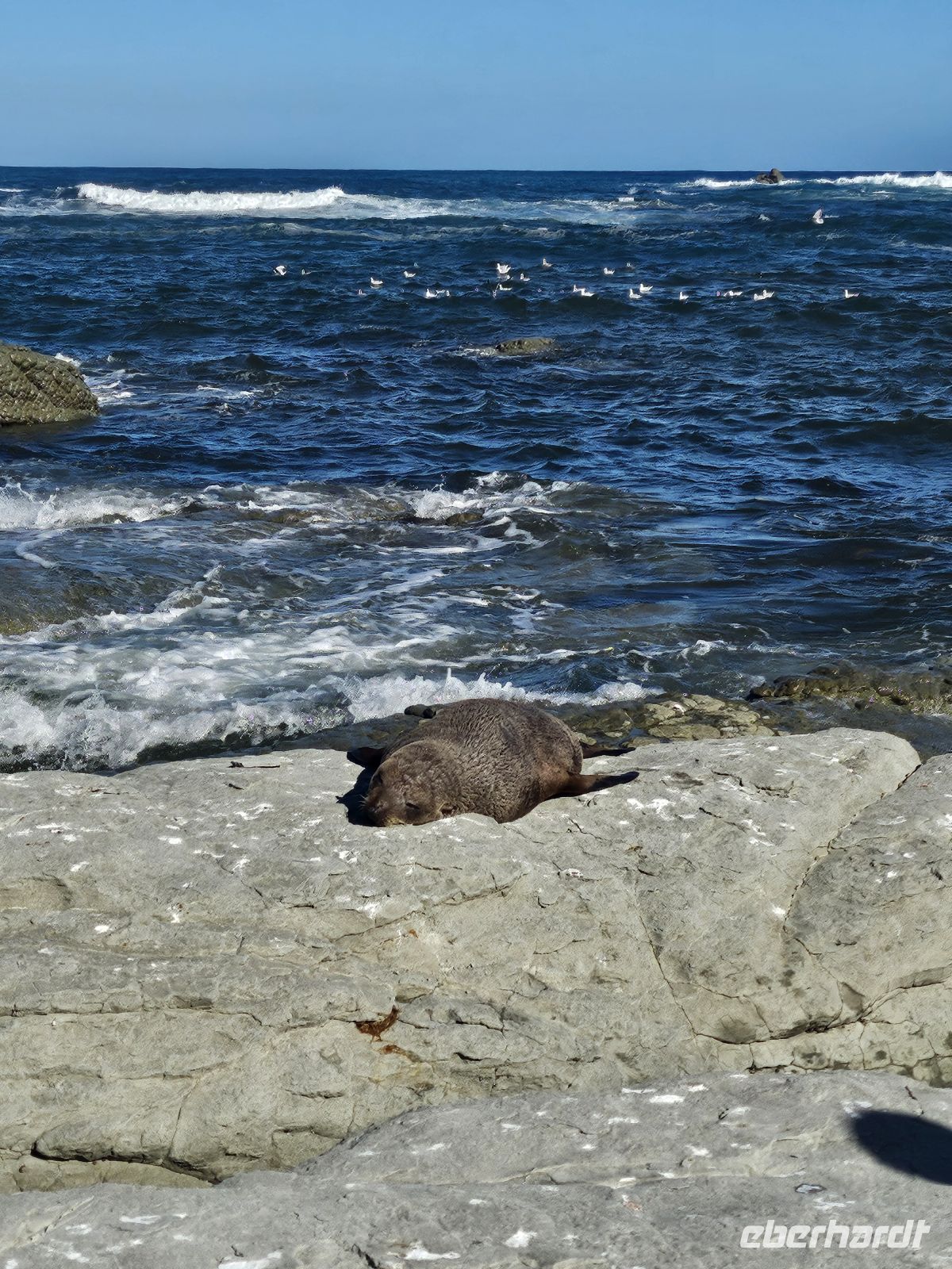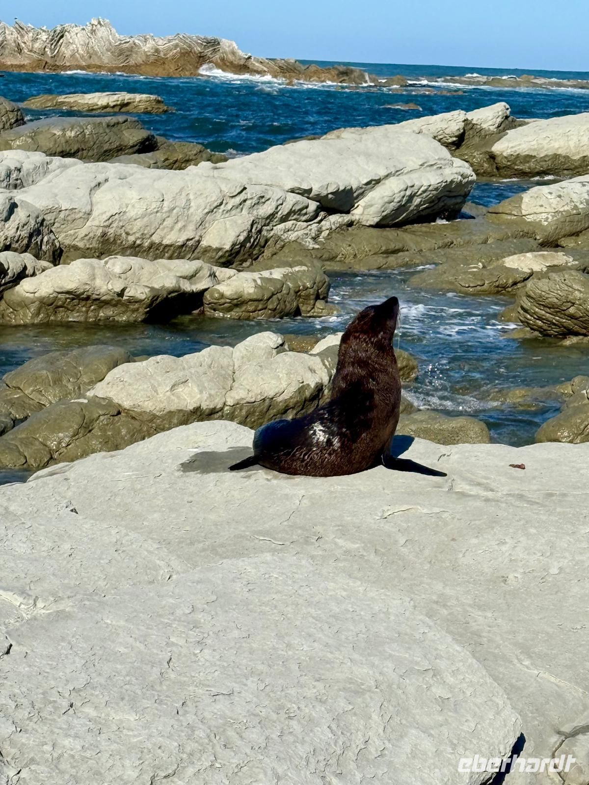 Der Rest von uns besucht währenddessen die nahegelegene Pelzrobbenkolonie. Ein kurzer Weg führt uns über felsiges Gelände zu den Tieren, die sich entspannt in der Sonne ausruhen.