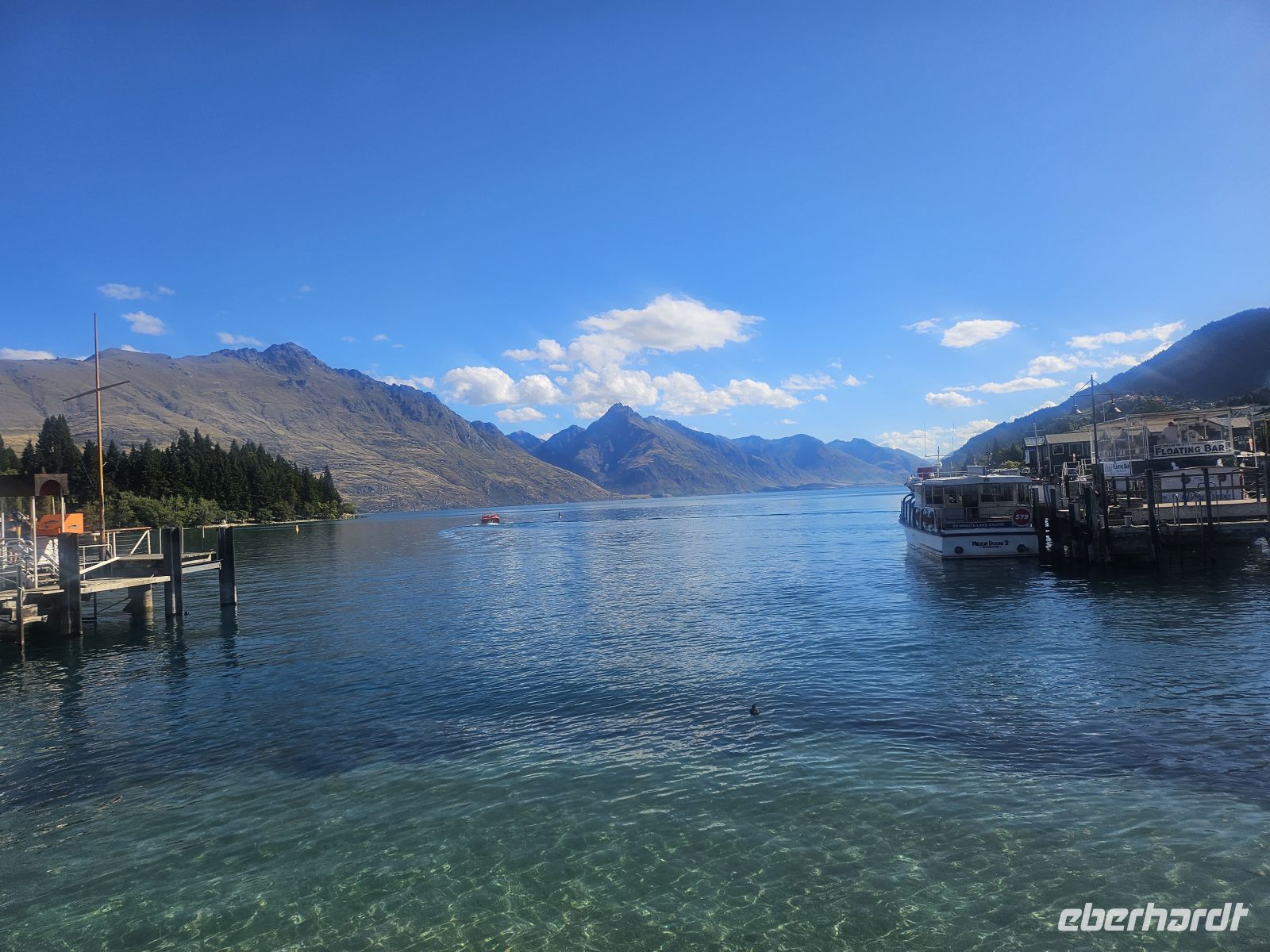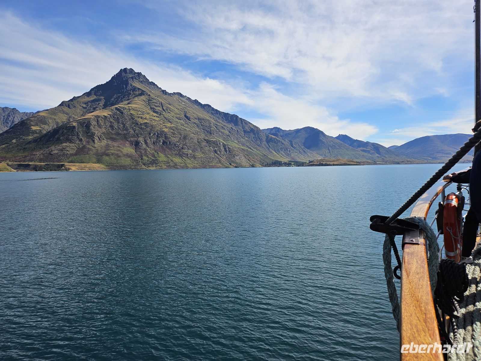 Am Nachmittag treffen wir uns wieder und laufen gemeinsam zum Schiffsanleger. Dort gehen wir an Bord der historischen TSS Earnslaw, einem über 100 Jahre alten Dampfschiff, das noch heute mit Kohle befeuert wird. Während der Überfahrt über den Lake Wakatipu können wir im Maschinenraum beobachten, wie die Dampftechnik funktioniert, oder an Deck die Berglandschaft genießen.