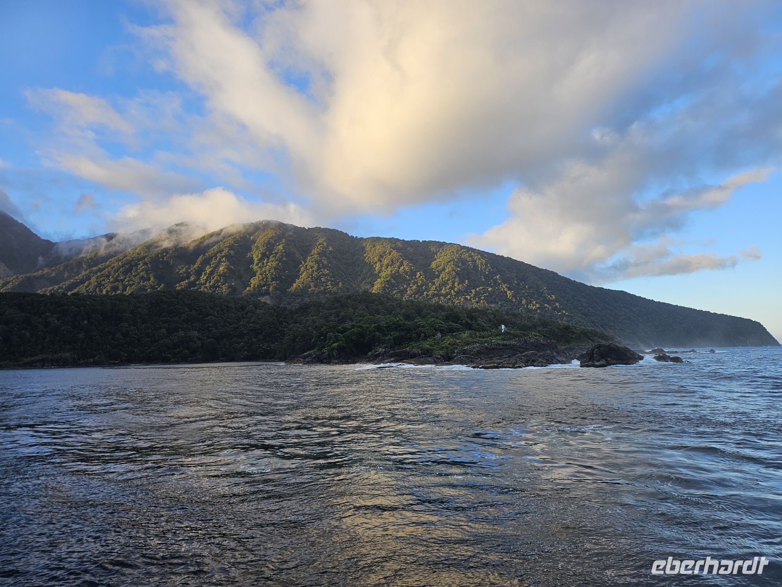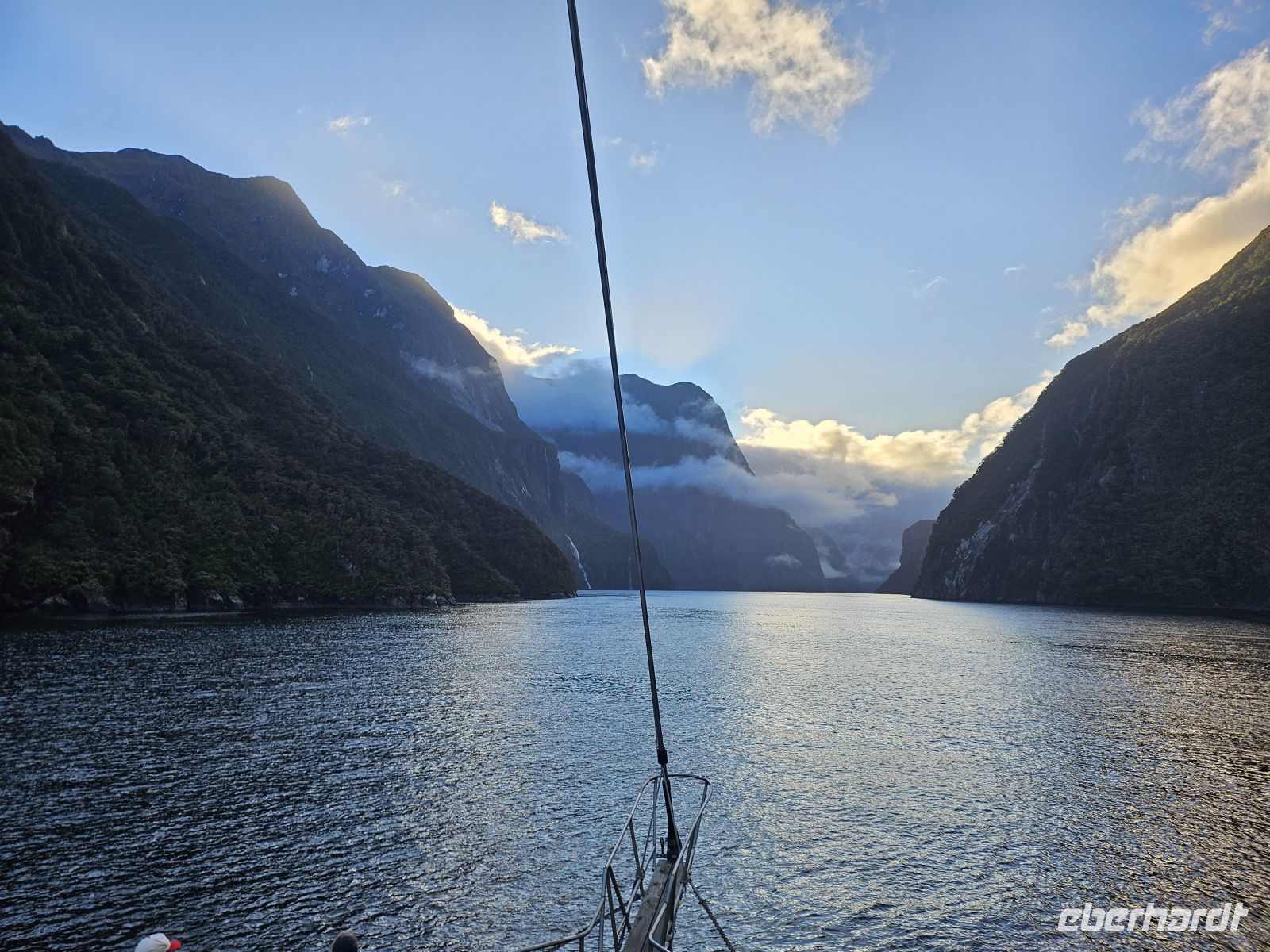 Der Morgen beginnt früh an Bord unseres Schiffes im Milford Sound. Beim Frühstück stoßen wir auf unser heutiges Geburtskind an und passend dazu kommt nun endlich auch die Sonne raus. So erleben wir, wie sich die Landschaft langsam verändert: Die ersten Sonnenstrahlen erreichen den Fjord, Nebel und Wolken ziehen sich zurück und geben den Blick auf steile Felswände und Wasserfälle frei. Während wir weiter durch den Fjord gleiten, begleiten uns plötzlich Delfine, die spielerisch vor dem Schiff herschwimmen, und wir entdecken Pelzrobben, die sich im Wasser treiben lassen.
