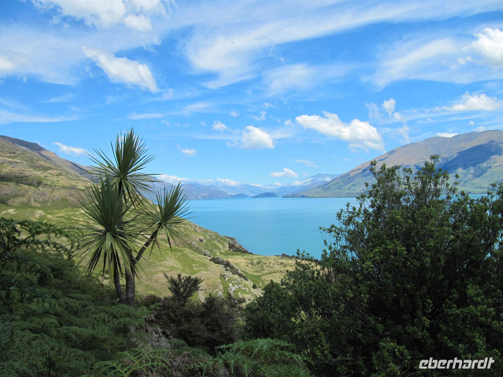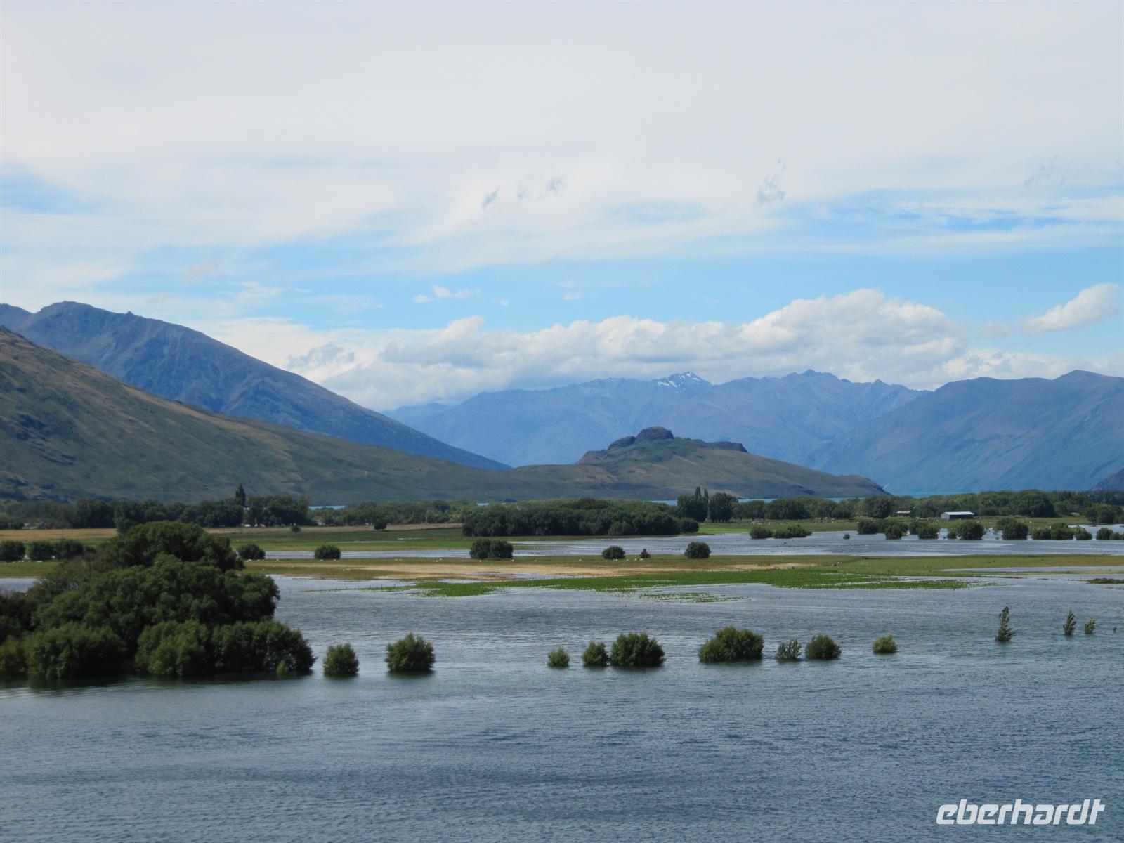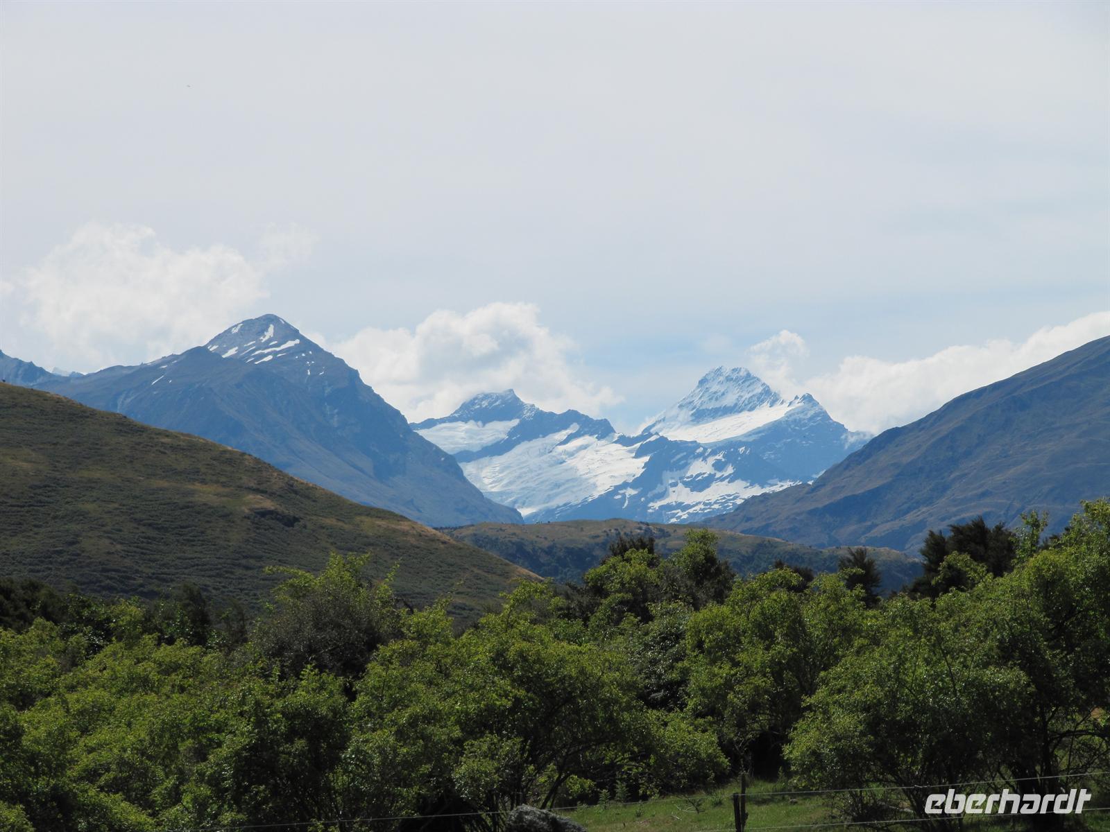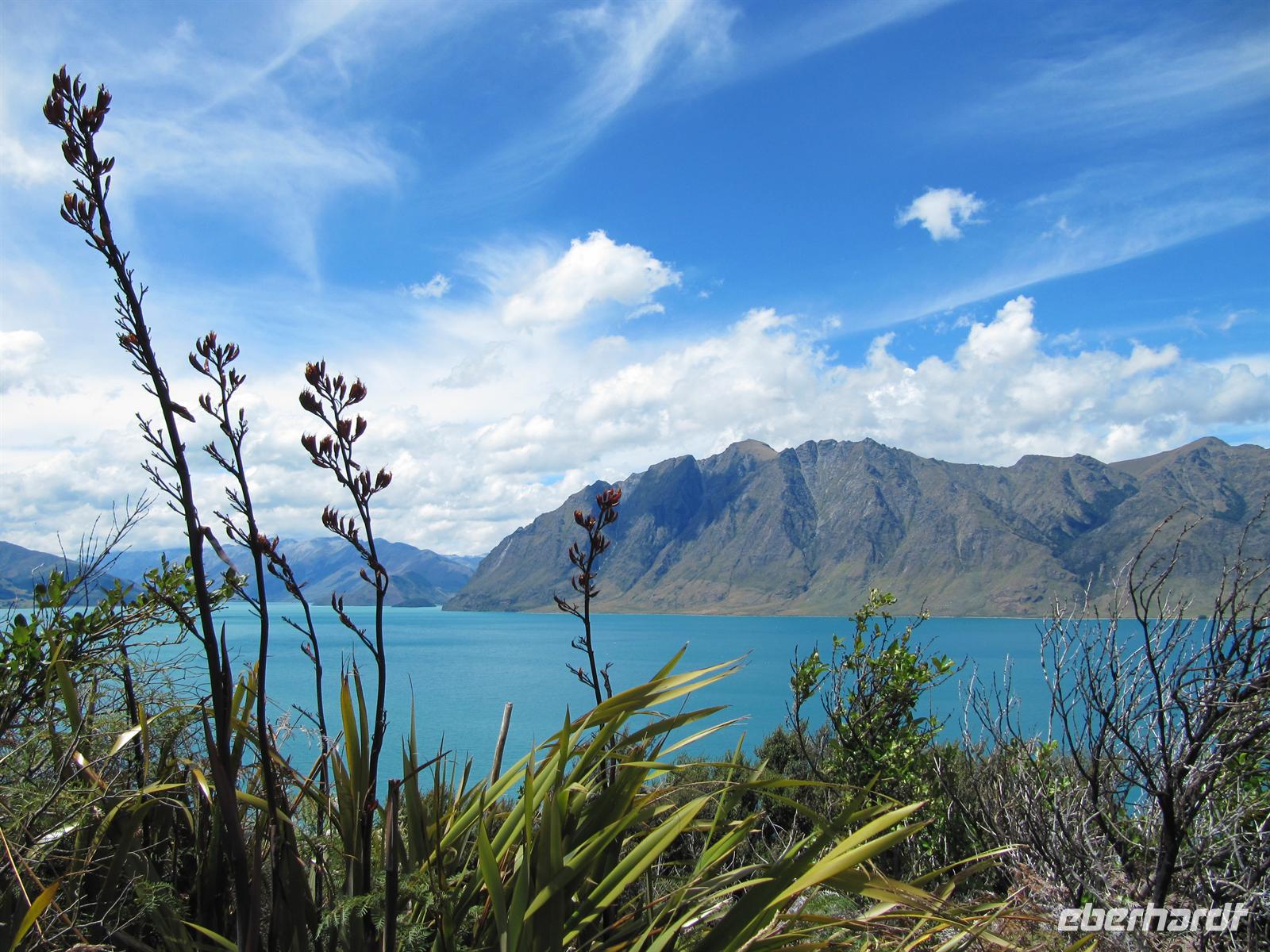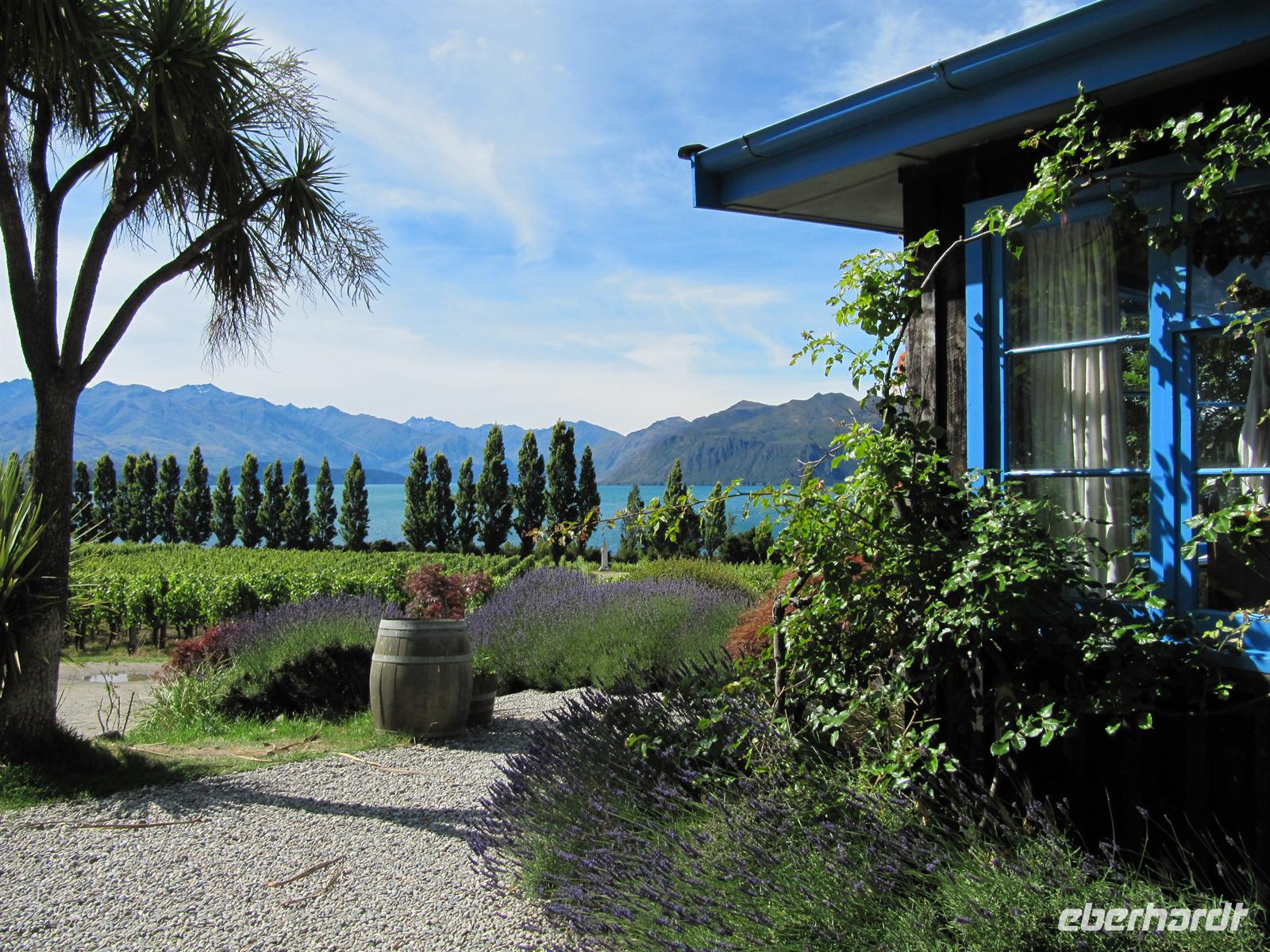 Die dichte Wolkendecke reißt auf und bald haben wir strahlenden Sonnenschein und blauen Himmel. Der Lake Wanaka begrüßt uns mit einem fantastischen Ausblick: türkis glitzerndes Wasser und steil aufragende Berge. Die Panoramaroute führt uns weiter am Lake Hawea bis in das hübsche Städtchen Wanaka. Wir verlängern unsere Tour entlang des Ufers und erkennen Landschaften aus der „Herr der Ringe“ Trilogie. Einen lohnenden Stopp legen wir am Weingut „Rippon“ ein und probieren einen köstlichen Gewürztraminer vor der Kulisse des Sees, der Weinberge, der schneebedeckten Gipfel, garniert mit duftenden Lavendelbüschen. Herrlich!