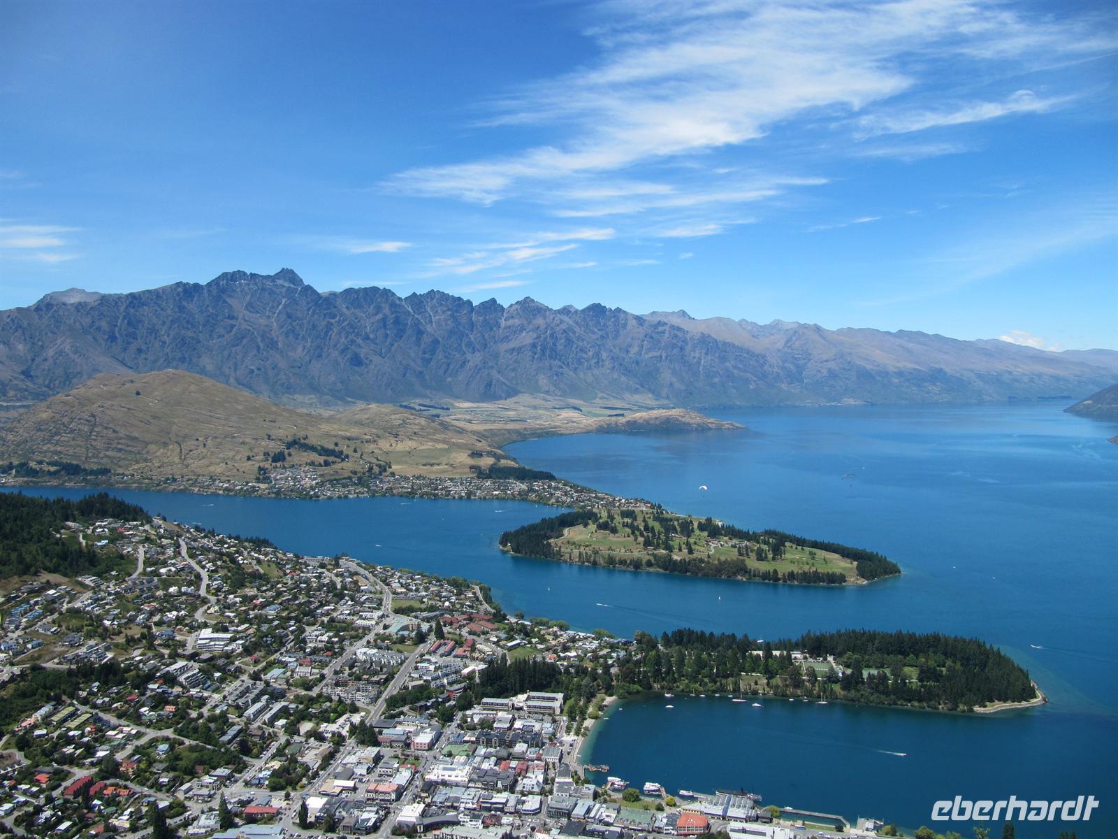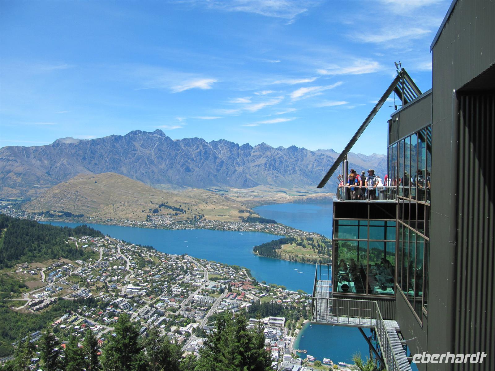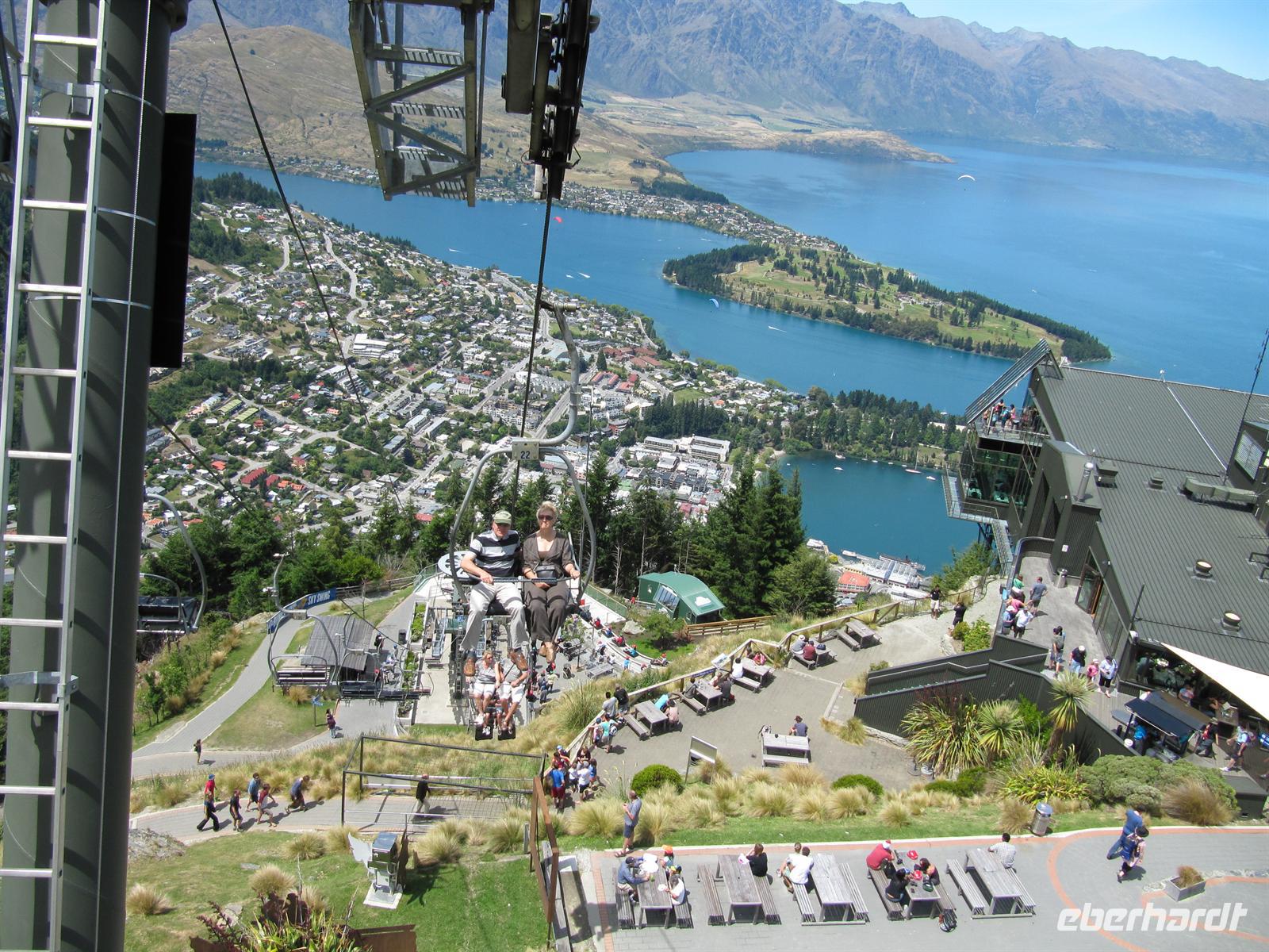 Bilderbuchwetter! Der Blick auf die Bergkette der Remarkabels, den tiefblauen See Wakatipu und die Stadt ist einfach fantastisch! Wer möchte kann die „Abfahrt“ abenteuerlich per Gleitschirm absolvieren. Es gibt wohl keinen besseren Ort und keinen besseren Tag als hier und heute.