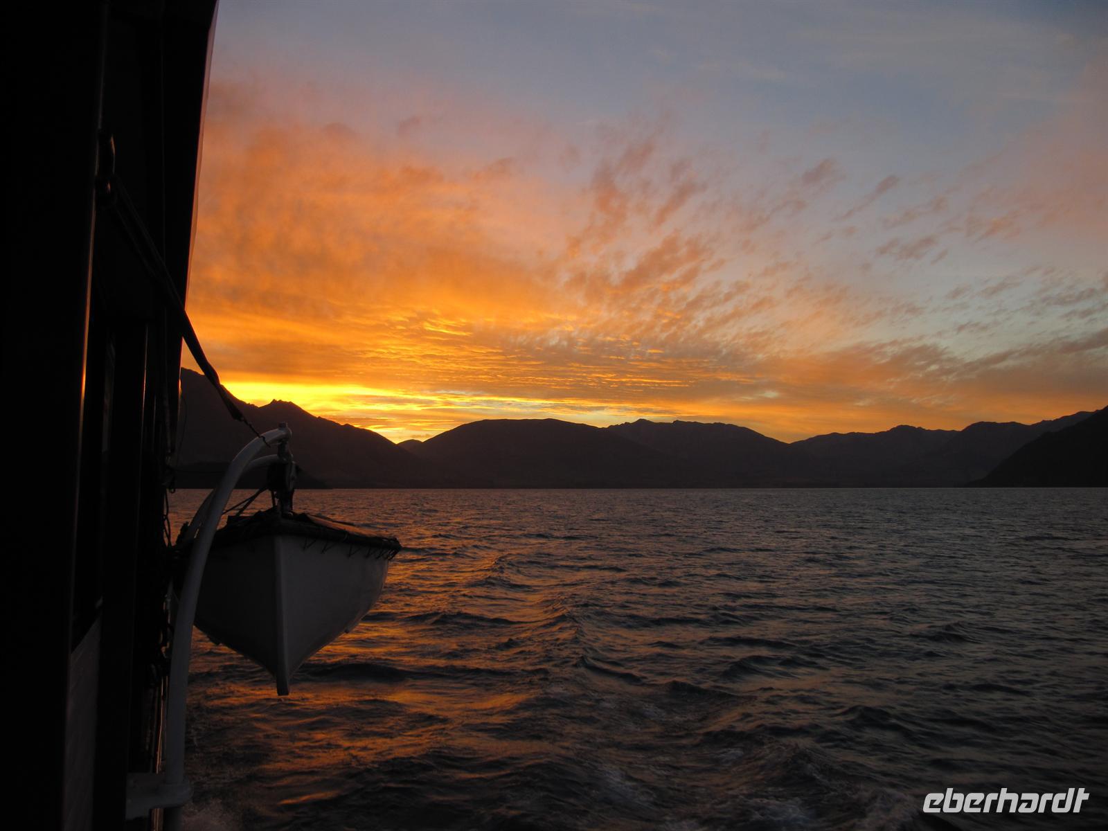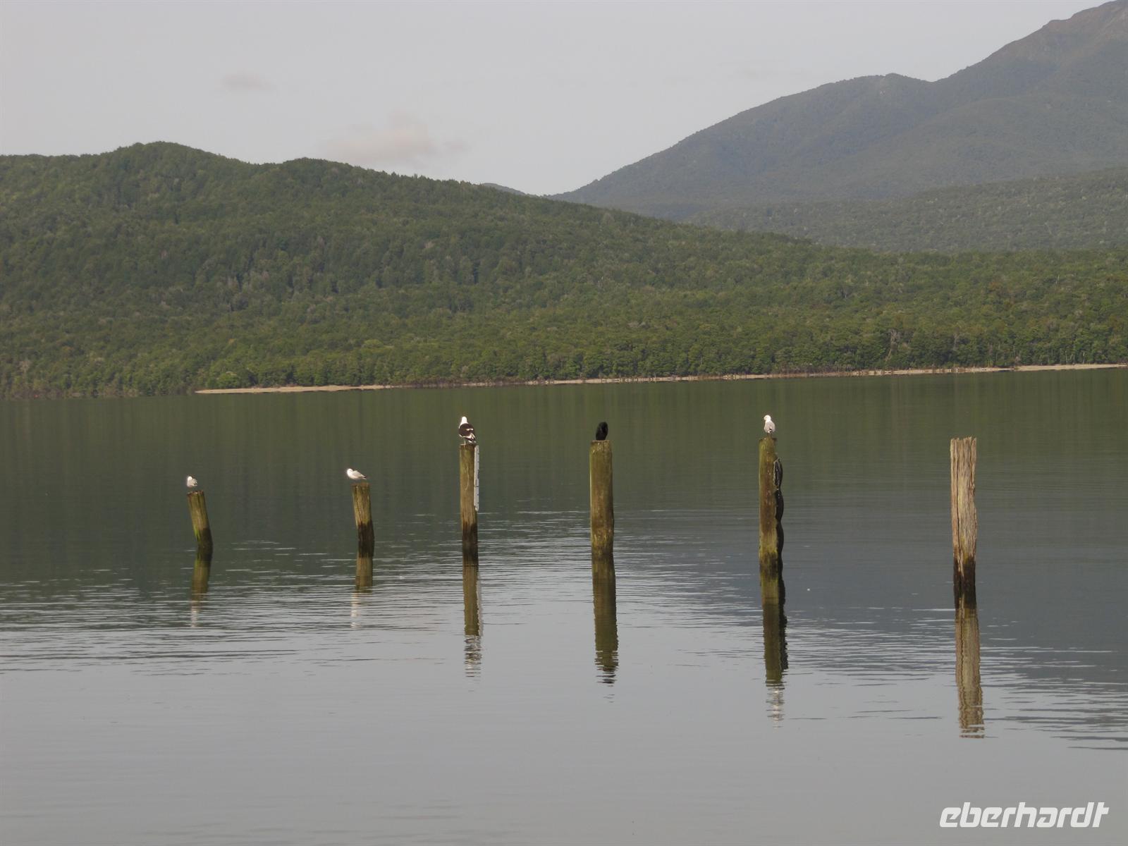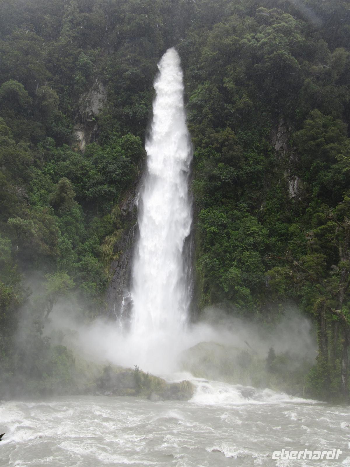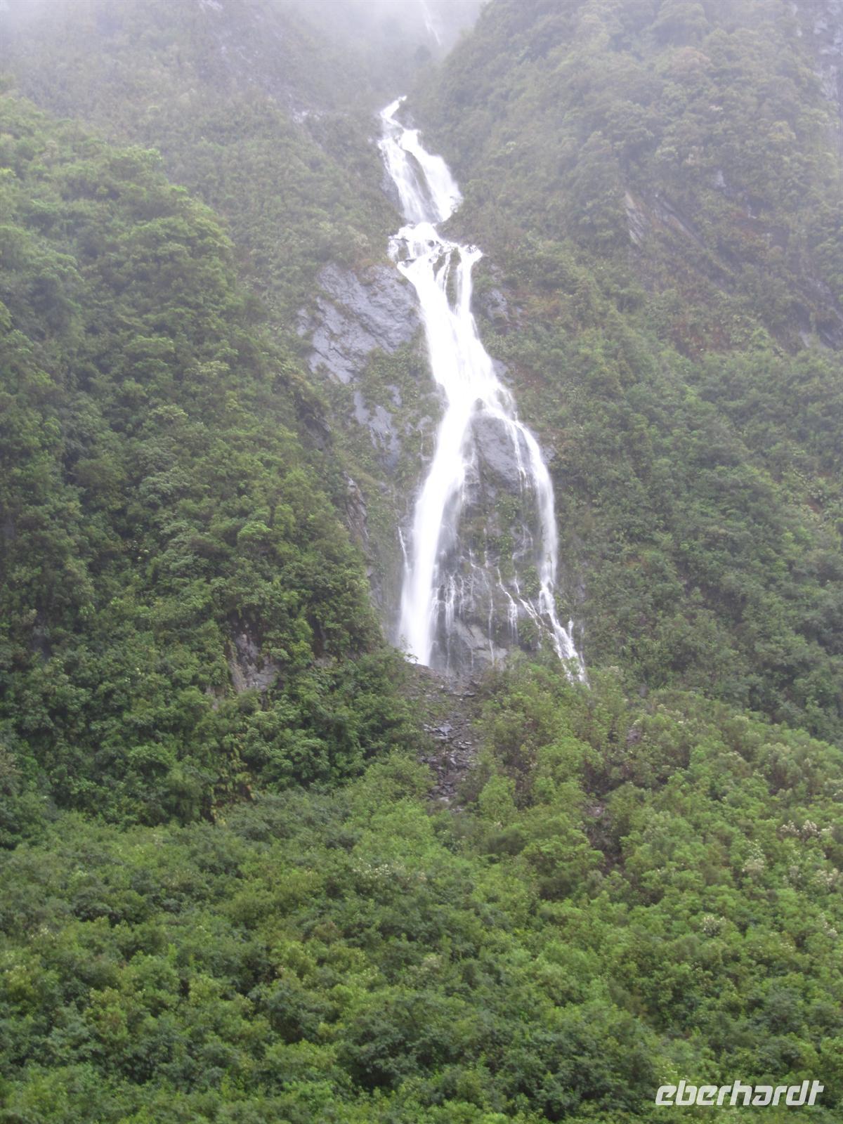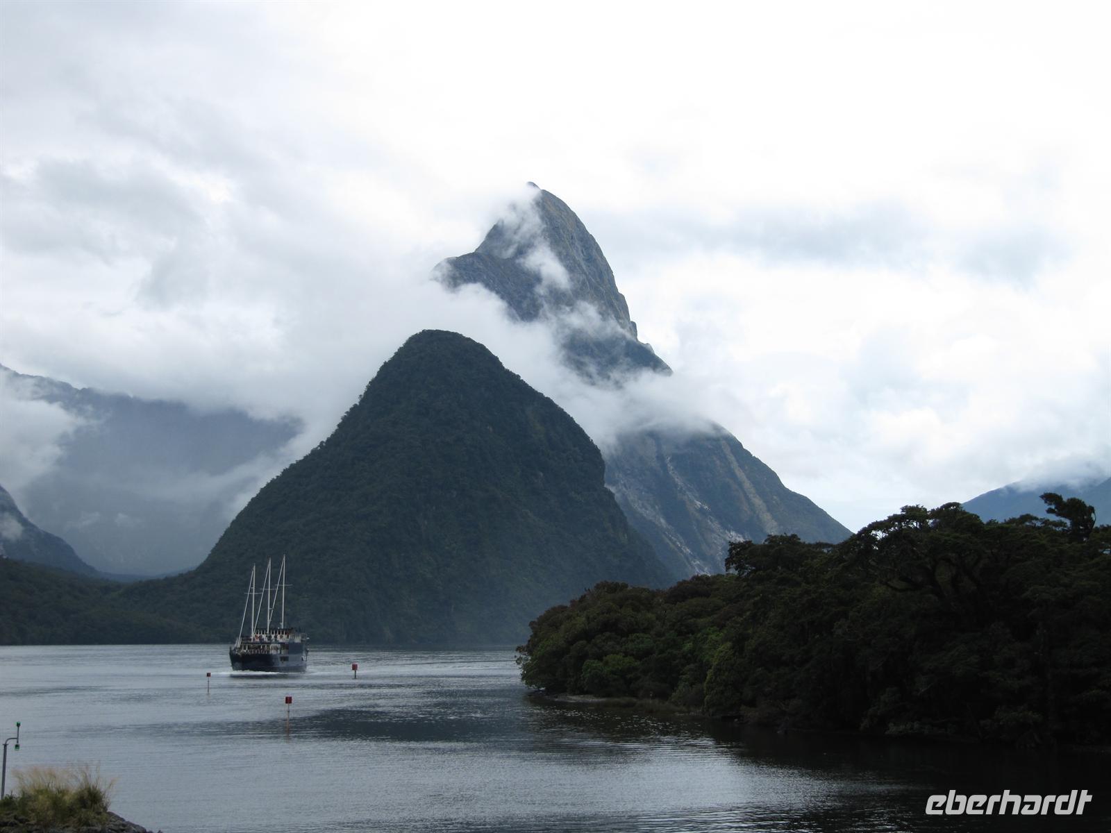 Durch das weite Eglington Tal windet sich die Straße in das schmale Hollyford Tal. Die grauen Felswände steigen steil auf und die Gipfel verstecken sich in den Wolken. Durch den Homer-Tunnel gelangen wir schließlich in das dritte und letzte Tal, bis wir den Milford Sound erreichen. Hier wartet bereits unser Schiff, die „Sovereign“ auf uns. Punkt 13.00 Uhr heißt es „Leinen los“! Auf dem Oberdeck genießen wir das einmalige Panorama auf die steilen Felswände, die Wasserfälle und die Vegetation. Es hat etwas Mystisches, wenn die Wolken und Nebelschwaden die Berggipfel umarmen. Das Schiff wagt sich beängstigend nah an die Stirling Falls heran und schwuppdiwupp bekommen wir eine kleine Erfrischung. Die Zeit an Bord vergeht wie im Flug. Apropos, bis zum Anlegen hoffen wir immer noch auf unseren gebuchten Rückflug. Leider heißt die Nachricht, dass alle Flüge wegen des Regens abgesagt werden mussten. Das heißt für uns vier Stunden Busfahrt zurück nach Queenstown. Den ereignisreichen Tag lassen wir bei einem prima Abendessen im Restaurant „Brittania“ ausklingen.