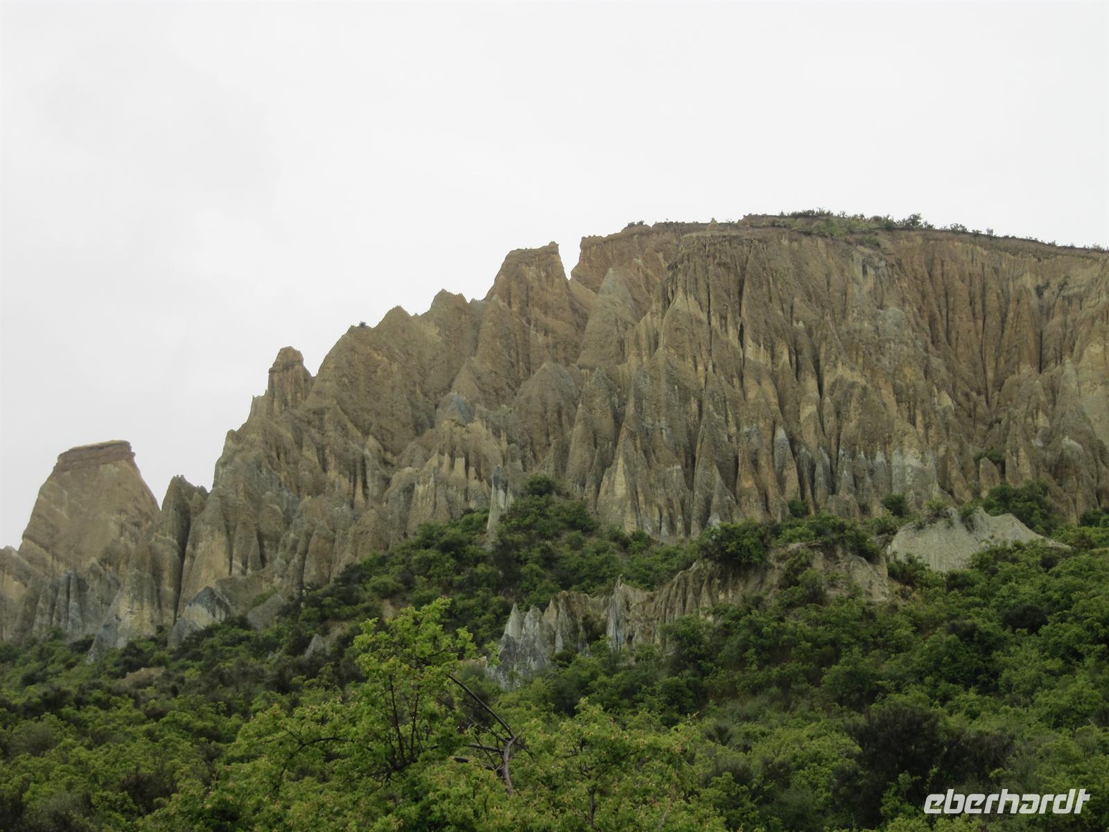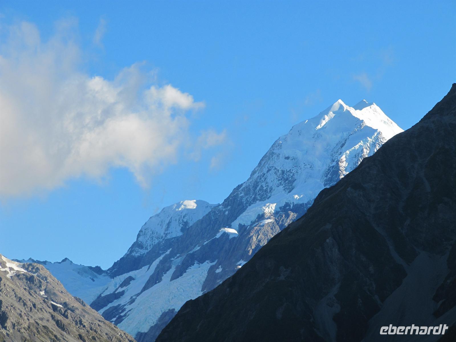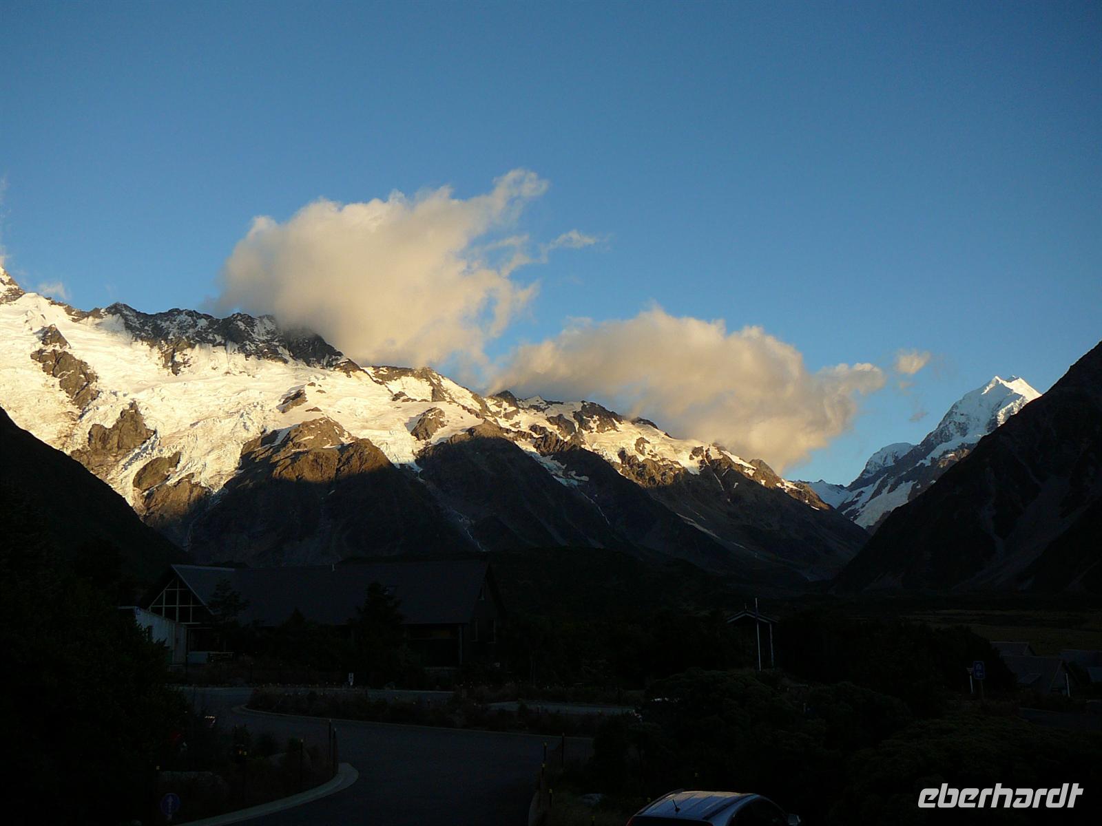 Wir verlassen Queenstown bei Regenwetter. In Cromwell legen wir einen Stopp bei der Obstscheune ein und probieren allerlei Leckereien. Weiter geht die Fahrt über den Lindis-Pass, wo sich uns eine karge, hügelige Landschaft präsentiert. Es ist eigentlich eine der trockensten Regionen des Landes, wo sich besonders die Merino-Schafe mit ihrer wertvollen Wolle wohl fühlen, aber heute hängen die Wolken tief und es regnet mal mehr und mal weniger. Nahe Omarama machen wir einen Abstecher zu den bizarren Lehmfelsen „Clay Cliffs“. Das Wetter erlaubt eine kurze Wanderung vorbei an Hagebutten-Büschen zu den verwitterten Steintürmen. Je näher wir Mount Cook kommen, desto besser wird das Wetter schließlich. Die schroffen Berge erscheinen wie ein Gemälde zwischen den Wolken und der Lake Pukaki glitzert milchig blau. Dennoch ist unser Helikopterflug heute leider nicht möglich. Der „Aoraki“ versteckt sich in den dichten Wolken. Wir beziehen unsere Lodge und erkunden das Dorf und das Besucherzentrum mit einer interessanten Ausstellung.