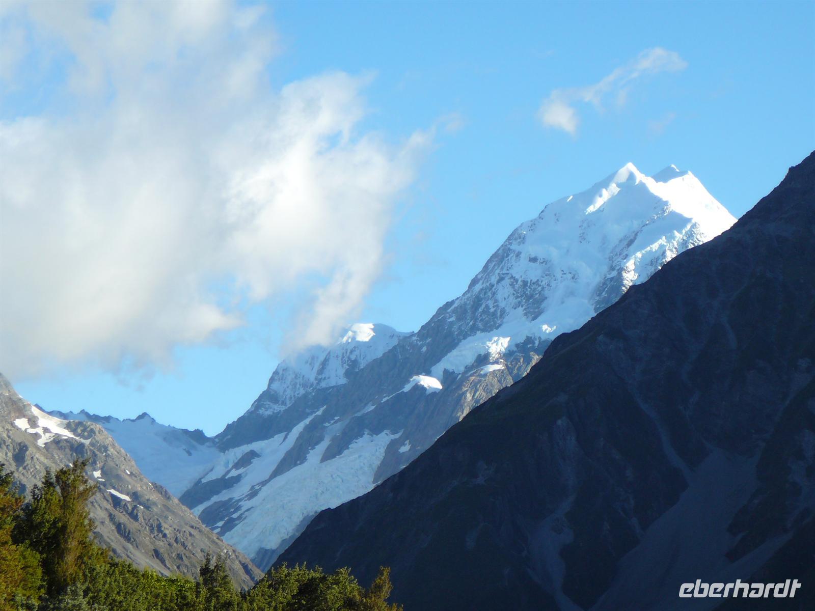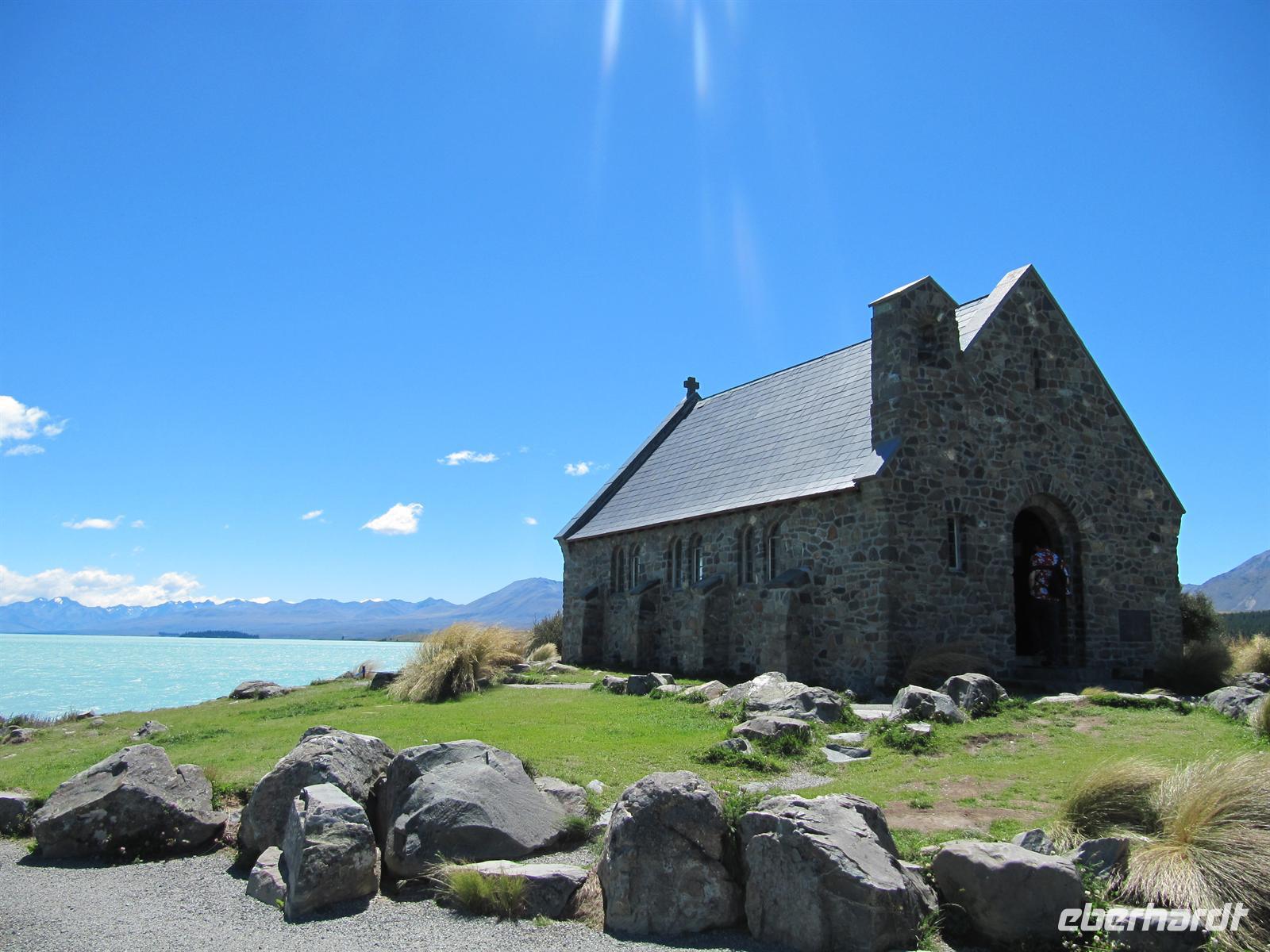 Fünf Minuten dauert ein gutes Ei! Zum Frühstück gibt es außerdem frischen Lachs, den wir am Vortag auf einer Lachsfarm erstanden haben - das ganze mit herrlichem Panoramablick zum höchsten Berg Neuseelands, dem majestätischen Mount Cook. Die Aussicht ist fantastisch, doch der Schein trügt, denn kräftiger Wind macht uns wieder einen Strich durch die Rechnung bezüglich des Fliegens. Bei einer kurzen Wanderung in Richtung Hooker Valley bestaunen wir die Erhabenheit der Natur. Vorbei am Lake Pukaki gelangen wir zum ebenso leuchtend blauen Gletschersee Lake Tekapo, wo idyllisch am Ufer die kleine Kirche „The Church of the good Shepherd“ steht. Die trockene Landschaft wechselt schließlich in fruchtbares Farmland. Am Nachmittag unternehmen wir eine leichte Wanderung im Peel Forest bis auch der letzte weiß, wie ein Totara-Baum aussieht. Die bis zu 1.000 Jahre alten Baumriesen wurden von Maori zum Kanu-Bau und für Schnitzereien genutzt. Die frühen Siedler wussten sich mit mobilen Sägewerken, „Saw Pits“, zu helfen - eine mühsame Arbeit. Schließlich führt unser Weg heute zur Farm, wo wir übernachten. Unsere Gastgeber Ken und Lissy sorgen sich herzlich um unser Wohl. Nach einer kurzen Führung auf der Farm plaudern wir auf der Veranda. Das alte Herrenhaus von 1910 gleicht einem Museum.