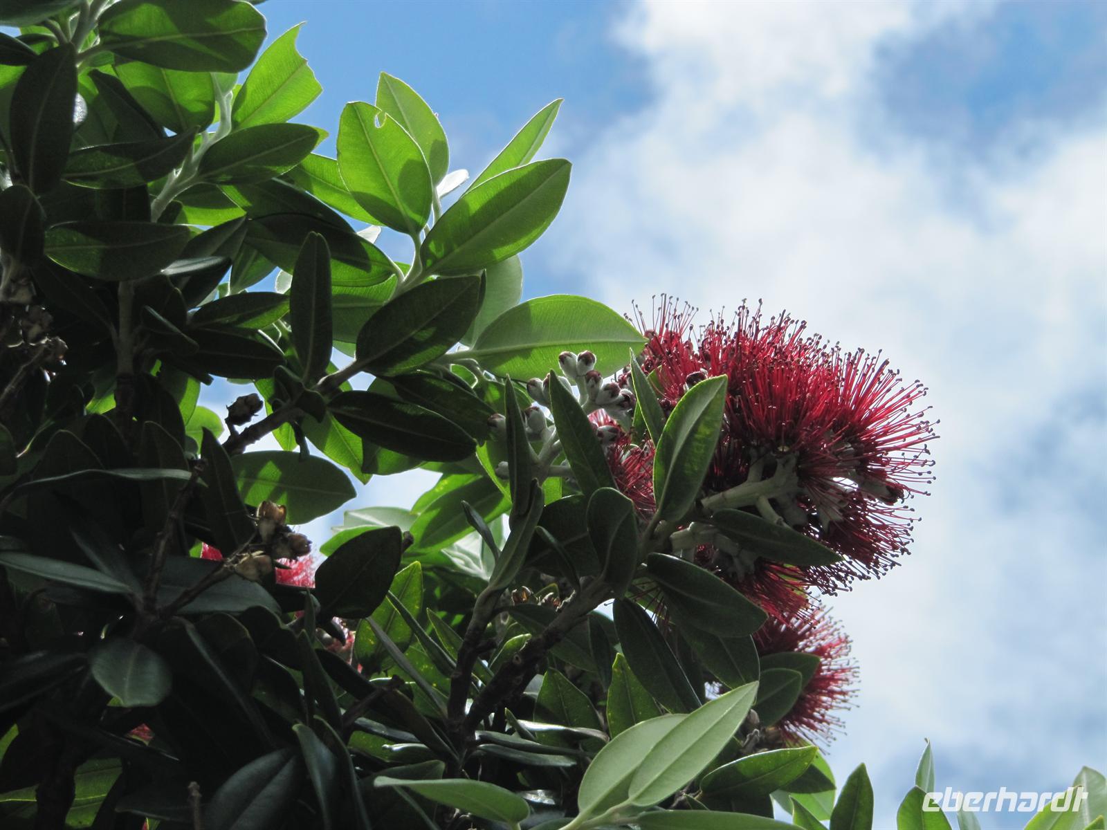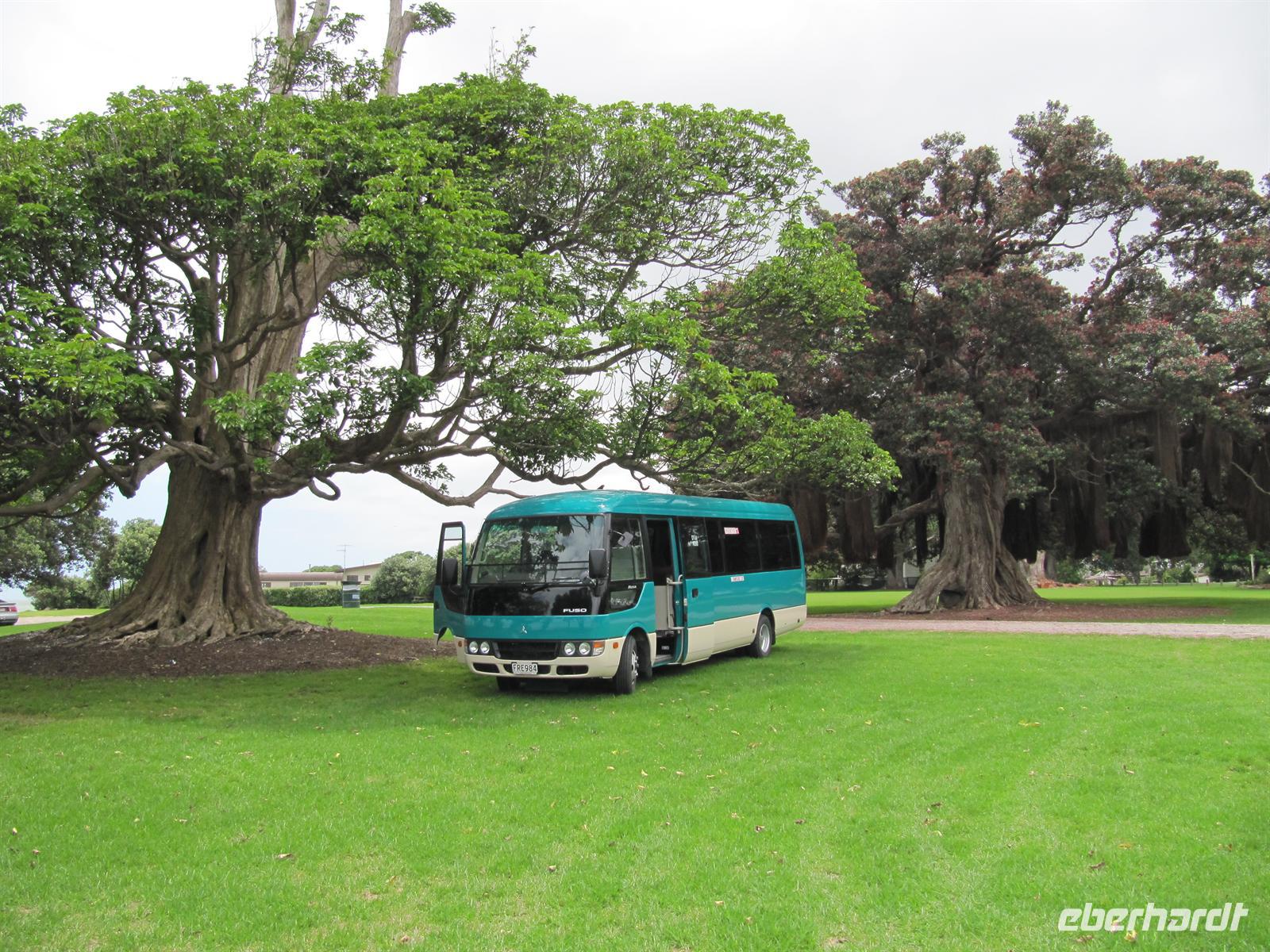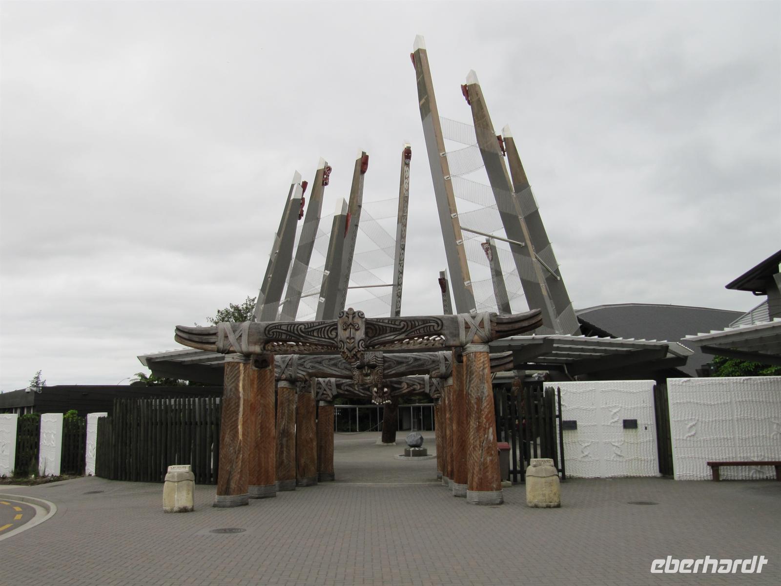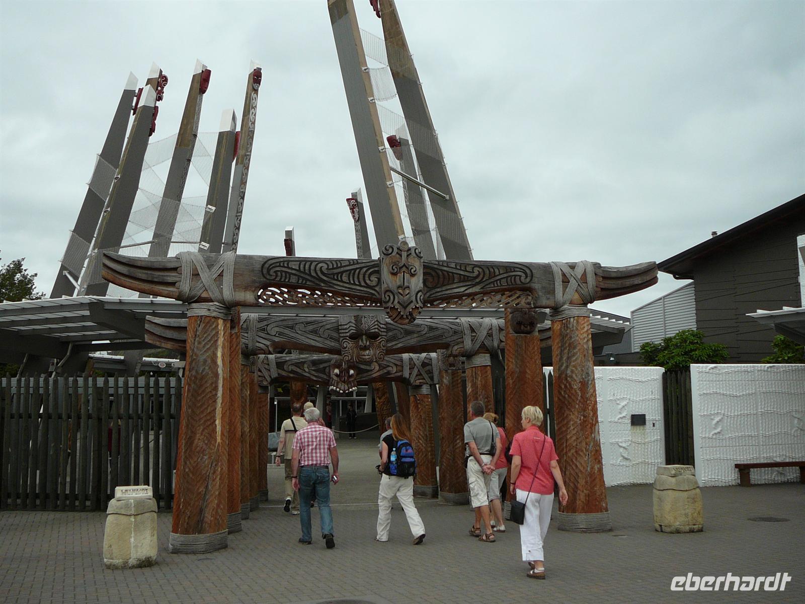 Es ist Heilig Abend, aber bei 30 Grad und Sonnenschein kommt irgendwie kein richtiges Weihnachtsgefühl auf. Nach dem Frühstück machen wir uns auf den Weg, um die riesigen Kauri-Bäume zu entdecken. Eine leichte Wanderung durch den Wald führt uns zu den siamesischen Kauri-Bäumen und schließlich zu einer Gruppe von acht gigantischen Kauris. Die Bäume sollen um die 600 Jahre alt sein und einen Durchmesser von 2,20 Meter haben. Neben diesen Riesen kommt man sich einfach nur klein vor. Unser Reiseleiter Bernd zeigt uns weiterhin Rimu, Silberfarne, Baumfarne, Kahikatea und zarte Orchideen. Wir lauschen einem Tui, dem Pastorenvogel, und freuen uns über die niedlichen Fantails (Fächerschwänze). Wir verlassen die zauberhafte Halbinsel Coromandel und durchqueren Betlehem (es ist schließlich Heilig Abend!) und das Kiwi-Land mit unzähligen Kiwi-Plantagen bis wir Rotorua erreichen. Ja, man riecht es lange bevor man es erreicht. Im Te Puia bestaunen wir farbige Sinterterrassen, brodelnde Schlammtöpfe, dampfende Fumarolen und den drolligen Kiwi. Den Heiligen Abend verbringen wir bei den Maori und erleben Tanz- und Gesangsvorführungen und genießen das leckere Hangi, ein Essen aus dem Erdofen. Frohe Weihnachten!