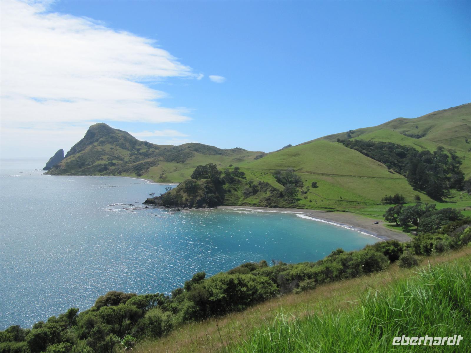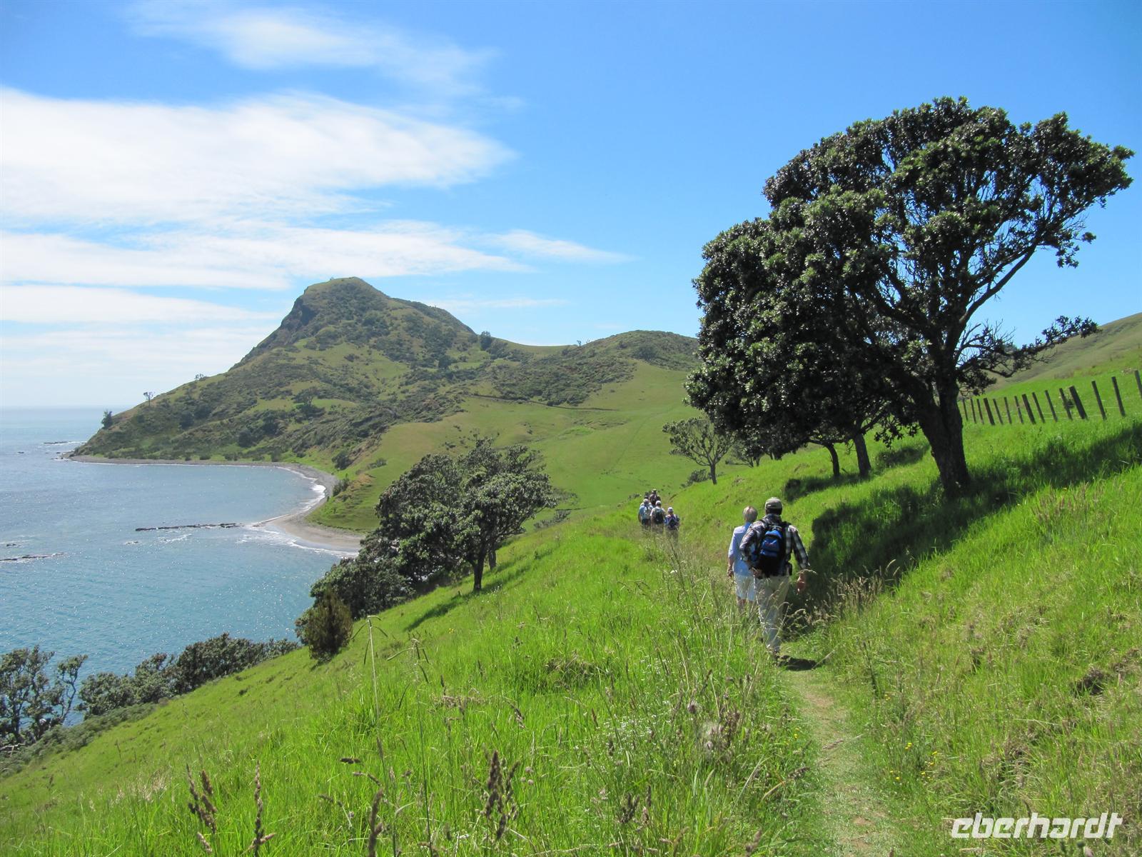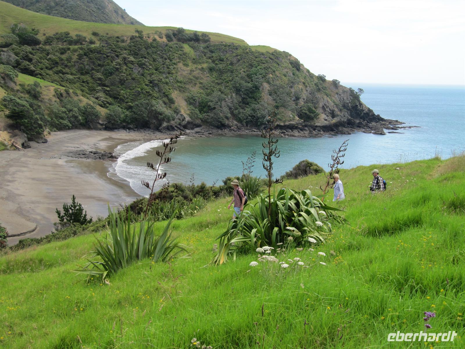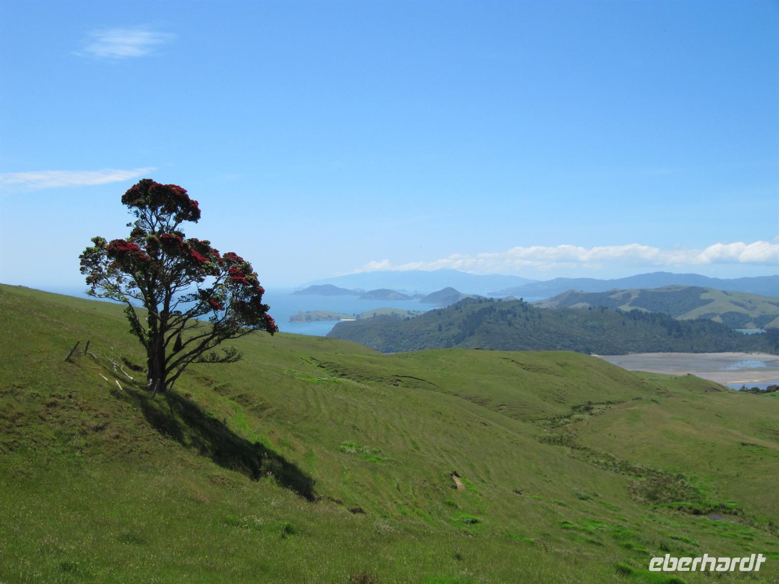 Der ganze Tag ist der zauberhaften Halbinsel Coromandel gewidmet. Immerhin zählt sie zu den 3 schönsten Regionen der Nordinsel. Die Reise führt uns entlang der traumhaften Westküste. Hinter dem kleinen Städtchen Colville (nur 22 Häuser) beginnt die kurvige Schotterstraße. Die Straßen sind gesäumt von uralten, knorrigen, rot blühenden Pohutukawa-Bäumen - ein fantastischer Kontrast zum türkisblauen Wasser, dem strahlend blauen Himmel und den grünen Hügeln, auf denen glückliche Kühe weiden (sie müssen wohl glücklich sein an so einem herrlichen Fleckchen Erde!). An der Fletcher Bay beginnt unsere Wanderung über das hügelige Farmland - man meint die Wiesen seien mit einem Samtteppich überzogen. Immer wieder blitzen die roten Blüten des neuseeländischen Weihnachtsbaumes bis wir durch üppig grünen Wald abwärts gehen. Bernd zeigt uns unter anderem die einzige Palme Neuseelands, die Nikau-Palme, sowie essbare Schlingpflanzen, der „Supple Jack“. Nach 1,5 Stunden erreichen wir die Poley-Bucht, wo wir Rast machen: Zeit zum Muscheln sammeln, plaudern und zum Bestaunen der vulkanischen Felsformationen. Wir wandern zurück zum Ausgangspunkt und stellen fest, dass uns kaum jemand begegnet ist - ein echter Geheimtipp im „Niemandsland“! Wir können uns gar nicht satt sehen an der herrlichen Landschaft. Auf dem Rückweg zum Hotel stoppen wir auf einen Cappucino in Colville. Am Abend genießen wir wiederum Köstlichkeiten frisch vom Grill.