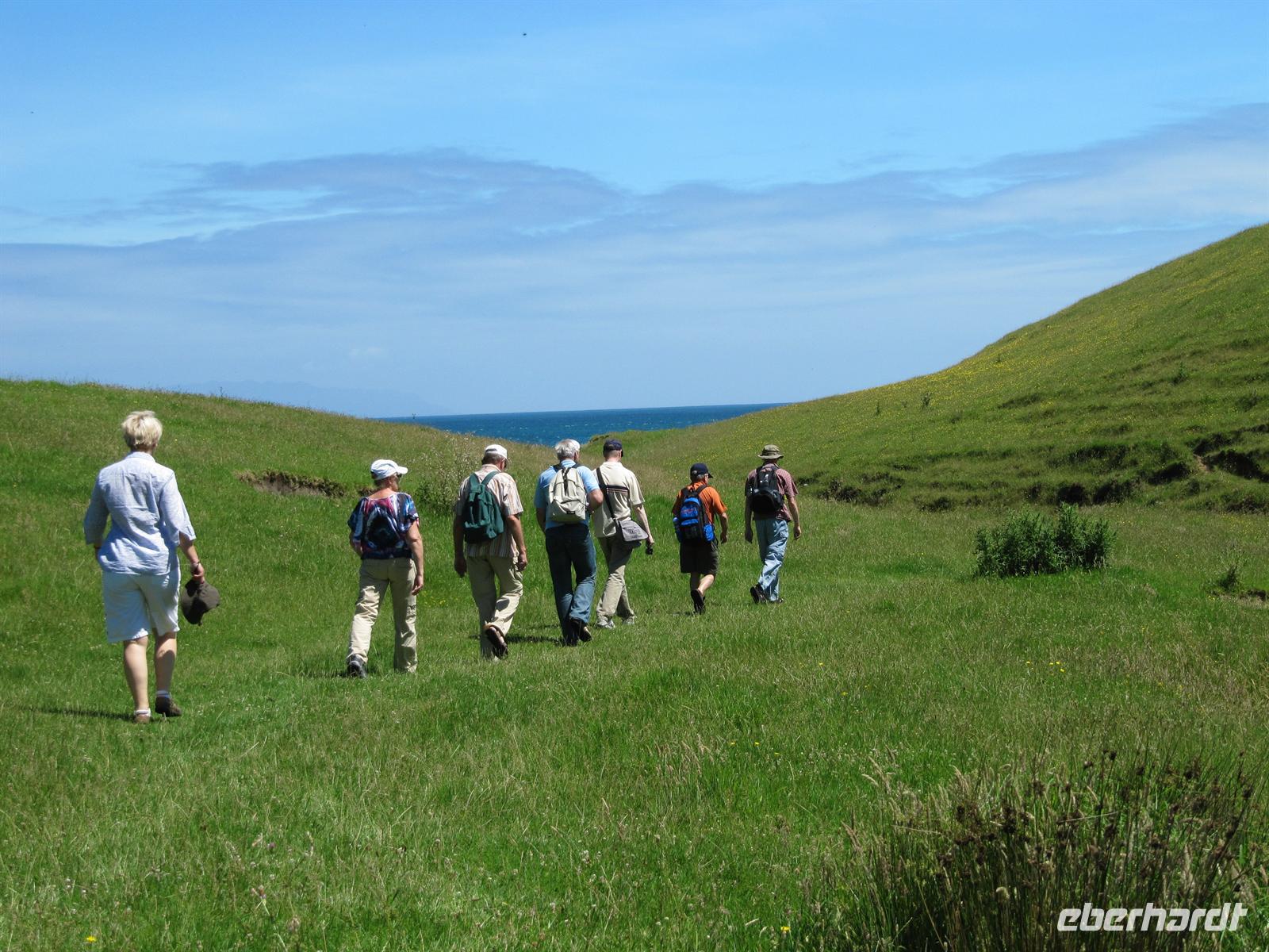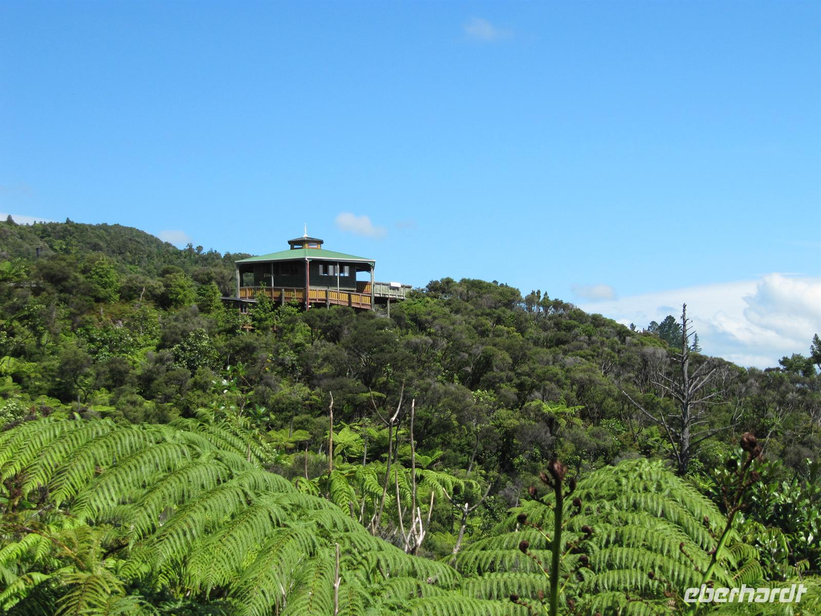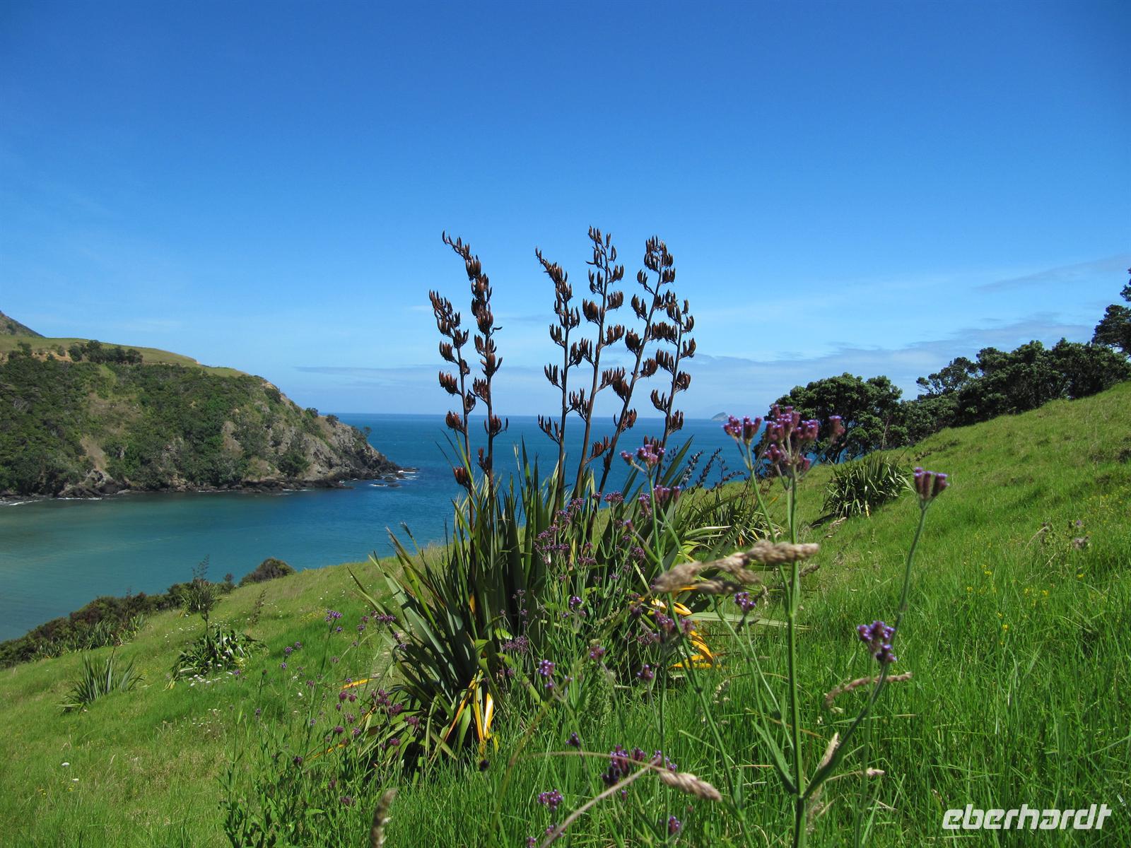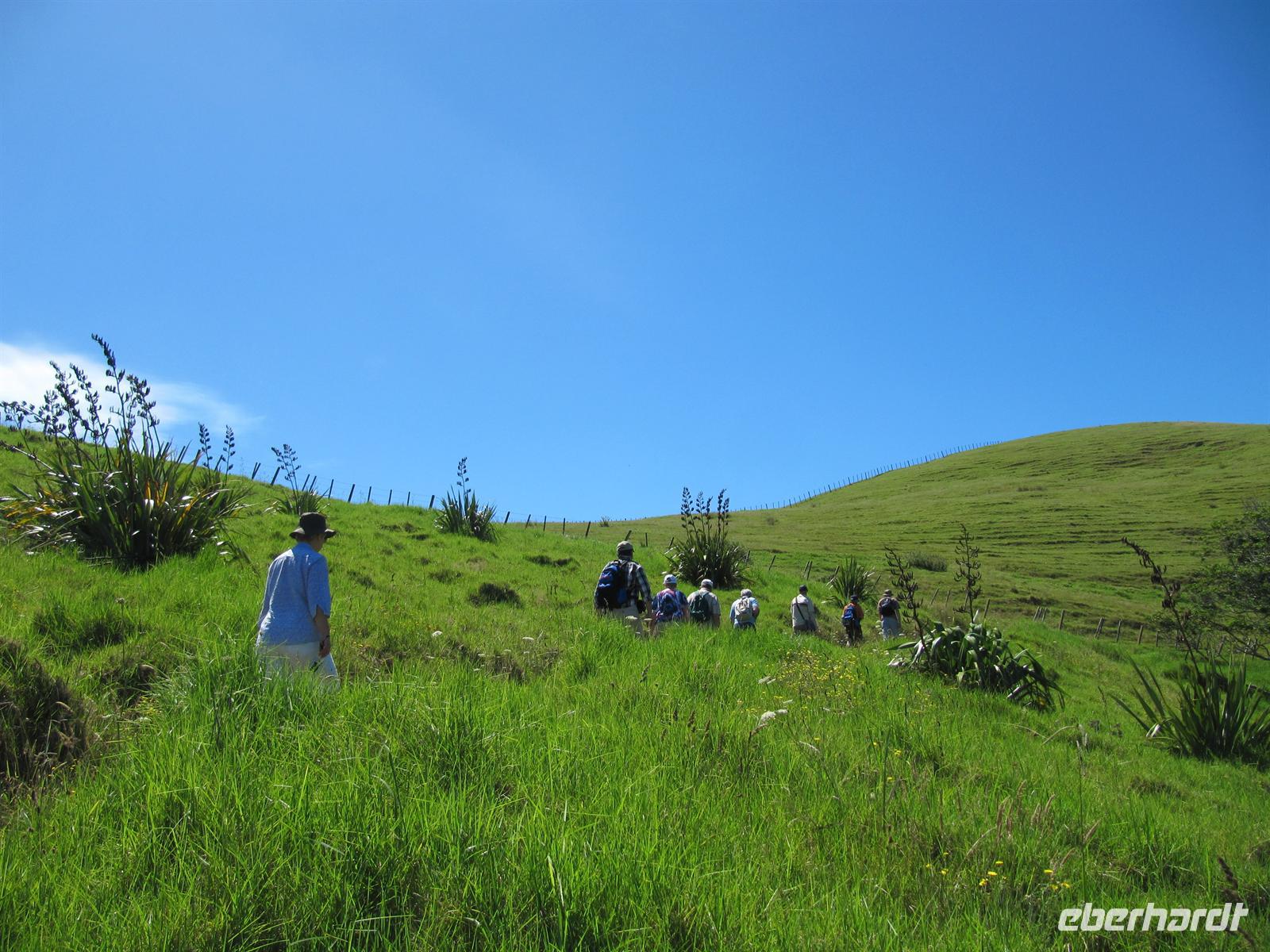Der ganze Tag ist der zauberhaften Halbinsel Coromandel gewidmet. Immerhin zählt sie zu den 3 schönsten Regionen der Nordinsel. Die Reise führt uns entlang der traumhaften Westküste. Hinter dem kleinen Städtchen Colville (nur 22 Häuser) beginnt die kurvige Schotterstraße. Die Straßen sind gesäumt von uralten, knorrigen, rot blühenden Pohutukawa-Bäumen - ein fantastischer Kontrast zum türkisblauen Wasser, dem strahlend blauen Himmel und den grünen Hügeln, auf denen glückliche Kühe weiden (sie müssen wohl glücklich sein an so einem herrlichen Fleckchen Erde!). An der Fletcher Bay beginnt unsere Wanderung über das hügelige Farmland - man meint die Wiesen seien mit einem Samtteppich überzogen. Immer wieder blitzen die roten Blüten des neuseeländischen Weihnachtsbaumes bis wir durch üppig grünen Wald abwärts gehen. Bernd zeigt uns unter anderem die einzige Palme Neuseelands, die Nikau-Palme, sowie essbare Schlingpflanzen, der „Supple Jack“. Nach 1,5 Stunden erreichen wir die Poley-Bucht, wo wir Rast machen: Zeit zum Muscheln sammeln, plaudern und zum Bestaunen der vulkanischen Felsformationen. Wir wandern zurück zum Ausgangspunkt und stellen fest, dass uns kaum jemand begegnet ist - ein echter Geheimtipp im „Niemandsland“! Wir können uns gar nicht satt sehen an der herrlichen Landschaft. Auf dem Rückweg zum Hotel stoppen wir auf einen Cappucino in Colville. Am Abend genießen wir wiederum Köstlichkeiten frisch vom Grill.
