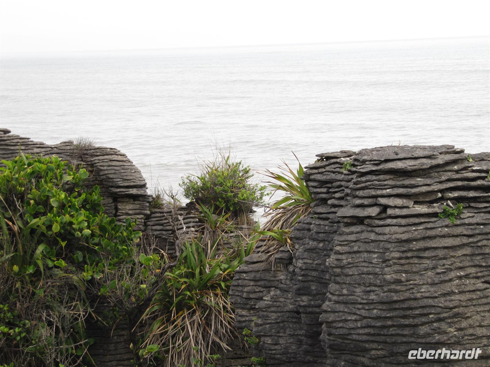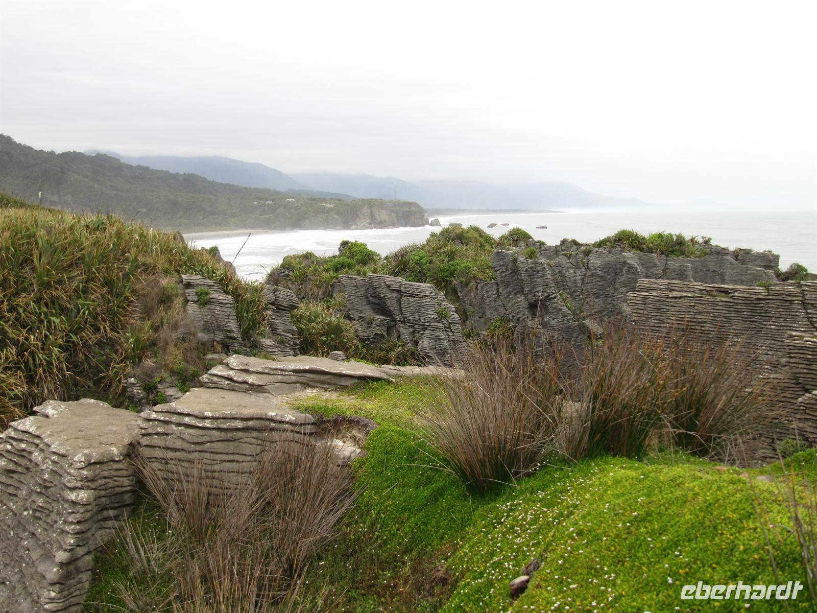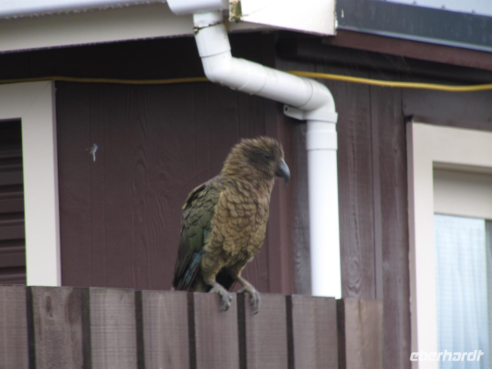 Nach so viel Wetterglück muss es ja mal regnen. Wir sind schließlich an der Westküste, der regenreichsten Region Neuseelands. Dennoch genießen wir einen Rundgang an den Pancake Rocks, den berühmten Pfannkuchenfelsen. Nach unserem Verständnis sollte man wohl eher Plinsen- oder Eierkuchenfelsen sagen . Es ist beeindruckend wie die Natur über die Dauer den Muschelkalk bearbeitet hat: Wind, Regen und das Meer zeichnen bizarre Felsformationen. Die tosende Tasman-See rauscht gegen die Küste, riesige Flachs-Büsche säumen den Weg und die Nikau-Palmen weisen auf ein besonders mildes Klima in dieser Region hin. Wir fahren weiter über Ross und Hokitika, wo wir besonders schöne und kunstvolle Jadearbeiten (Neuseeländisch: Pounamu) bestaunen, in den Westland Nationalpark. Den Franz-Josef-Gletscher können wir wegen des Regens leider nicht sehen. Im Besucherzentrum im gleichnamigen Ort bekommen wir wenigstens theoretisch einen Eindruck von den eisigen Nachbarn. In Fox beziehen wir unser Motel und fahren zum Abendessen in das Lake Matheson Café mit einem fantastischen Panorama auf die (wolkenverhangene) Landschaft. Es hat etwas Mystisches… Wir drücken die Daumen für einen sonnigen nächsten Tag, um den Gletscherflug zu unternehmen. Am Abend bekommen wir überraschenden Besuch von einem Prachtexemplar von Kea, dem einzigen Bergpapagei der Welt!