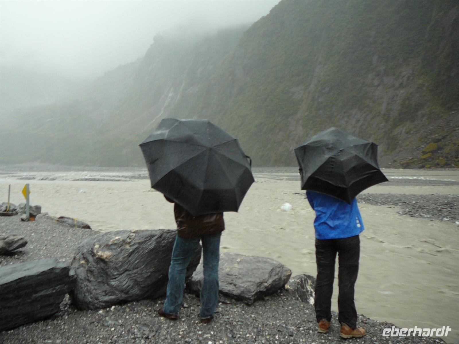 Es heißt ja nicht umsonst Regenwald… am Morgen regnet es Bindfäden, wie so oft an der Westküste. Unser Helikopterflug zum Gletscher muss daher leider heute entfallen. Wir wagen trotz des starken Regens einen Abstecher zum Fox Gletscher. Im Nebel erspähen wir zumindest die Gletscherzunge. Auf unserer Weiterfahrt erfahren wir viel Wissenswertes über das neuseeländische Schulsystem. Am Strand von Ships Creek lässt der Regen nach und wir wagen einen kurzen Spaziergang an die wilde Tasman-See. Im Visitor Center von Haast erhalten wir einen Eindruck von der Region, die uns durch tief hängende Wolken leider kein Panorama bietet. Die Route führt über die „Straße der Wasserfälle“, die ihrem Namen heute alle Ehre macht, bis wir den Haast-Pass überqueren. Die Wassermassen haben den Haast River in einen reißenden Strom verwandelt. Wir verabschieden uns vom Regenwald und sehen nun Südbuchenwald. Im Makarora-Tal legen wir unsere Mittagspause ein und prompt ändert sich das Wetter.