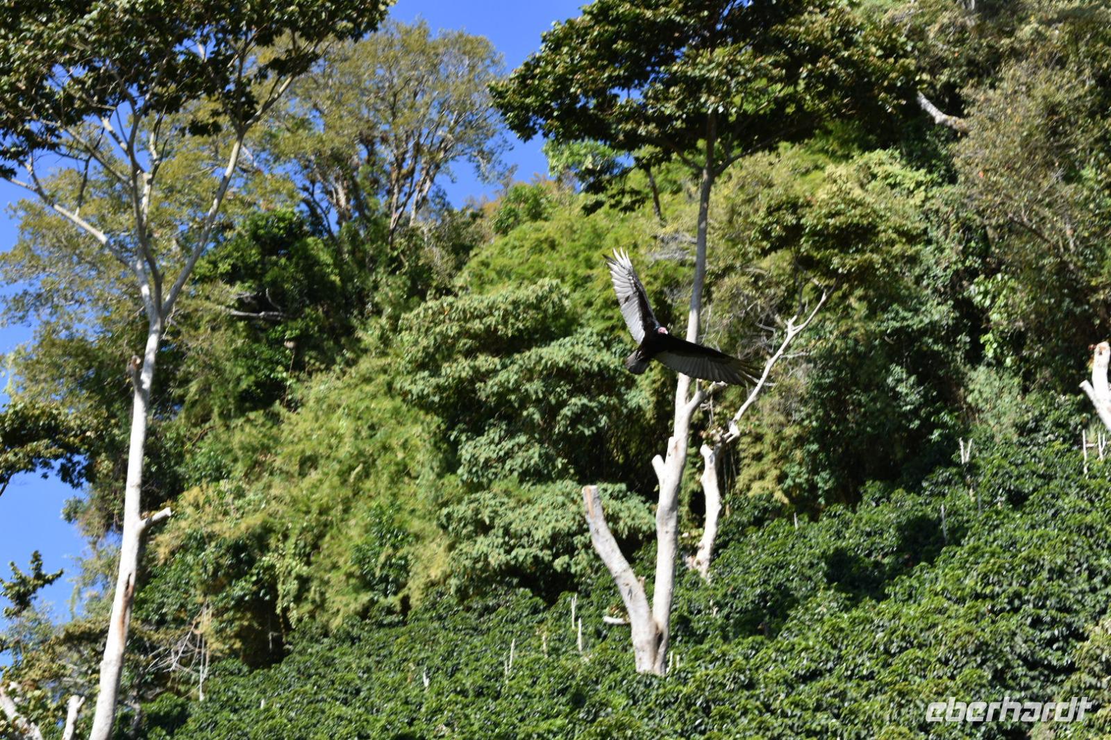 Wir wurden von einem Pick-Up abgeholt und fuhren den Berg hinauf. Dort gab es erstmal ein kühles Bier, beziehungsweise eine Tasse Kaffee. Das Panorama war unbeschreiblich schön und die roten Aras zeigten sich auch noch einmal.