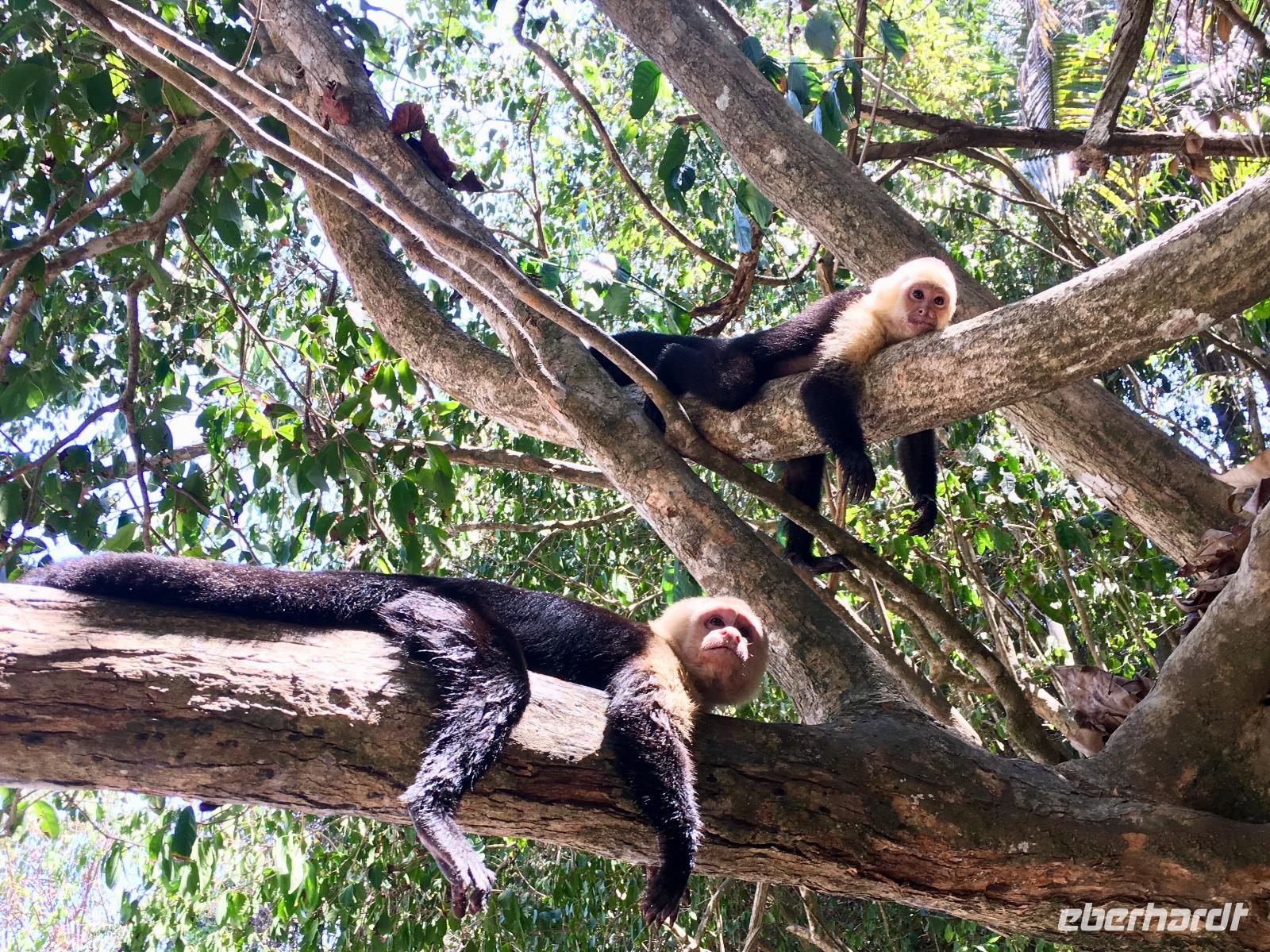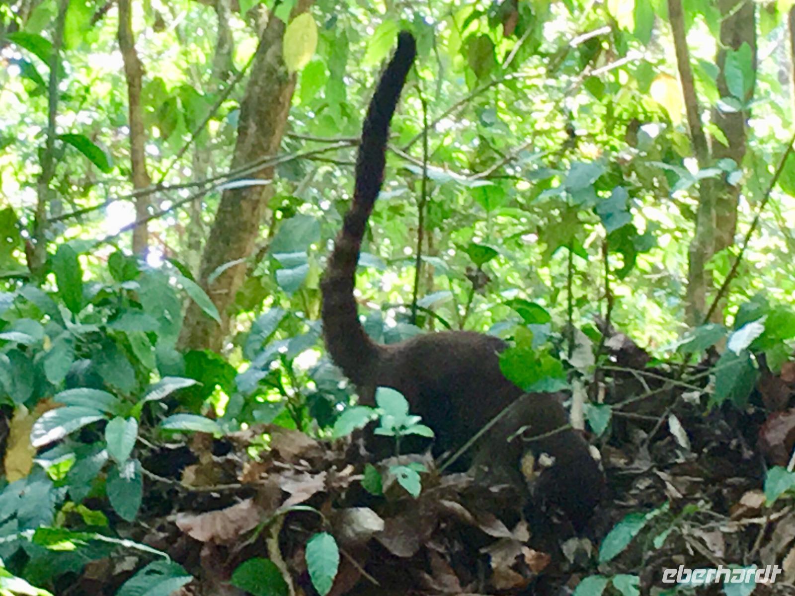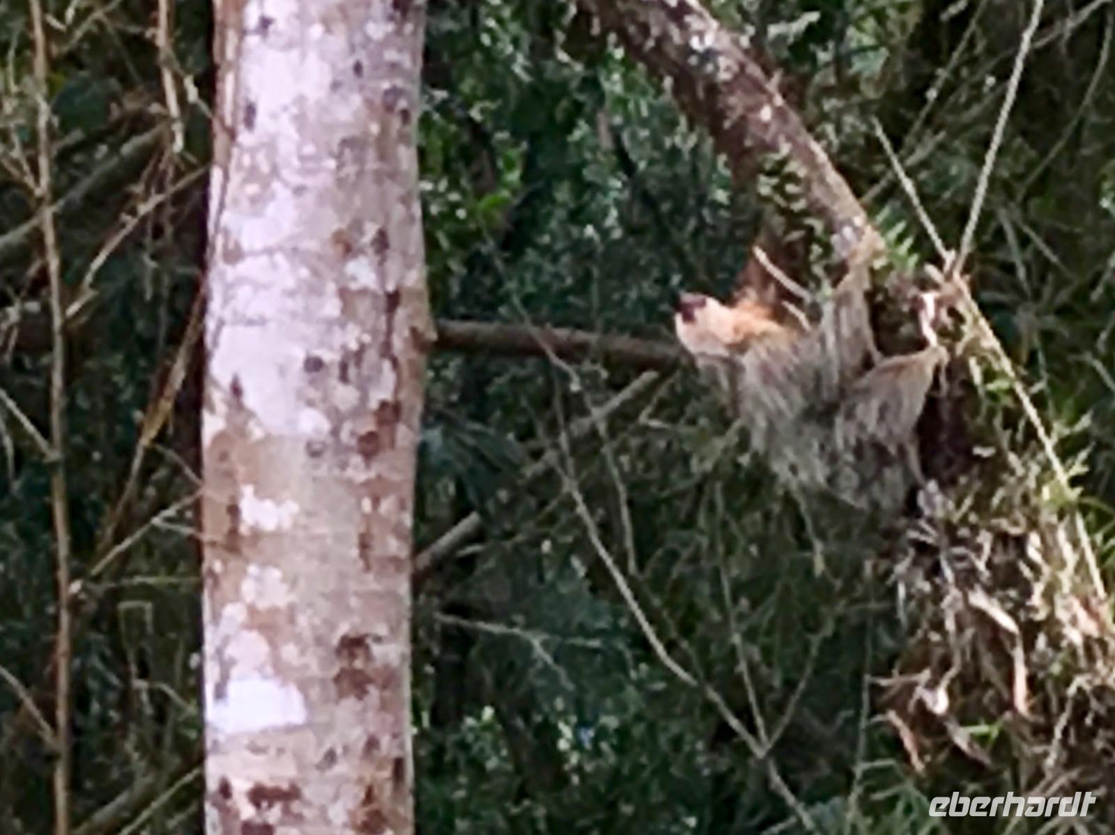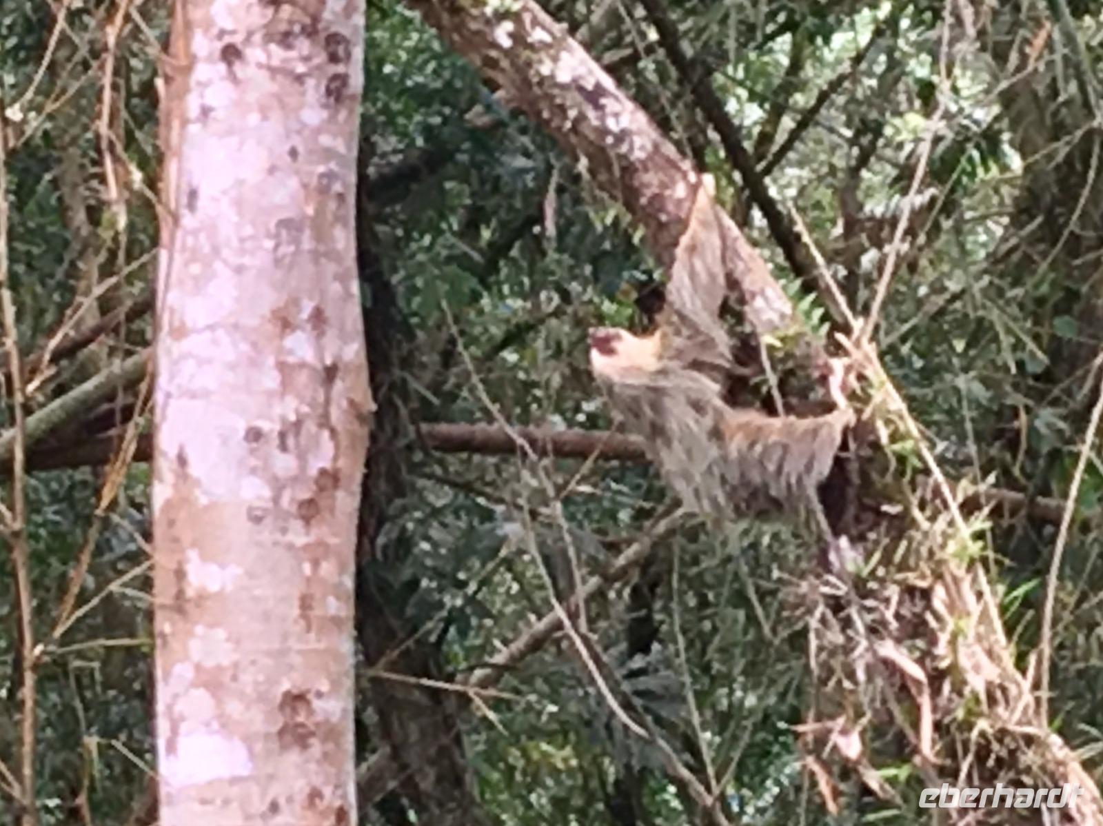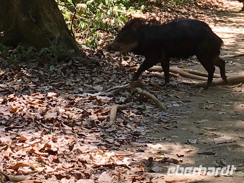 Nun gehen wir auf dem Sandweg und sehen allerhand innert kuerzester Zeit. Eigentlich waeren die Toiletten bloss 20 Minuten entfernt aber wir sehen sie erst nach 1 Stunde, denn die Waldbewohner meinen es sehr gut mit uns. Aeffchen schwingen von Baum zu Baum. Einige Klammeraffen zuechtigen gerade die Jungmanschaft, andere saeugen und wieder andere liegen auf den Aesten mit allen vieren von sich gestreckt. Auch die Vogelliebhaber kommen wieder auf ihre Rechnung. Bobbies und Kormorane sitzen auf den Felsen waehrend der Hinreise und danach zeigen sich verschiedene Mot-mot, Papagaien, Guane, Reiher usw von der besten Seite. Ameisen aller Arten tragen fleissig Blaetter oder Waldabfall zu ihren Haufen, Echsen tarnen sich und Wildschweine rennen gerade ueber „ unseren" Weg. Oder gehen wir eher auf ihrem Weg ? Wir sehen auch ein Nasenbaer ganz hautnah und dann noch einen hungrigen und einen schlafenden Tapir. Der hungrige wollte genau wie wir, in der Lodge inmitten des Parks mal kurz Mittagessen. Aber es waren schon zu viele Eberhardt Gaeste dort es gab nichts mehr fuer ihn....Wir machen auch mal eine kurze Rast bei einem kleinen Strand. Wir muessen wieder neue Energie tanken fuer den Weg zurueck zum grossen Strand und unserem Boot. Das war ein aufregender und wunderbarer Ausflug. Steven und Manuel, unsere Guides werden auch reichlich belohnt denn mit ihren professionellen Spectoscope haben sie uns allen auch die besten Photos durch die Linse ermoeglicht und durch ihre Leidenschaft fuer diese Gegend haben wir ins Waldleben des Corcovado Parks einsicht erhalten. Mit vielen Eindruecken sitzen wir am Nachmittag gemuetlich am Meer beim Pool mit einer Cerveza in der Hand und reden noch lange von diesem herrlichen Ausflug. Keiner will Kayak fahren gehen also ist der Nachmittag frei. Das Abendessen um 18:30 ist wieder hervorragend. Pura Vida, meine Freunde, morgen gehts weiter mit einem Schnorchel-Ausflug.