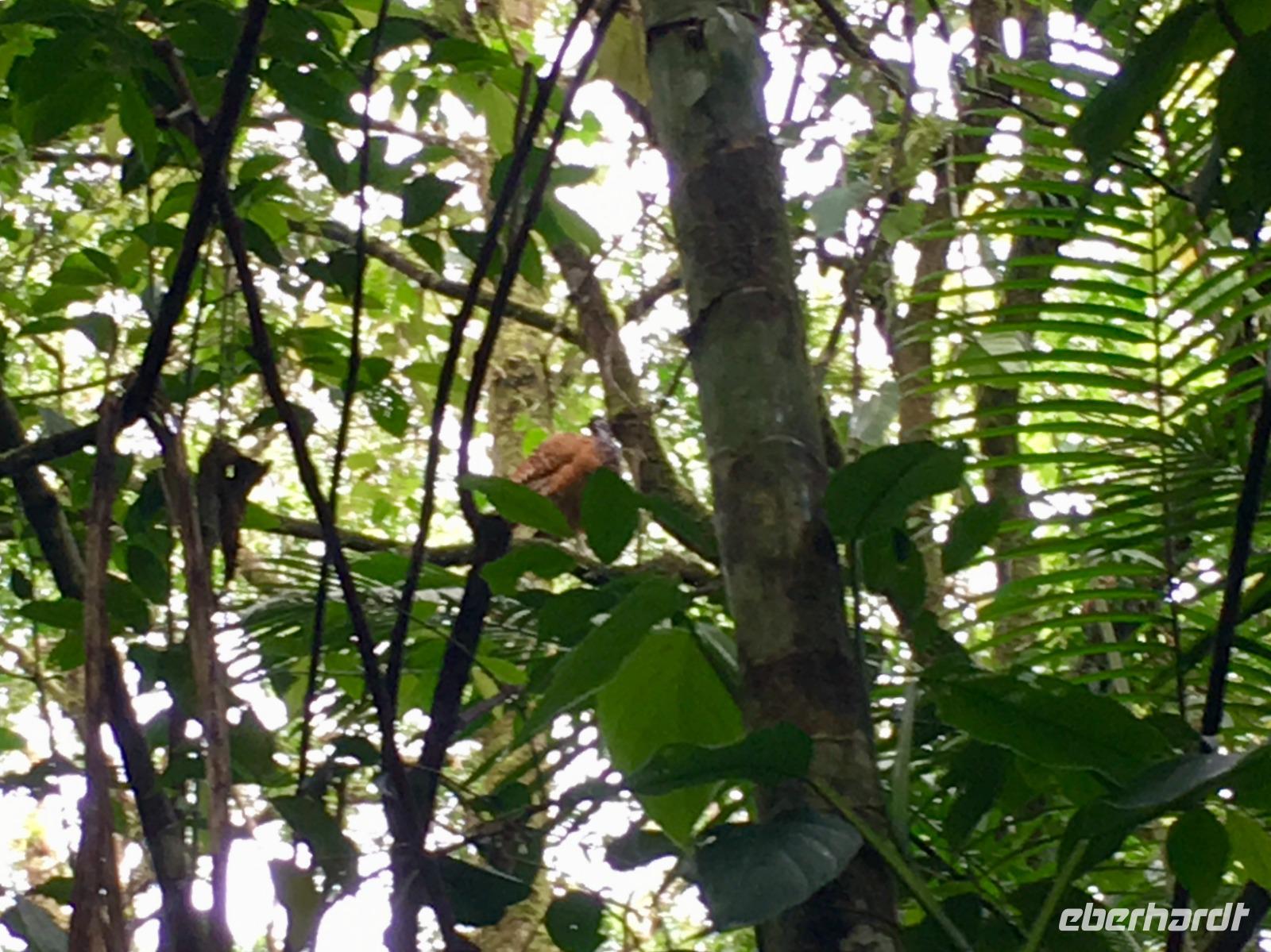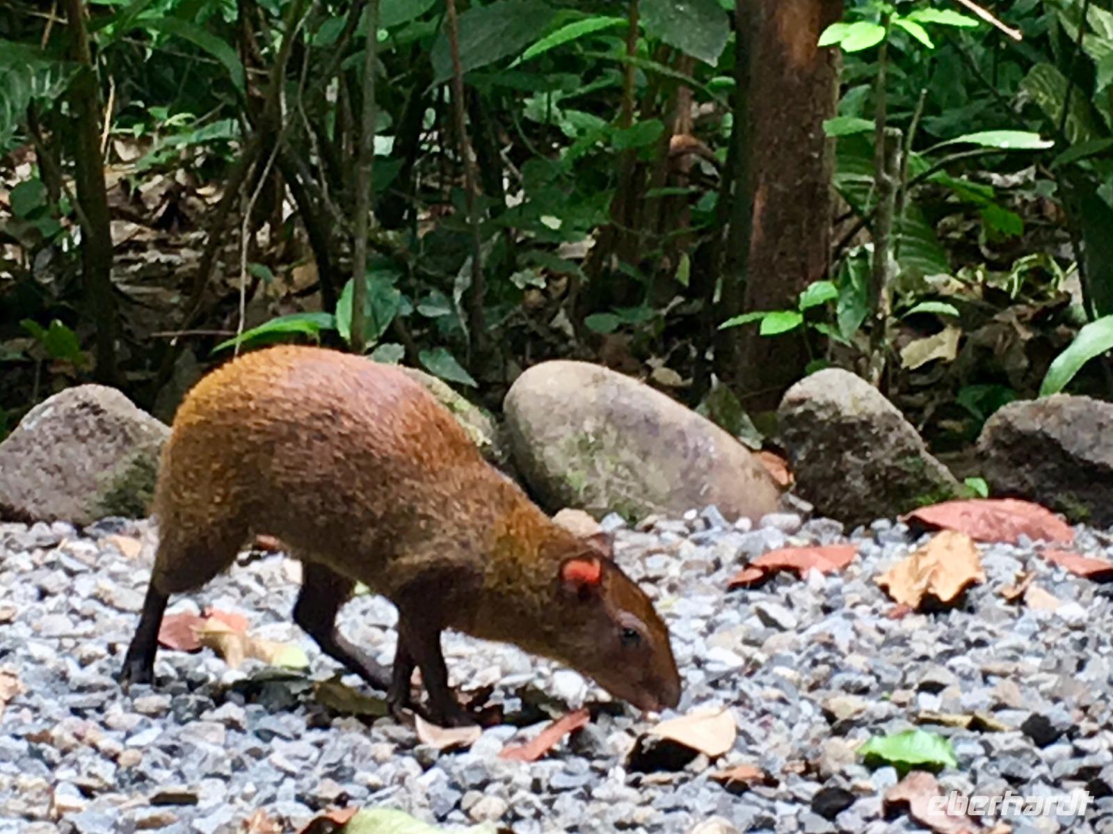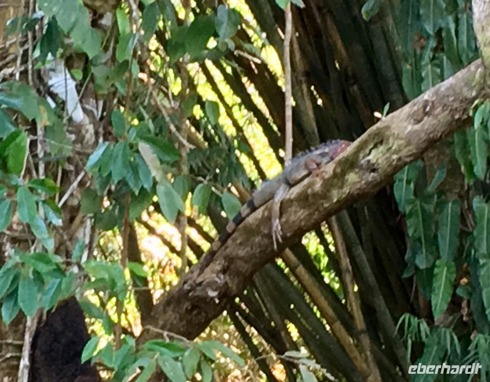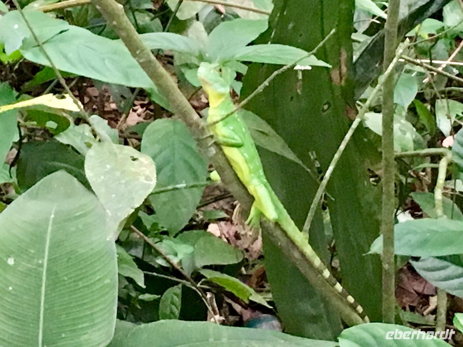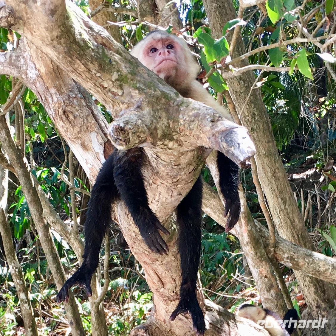 Nun gehen wir auf dem Sandweg und sehen allerhand innert kuerzester Zeit. Eigentlich waeren die Toiletten bloss 20 Minuten entfernt aber wir sehen sie erst nach 1 Stunde, denn die Waldbewohner meinen es sehr gut mit uns. Aeffchen schwingen von Baum zu Baum. Einige Klammeraffen zuechtigen gerade die Jungmanschaft, andere saeugen und wieder andere liegen auf den Aesten mit allen vieren von sich gestreckt. Auch die Vogelliebhaber kommen wieder auf ihre Rechnung. Bobbies und Kormorane sitzen auf den Felsen waehrend der Hinreise und danach zeigen sich verschiedene Mot-mot, Papagaien, Guane, Reiher usw von der besten Seite. Ameisen aller Arten tragen fleissig Blaetter oder Waldabfall zu ihren Haufen, Echsen tarnen sich und Wildschweine rennen gerade ueber „ unseren" Weg. Oder gehen wir eher auf ihrem Weg ? Wir sehen auch ein Nasenbaer ganz hautnah und dann noch einen hungrigen und einen schlafenden Tapir. Der hungrige wollte genau wie wir, in der Lodge inmitten des Parks mal kurz Mittagessen. Aber es waren schon zu viele Eberhardt Gaeste dort es gab nichts mehr fuer ihn....Wir machen auch mal eine kurze Rast bei einem kleinen Strand. Wir muessen wieder neue Energie tanken fuer den Weg zurueck zum grossen Strand und unserem Boot. Das war ein aufregender und wunderbarer Ausflug. Steven und Manuel, unsere Guides werden auch reichlich belohnt denn mit ihren professionellen Spectoscope haben sie uns allen auch die besten Photos durch die Linse ermoeglicht und durch ihre Leidenschaft fuer diese Gegend haben wir ins Waldleben des Corcovado Parks einsicht erhalten. Mit vielen Eindruecken sitzen wir am Nachmittag gemuetlich am Meer beim Pool mit einer Cerveza in der Hand und reden noch lange von diesem herrlichen Ausflug. Keiner will Kayak fahren gehen also ist der Nachmittag frei. Das Abendessen um 18:30 ist wieder hervorragend. Pura Vida, meine Freunde, morgen gehts weiter mit einem Schnorchel-Ausflug.