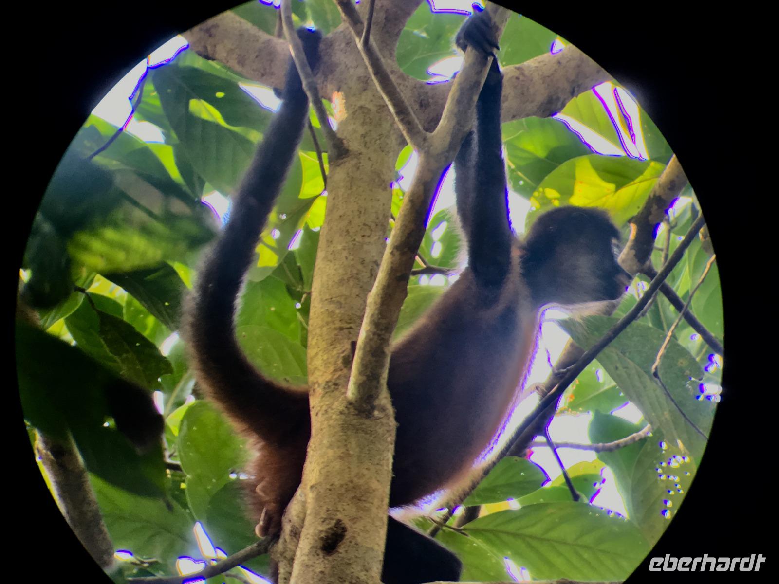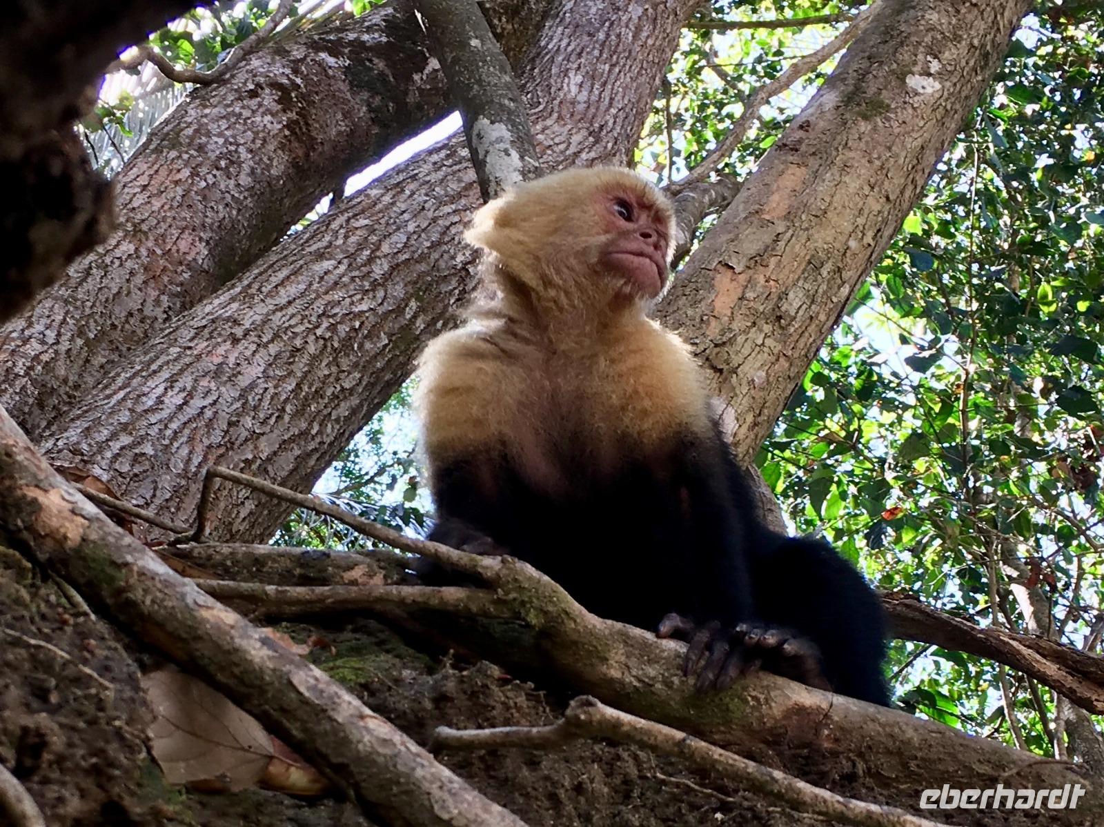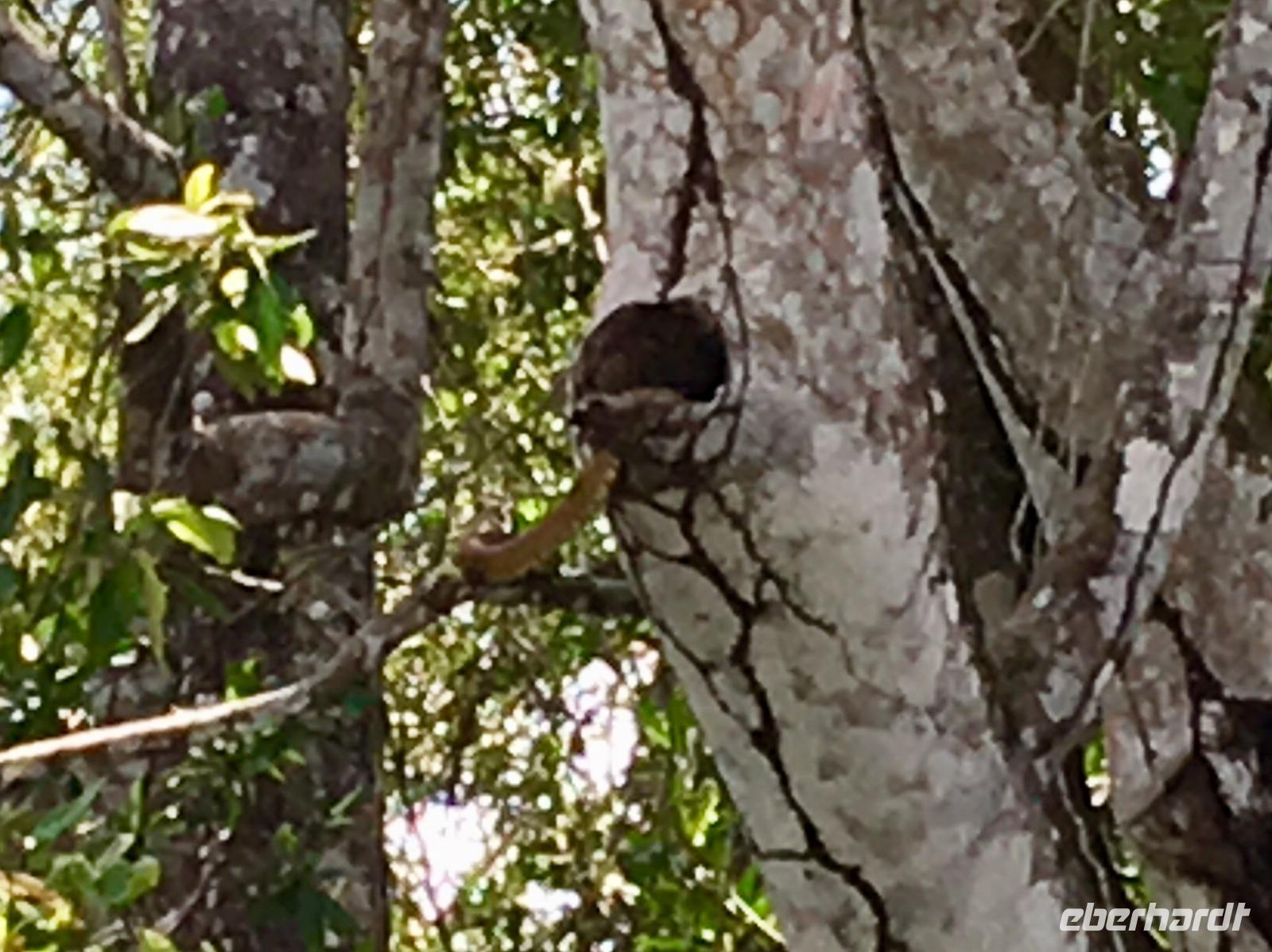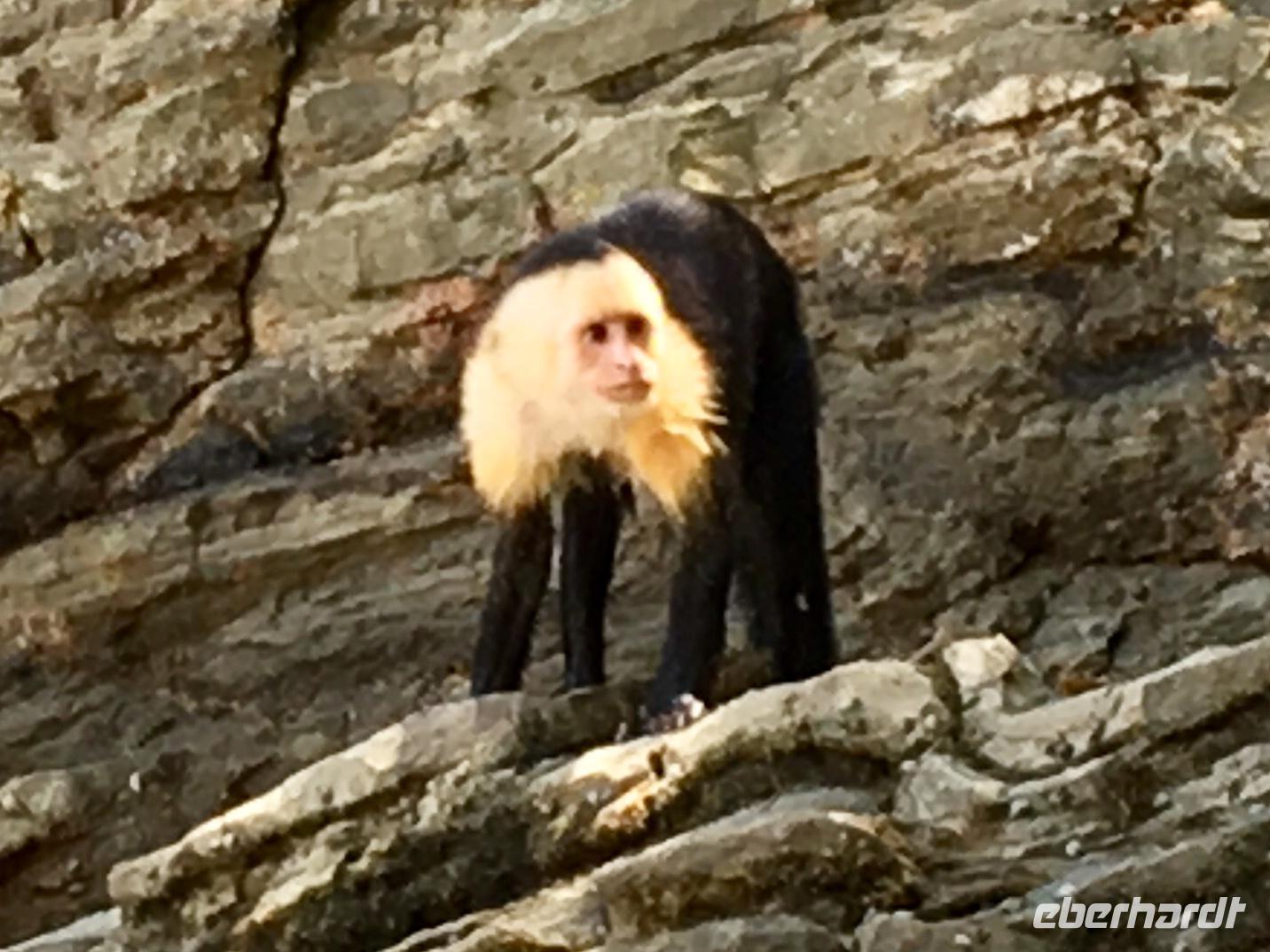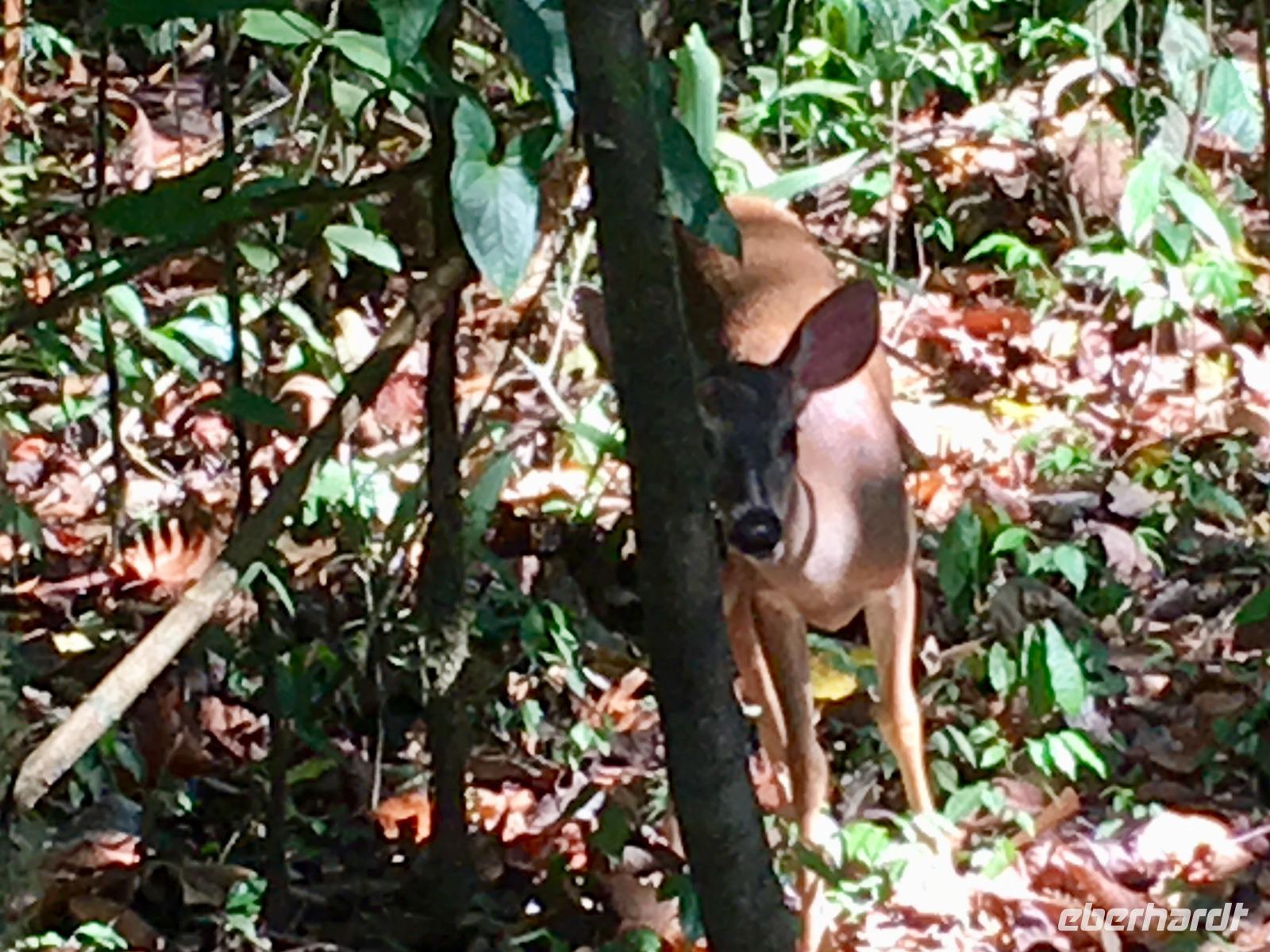 Nun gehen wir auf dem Sandweg und sehen allerhand innert kuerzester Zeit. Eigentlich waeren die Toiletten bloss 20 Minuten entfernt aber wir sehen sie erst nach 1 Stunde, denn die Waldbewohner meinen es sehr gut mit uns. Aeffchen schwingen von Baum zu Baum. Einige Klammeraffen zuechtigen gerade die Jungmanschaft, andere saeugen und wieder andere liegen auf den Aesten mit allen vieren von sich gestreckt. Auch die Vogelliebhaber kommen wieder auf ihre Rechnung. Bobbies und Kormorane sitzen auf den Felsen waehrend der Hinreise und danach zeigen sich verschiedene Mot-mot, Papagaien, Guane, Reiher usw von der besten Seite. Ameisen aller Arten tragen fleissig Blaetter oder Waldabfall zu ihren Haufen, Echsen tarnen sich und Wildschweine rennen gerade ueber „ unseren" Weg. Oder gehen wir eher auf ihrem Weg ? Wir sehen auch ein Nasenbaer ganz hautnah und dann noch einen hungrigen und einen schlafenden Tapir. Der hungrige wollte genau wie wir, in der Lodge inmitten des Parks mal kurz Mittagessen. Aber es waren schon zu viele Eberhardt Gaeste dort es gab nichts mehr fuer ihn....Wir machen auch mal eine kurze Rast bei einem kleinen Strand. Wir muessen wieder neue Energie tanken fuer den Weg zurueck zum grossen Strand und unserem Boot. Das war ein aufregender und wunderbarer Ausflug. Steven und Manuel, unsere Guides werden auch reichlich belohnt denn mit ihren professionellen Spectoscope haben sie uns allen auch die besten Photos durch die Linse ermoeglicht und durch ihre Leidenschaft fuer diese Gegend haben wir ins Waldleben des Corcovado Parks einsicht erhalten. Mit vielen Eindruecken sitzen wir am Nachmittag gemuetlich am Meer beim Pool mit einer Cerveza in der Hand und reden noch lange von diesem herrlichen Ausflug. Keiner will Kayak fahren gehen also ist der Nachmittag frei. Das Abendessen um 18:30 ist wieder hervorragend. Pura Vida, meine Freunde, morgen gehts weiter mit einem Schnorchel-Ausflug.