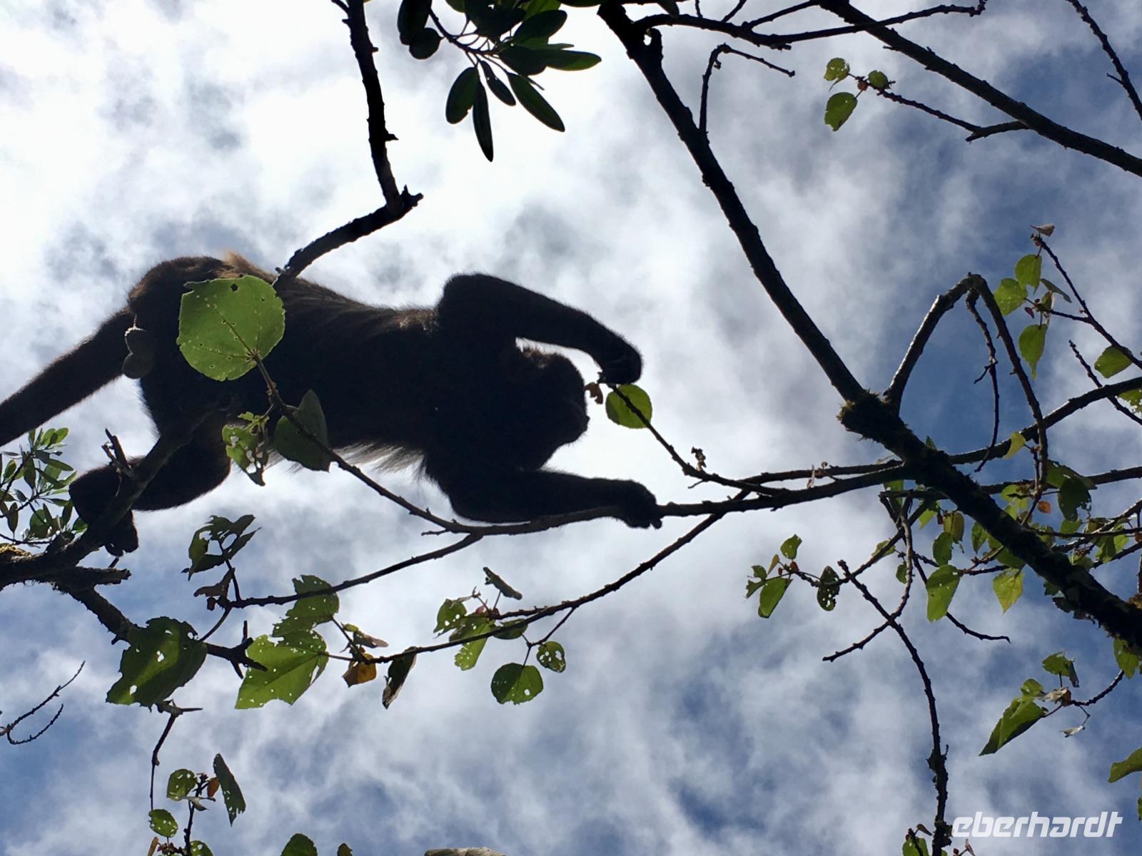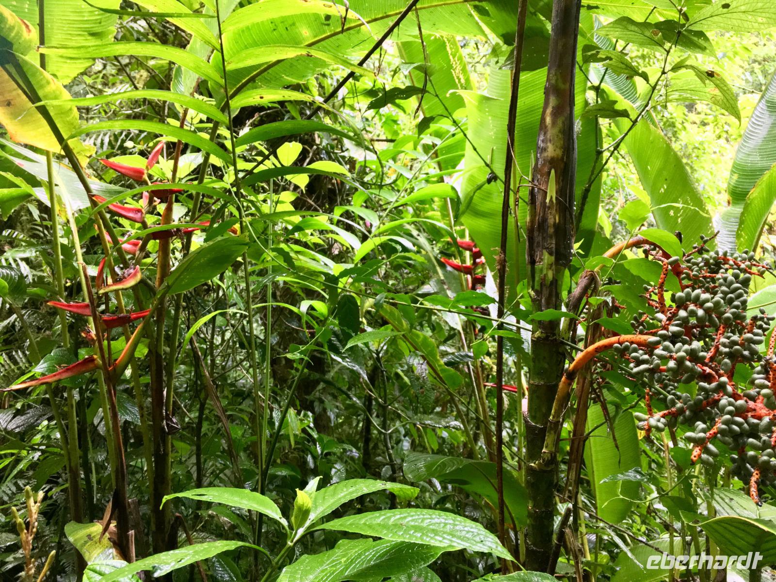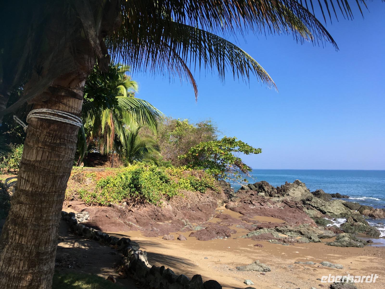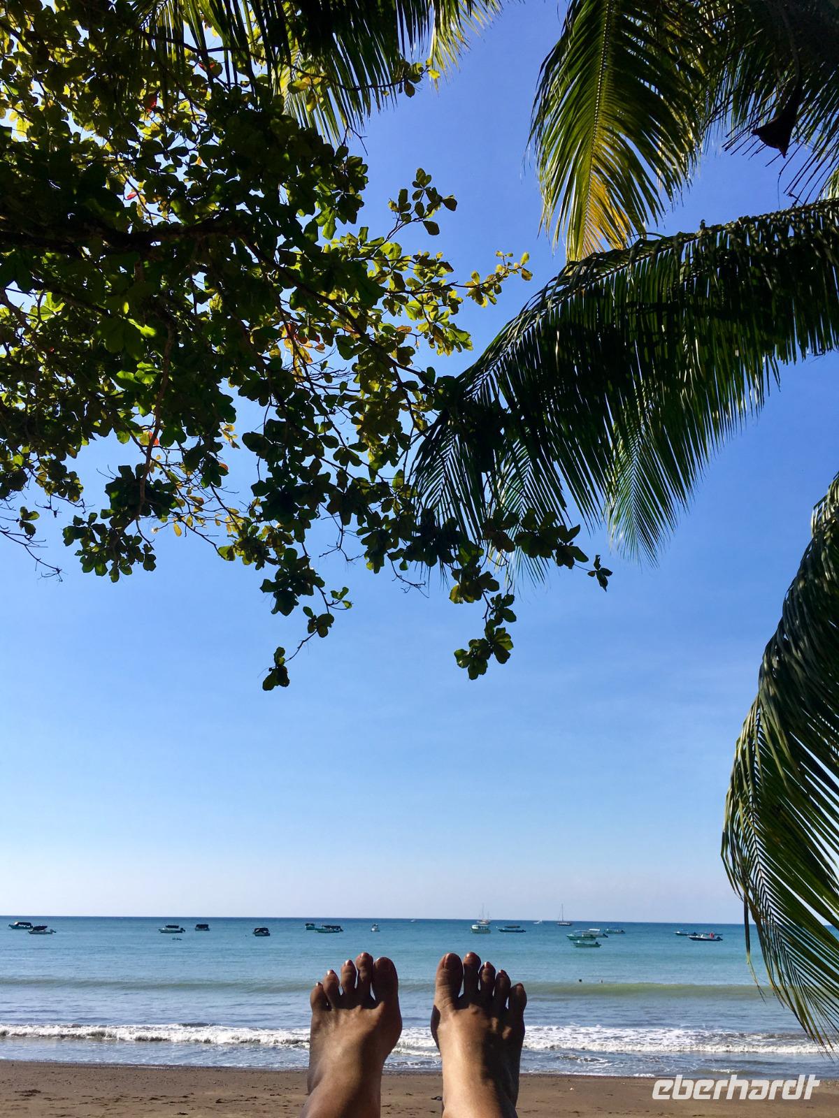 Nun gehen wir auf dem Sandweg und sehen allerhand innert kuerzester Zeit. Eigentlich waeren die Toiletten bloss 20 Minuten entfernt aber wir sehen sie erst nach 1 Stunde, denn die Waldbewohner meinen es sehr gut mit uns. Aeffchen schwingen von Baum zu Baum. Einige Klammeraffen zuechtigen gerade die Jungmanschaft, andere saeugen und wieder andere liegen auf den Aesten mit allen vieren von sich gestreckt. Auch die Vogelliebhaber kommen wieder auf ihre Rechnung. Bobbies und Kormorane sitzen auf den Felsen waehrend der Hinreise und danach zeigen sich verschiedene Mot-mot, Papagaien, Guane, Reiher usw von der besten Seite. Ameisen aller Arten tragen fleissig Blaetter oder Waldabfall zu ihren Haufen, Echsen tarnen sich und Wildschweine rennen gerade ueber „ unseren" Weg. Oder gehen wir eher auf ihrem Weg ? Wir sehen auch ein Nasenbaer ganz hautnah und dann noch einen hungrigen und einen schlafenden Tapir. Der hungrige wollte genau wie wir, in der Lodge inmitten des Parks mal kurz Mittagessen. Aber es waren schon zu viele Eberhardt Gaeste dort es gab nichts mehr fuer ihn....Wir machen auch mal eine kurze Rast bei einem kleinen Strand. Wir muessen wieder neue Energie tanken fuer den Weg zurueck zum grossen Strand und unserem Boot. Das war ein aufregender und wunderbarer Ausflug. Steven und Manuel, unsere Guides werden auch reichlich belohnt denn mit ihren professionellen Spectoscope haben sie uns allen auch die besten Photos durch die Linse ermoeglicht und durch ihre Leidenschaft fuer diese Gegend haben wir ins Waldleben des Corcovado Parks einsicht erhalten. Mit vielen Eindruecken sitzen wir am Nachmittag gemuetlich am Meer beim Pool mit einer Cerveza in der Hand und reden noch lange von diesem herrlichen Ausflug. Keiner will Kayak fahren gehen also ist der Nachmittag frei. Das Abendessen um 18:30 ist wieder hervorragend. Pura Vida, meine Freunde, morgen gehts weiter mit einem Schnorchel-Ausflug.