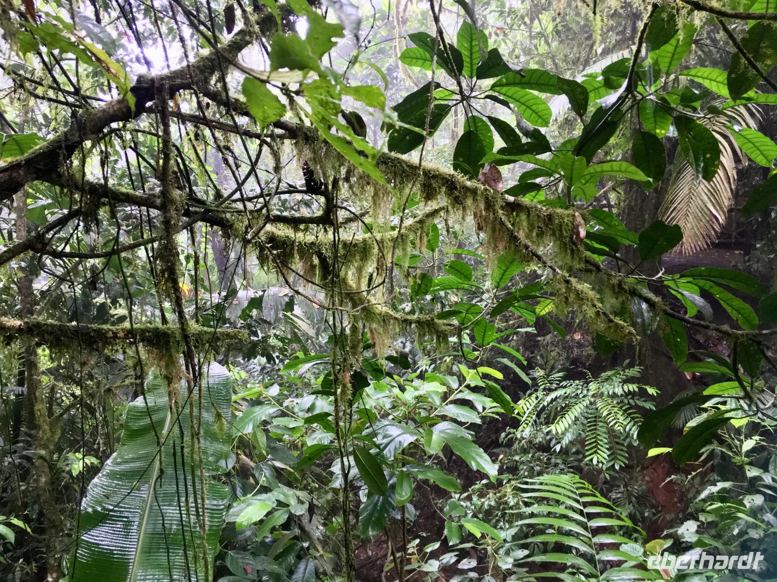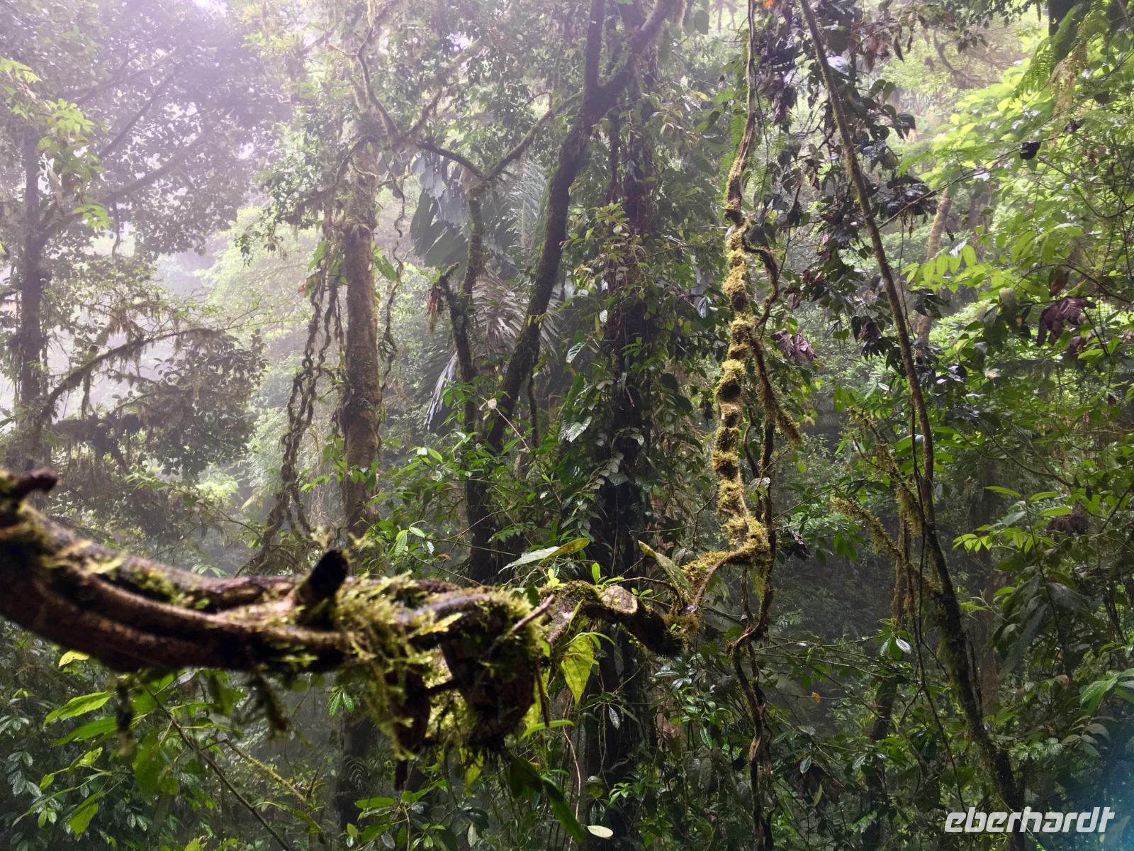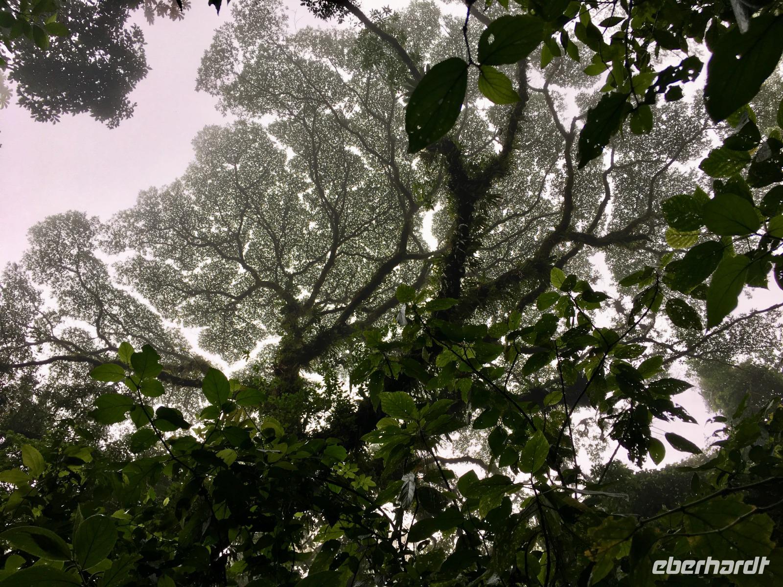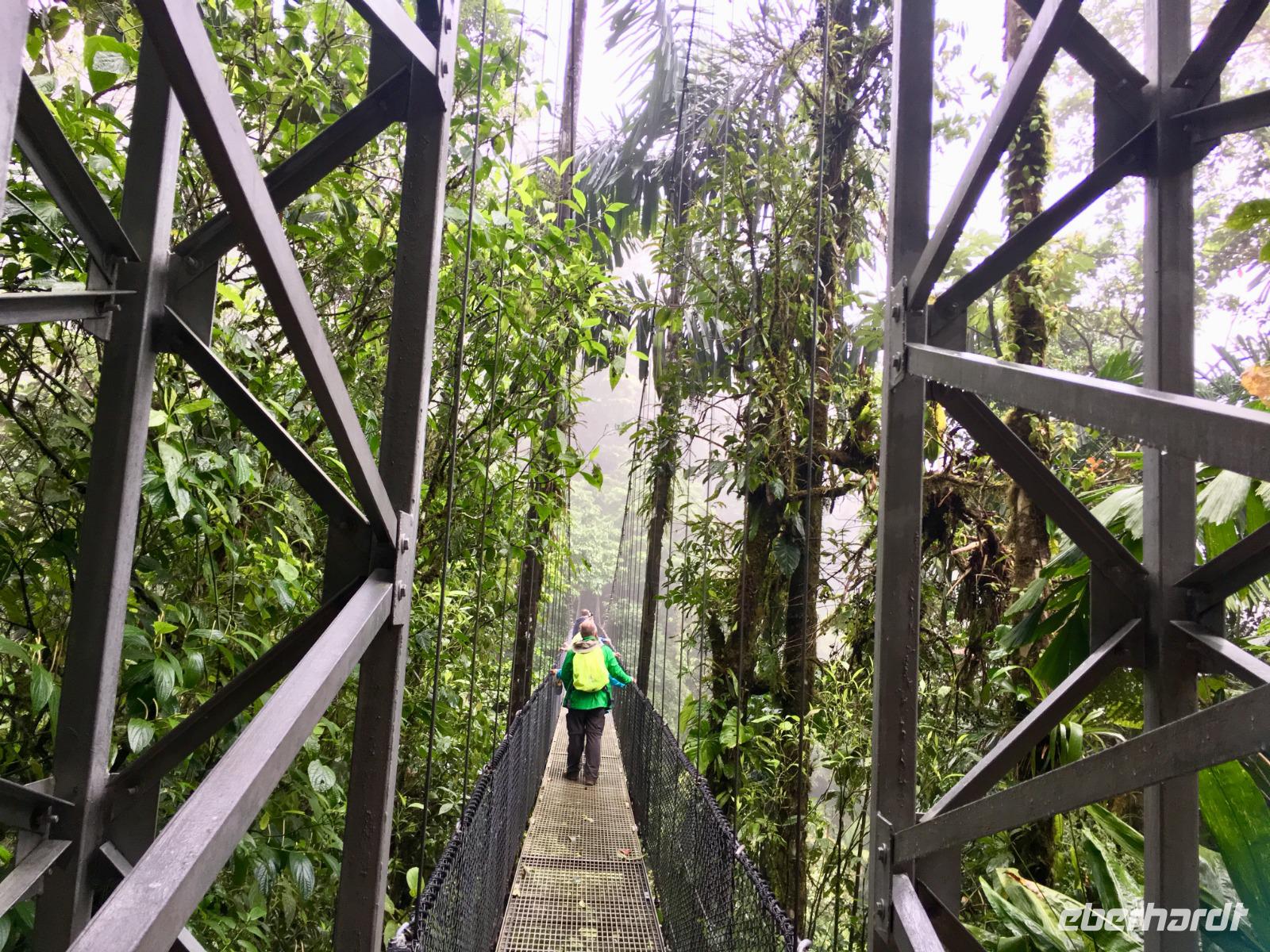 Heute wollen wir wieder frueh unterwegs sein, denn es erwartet uns ein besonders schoener, erlebnisreicher Tag. Vorerst fahren wir in ein Biologisches Reservat in Monteverde. Schoen angelegte Pfade, fuehren einem durch den Nebelwald. Er ist ganz anders als der Regenwald von gestern am Arenal. Dort gab es so viele verschiedene Palmen und er war sehr dicht, wobei hier mehr Baum-Vielfalt besteht was natuerlich wieder verschiedene Voegel und Tiere anzieht.